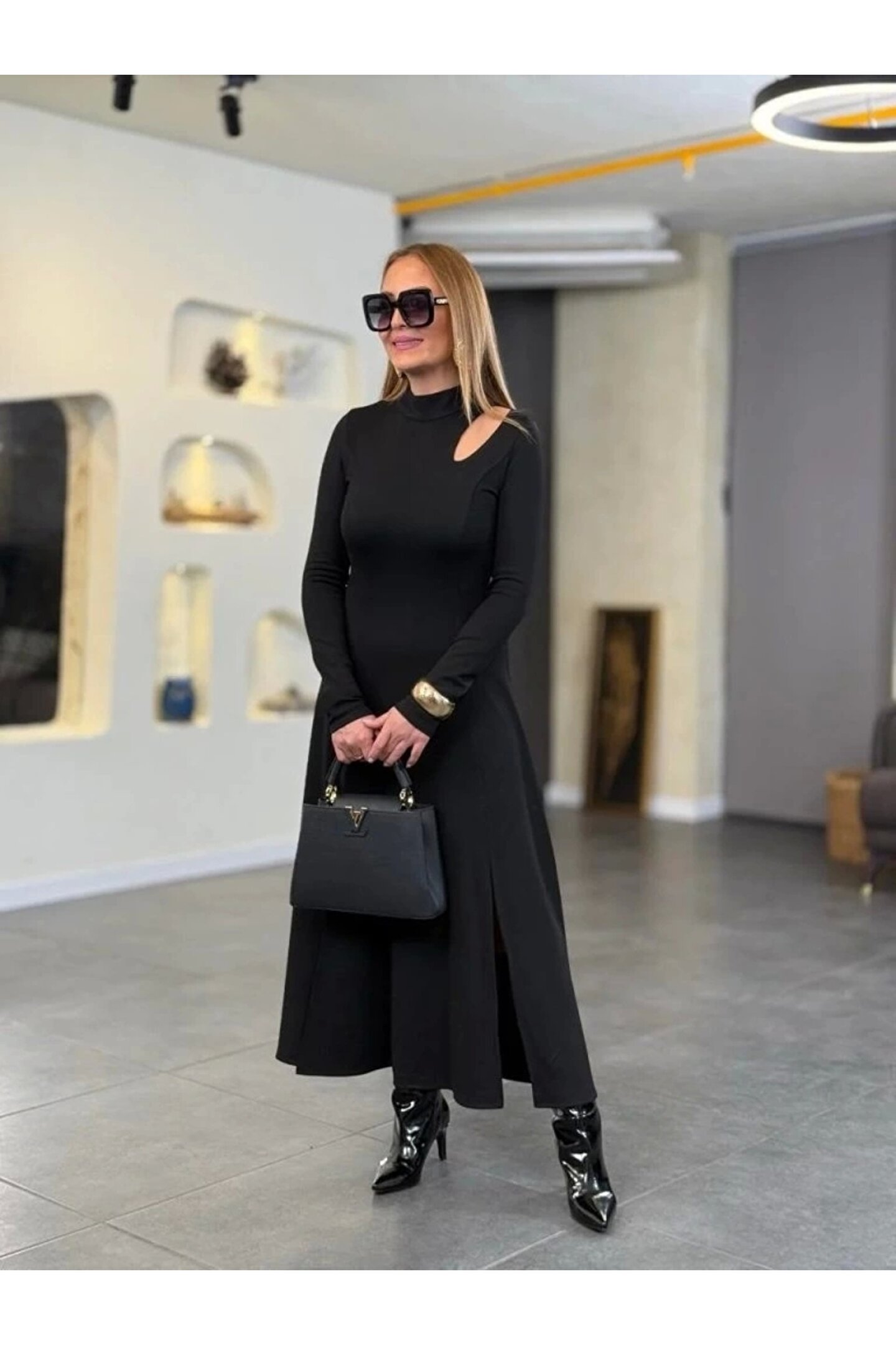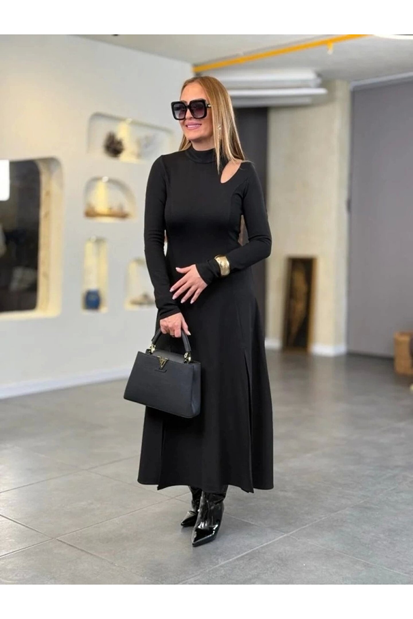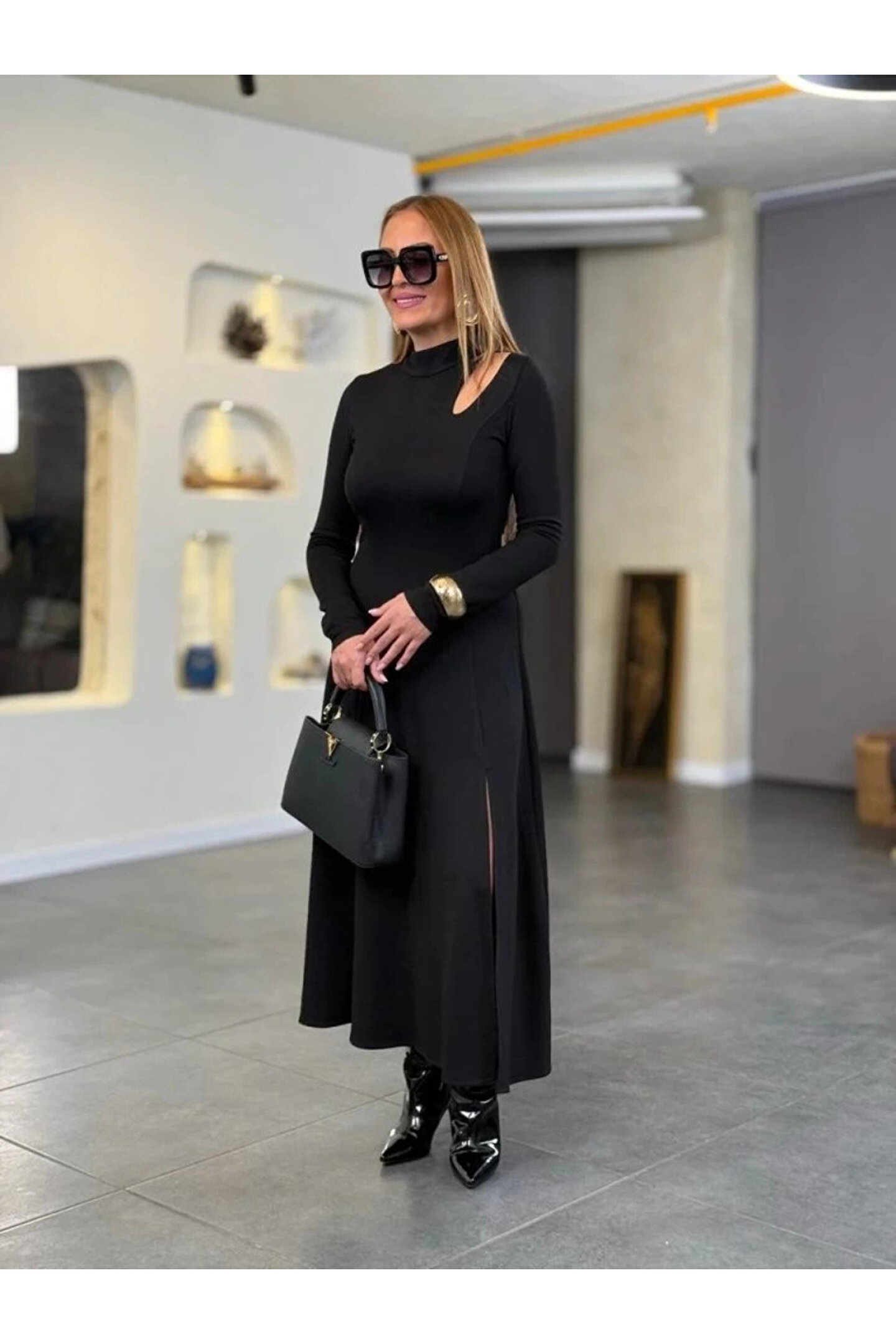 Kadın Balıkçı Yaka Damla Detaylı Yırtmaçlı Uzun Viskon Iki Iplik Maxi Elbise
