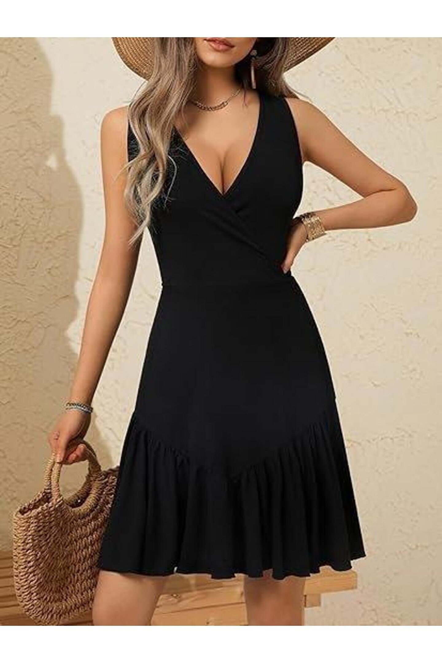 EYCAWEAR Kadın Askılı Kruvaze Yakalı Fırfırlı Janjan Krep Elbise