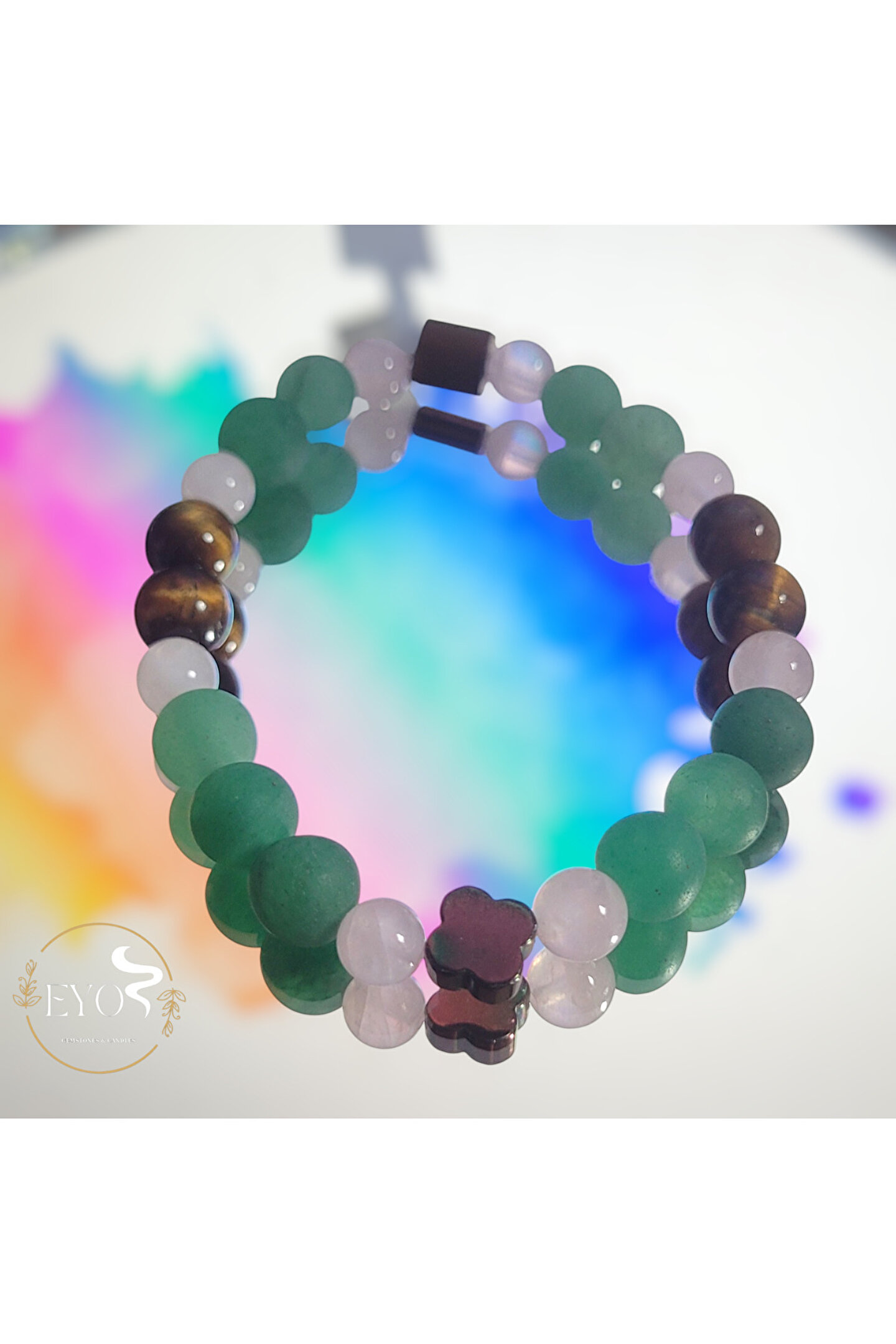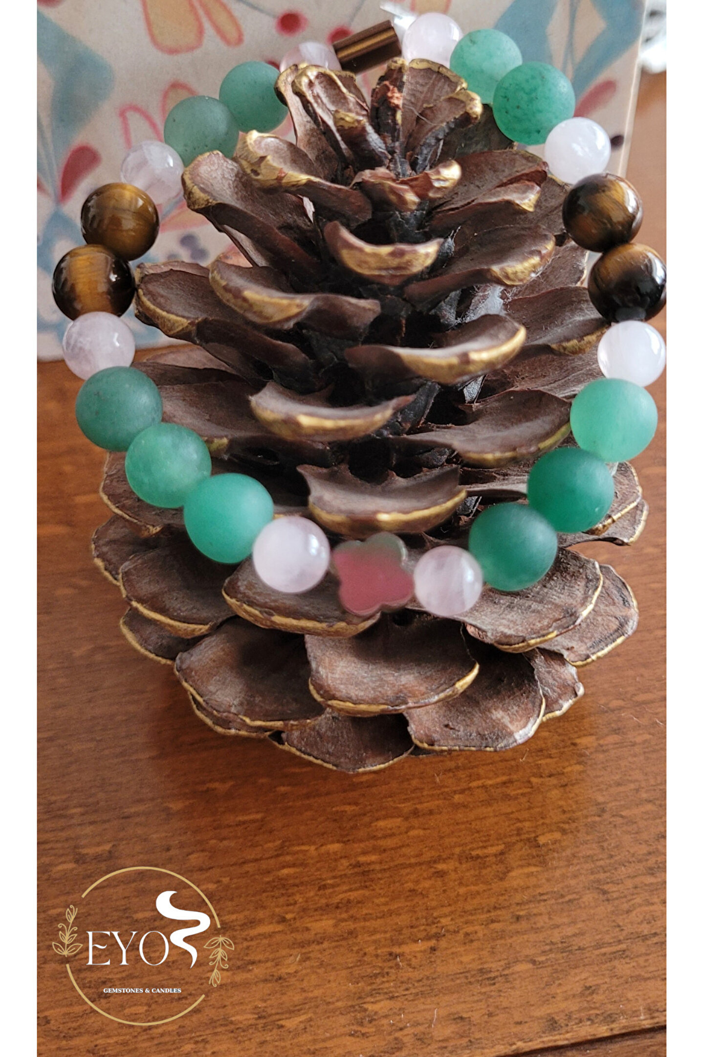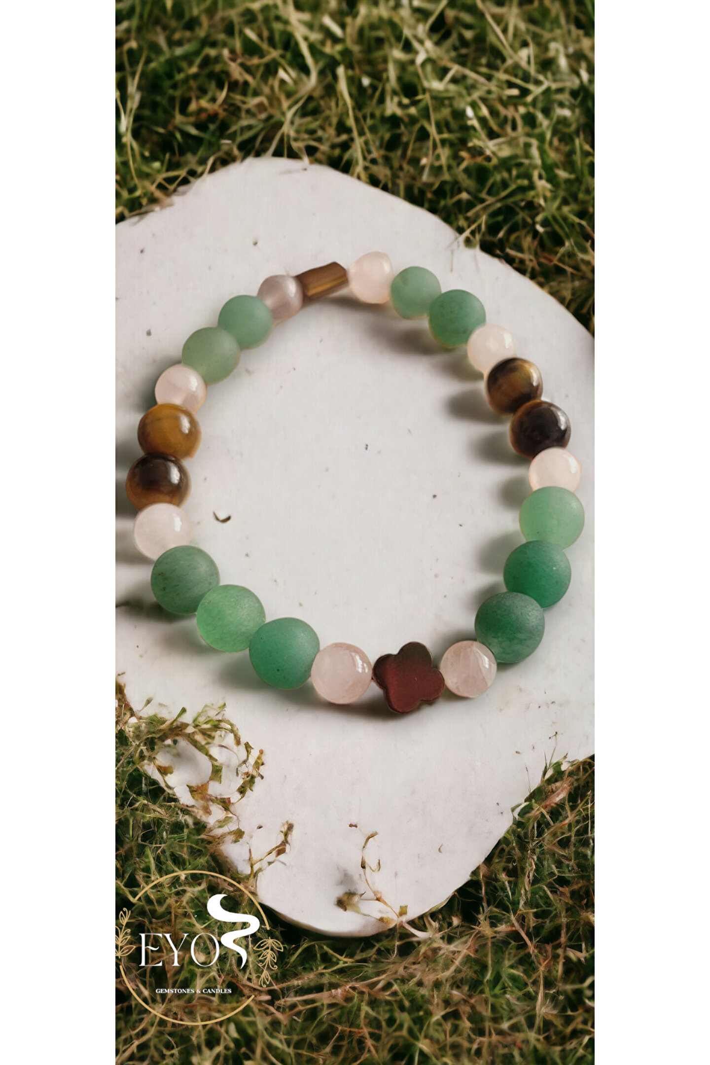 Boğa burcunun gücünü ve enerjisini yansıtan doğal taşlardan ilham alan bu özel bileklik, Aventurin, Kaplangözü ve Pembe Kuvars taşlarıyla özenle tasarlanmıştır. ; Elastik misina kullanılarak elle hazırlanan bu benzersiz bileklikte kullanılan doğal taşlar, 8mm mat Aventurin, Kaplangözü ve 6mm Pembe Madagaskar Kuvars doğal, orijinal ve boyasızdır. ; Yonca şeklindeki hematit taşıyla süslenen bu bileklik, doğanın bütünleştirici gücünü taşır ve enerjinizi dengelemenize yardımcı olur. ; Şıklığı ve doğallığı aynı anda yaşamak isteyenler için ideal bir seçim.;
