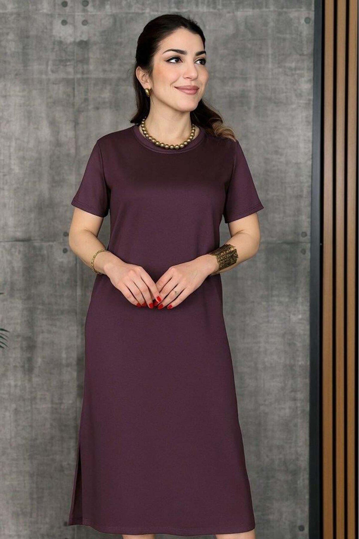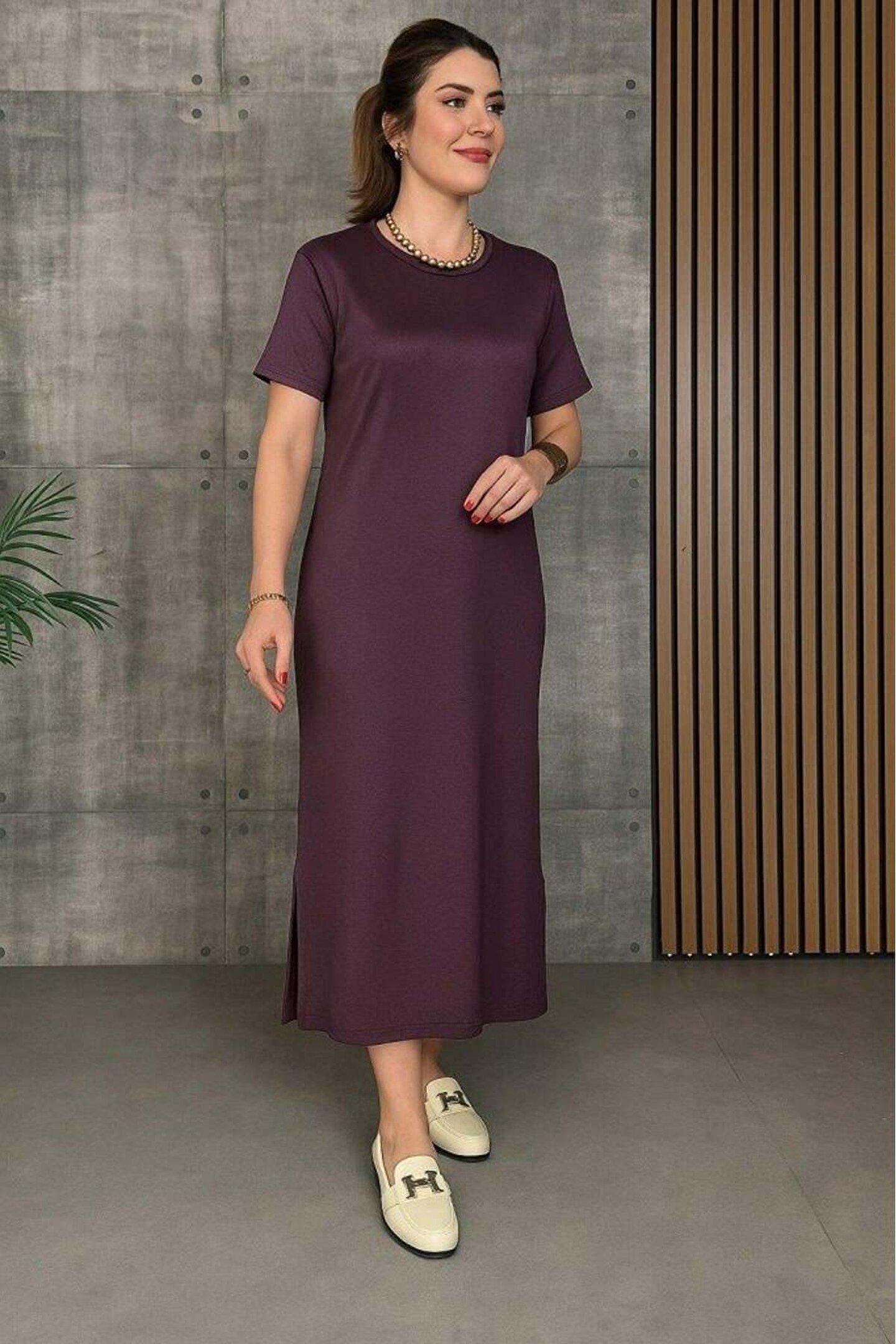 Kadın Kısa Kollu Bisiklet Yaka Yırtmaçlı Viskon Iki Iplik Elbise