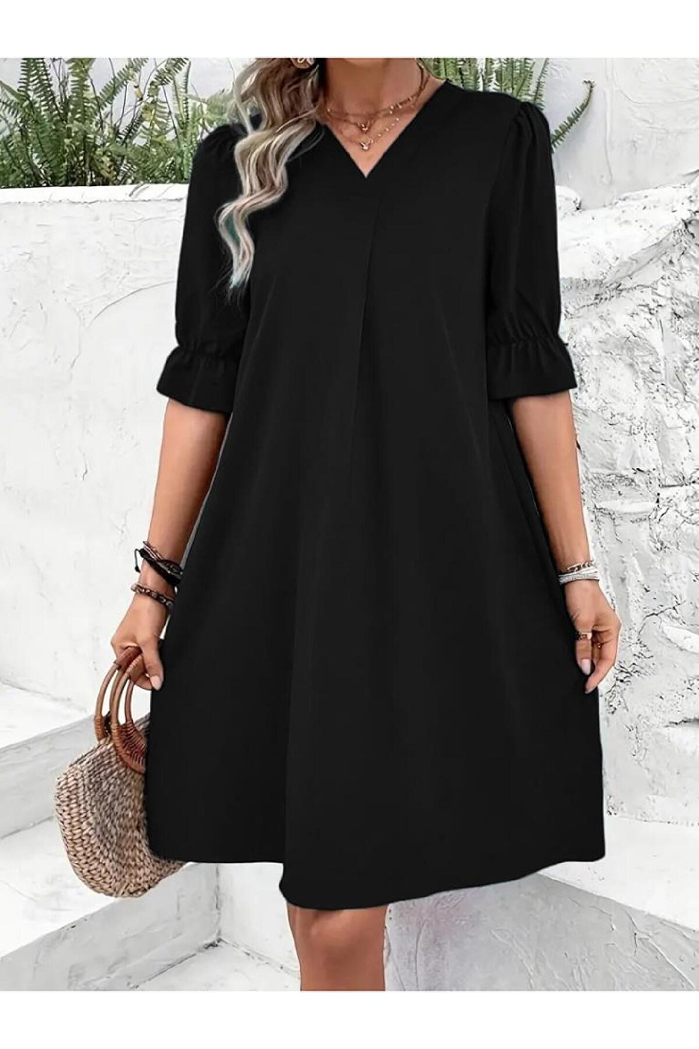 Kadın Kısa Kollu V Yakalı Salaş Janjan Krep Elbise