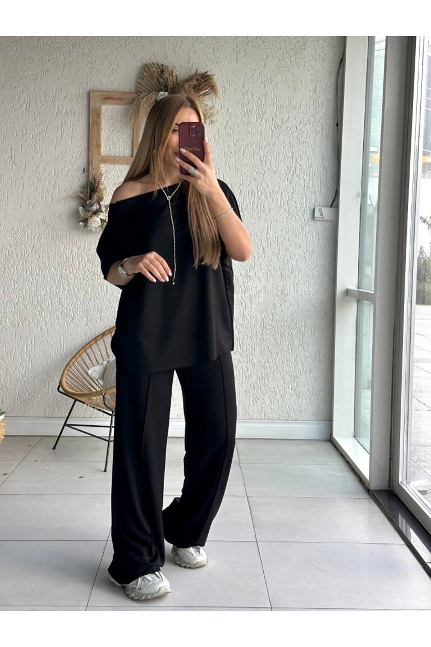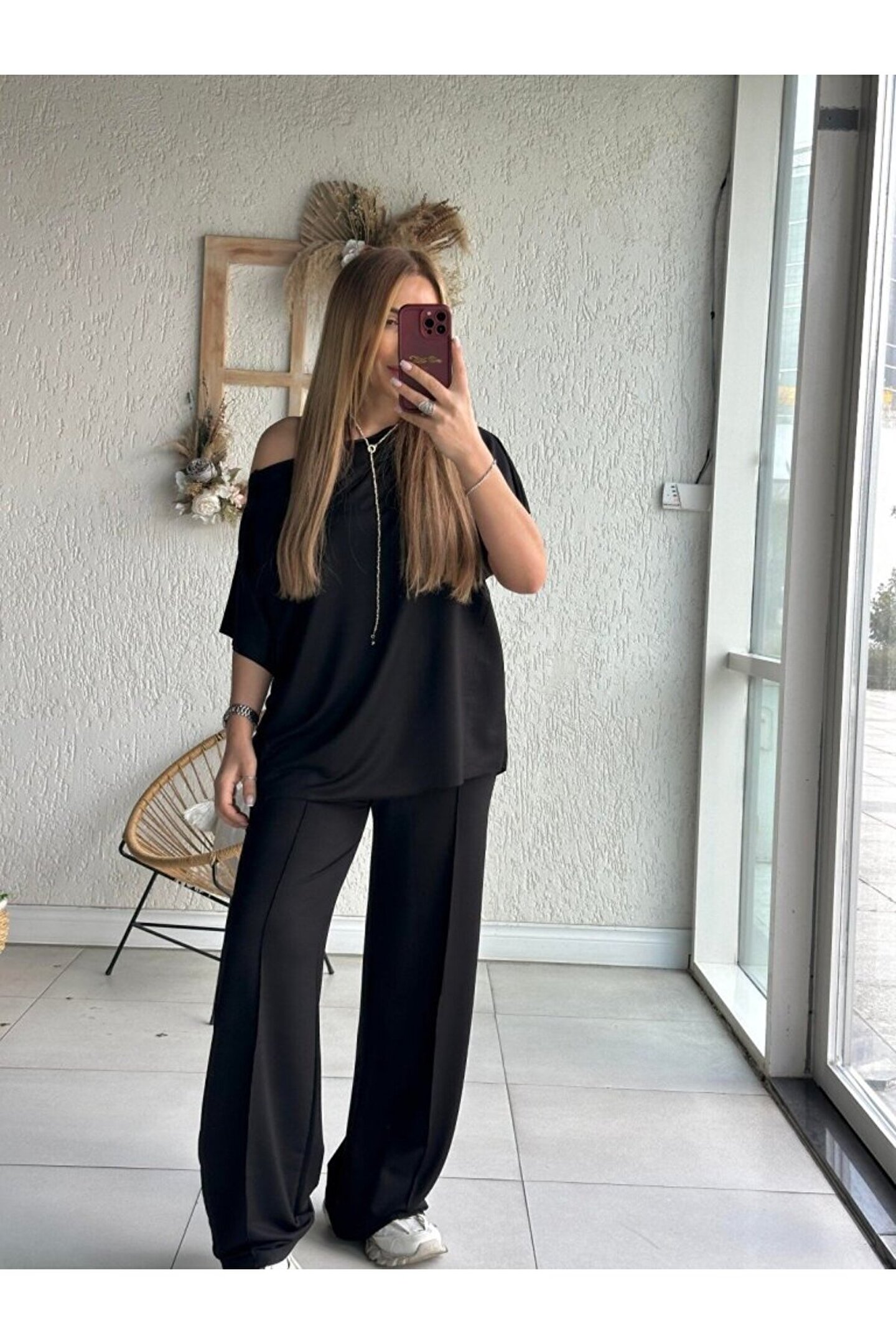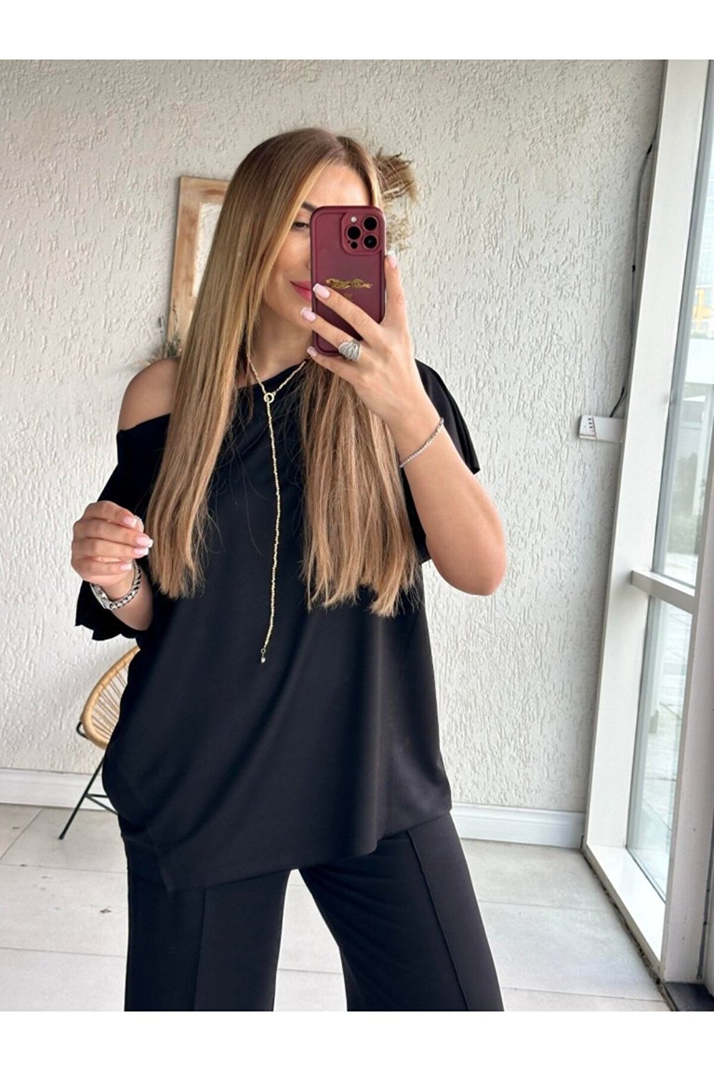 Kadın Tek Omuzdan Açık Geniş Kesim Viskon Iki Iplik Bluz Ve Pantolon Ikili Takım