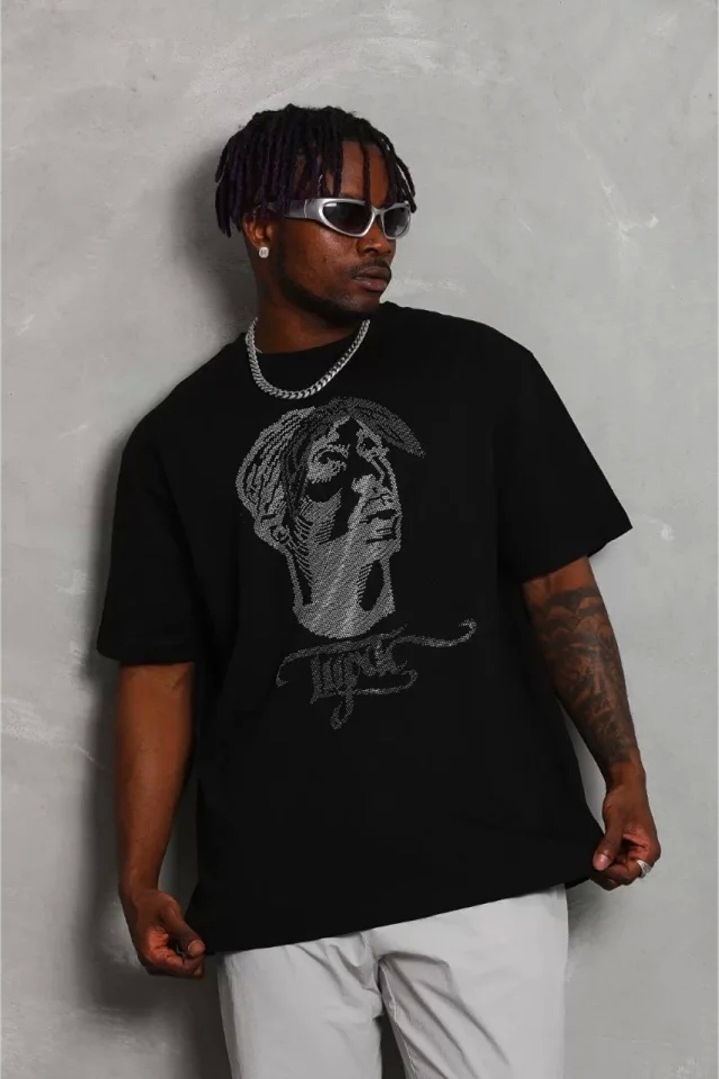 Unisex Oversize Taşlı Bisiklet Yaka T-Shirt - Siyah