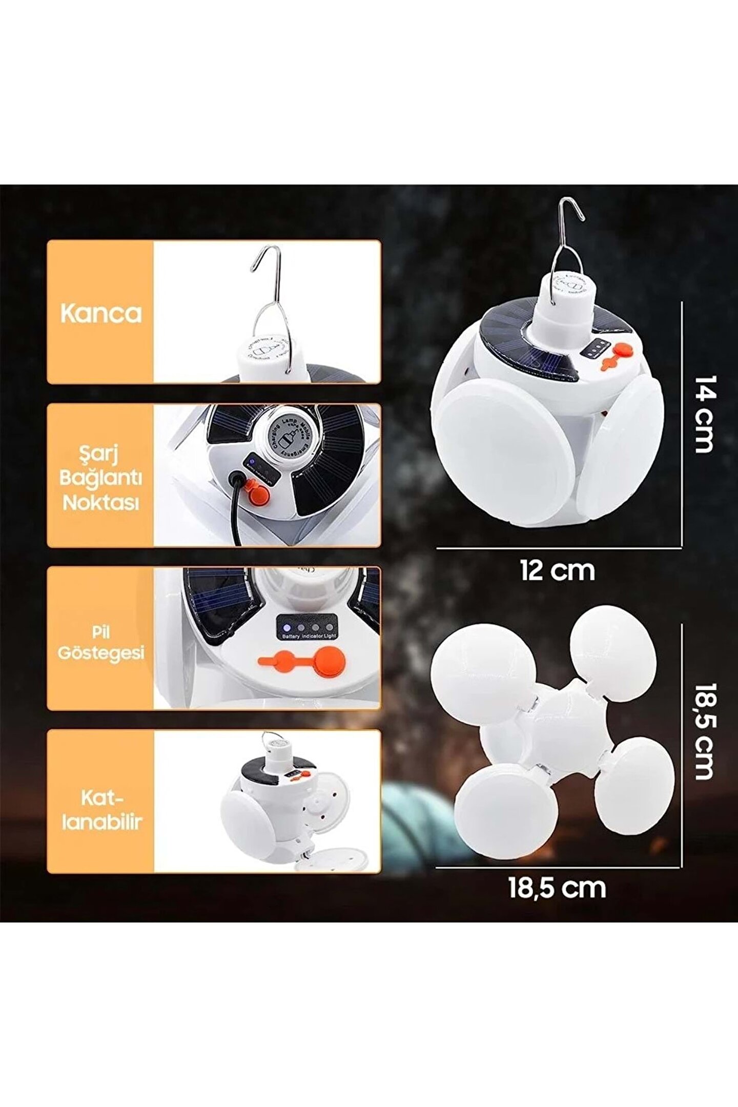 Güneş enerjisiyle çalışan Solar Panelli Şarjlı Kamp Lambası, doğa yürüyüşleri ve kamp aktiviteleri için ideal bir aydınlatma çözümü sunar; 5 adet katlanabilir LED lamba ile donatılmış olup, farklı ihtiyaçlara göre ayarlanabilir parlaklık seviyeleri sağlar; Powermaster markasının kalitesiyle üretilen bu lamba, dayanıklılığı ve uzun ömürlü kullanımı ile öne çıkar; Kolay taşınabilir yapısı sayesinde çantanızda fazla yer kaplamadan yanınızda taşıyabilirsiniz; Acil durumlar için tasarlanmış bu lamba, enerji tasarrufu yapmanızı sağlayarak çevre dostu bir seçenek sunar;