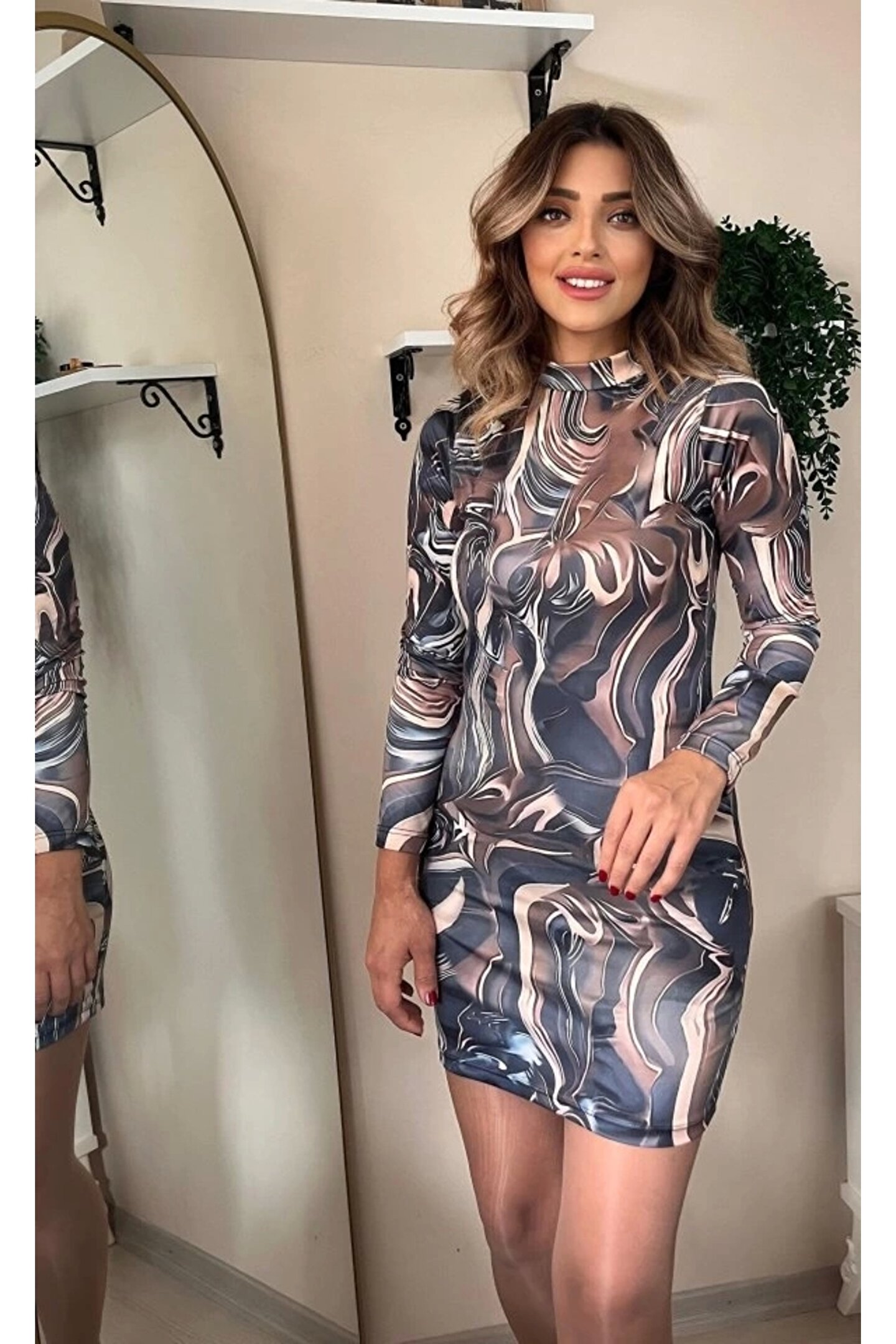 Kadın Uzun Kollu Balıkçı Yaka Desenli Dalgıç Elbise