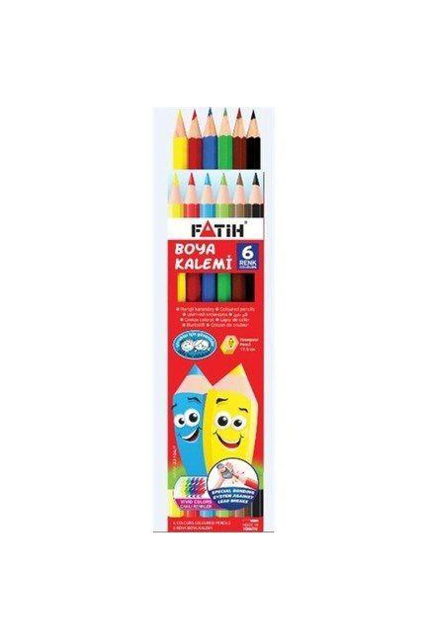 Fatih Kuru Boya 6 Renk Tam Boy * Elleri yormayan ergonomik üçgen gövde * Elin kaymasını engelleyen yumuşak tutuş * Parlak, canlı ve örtücü renkler * Uç açılma esnasında çatlama yapmayan gövde * Çevre dostu, su bazlı vernşkle kaplanmış gövde