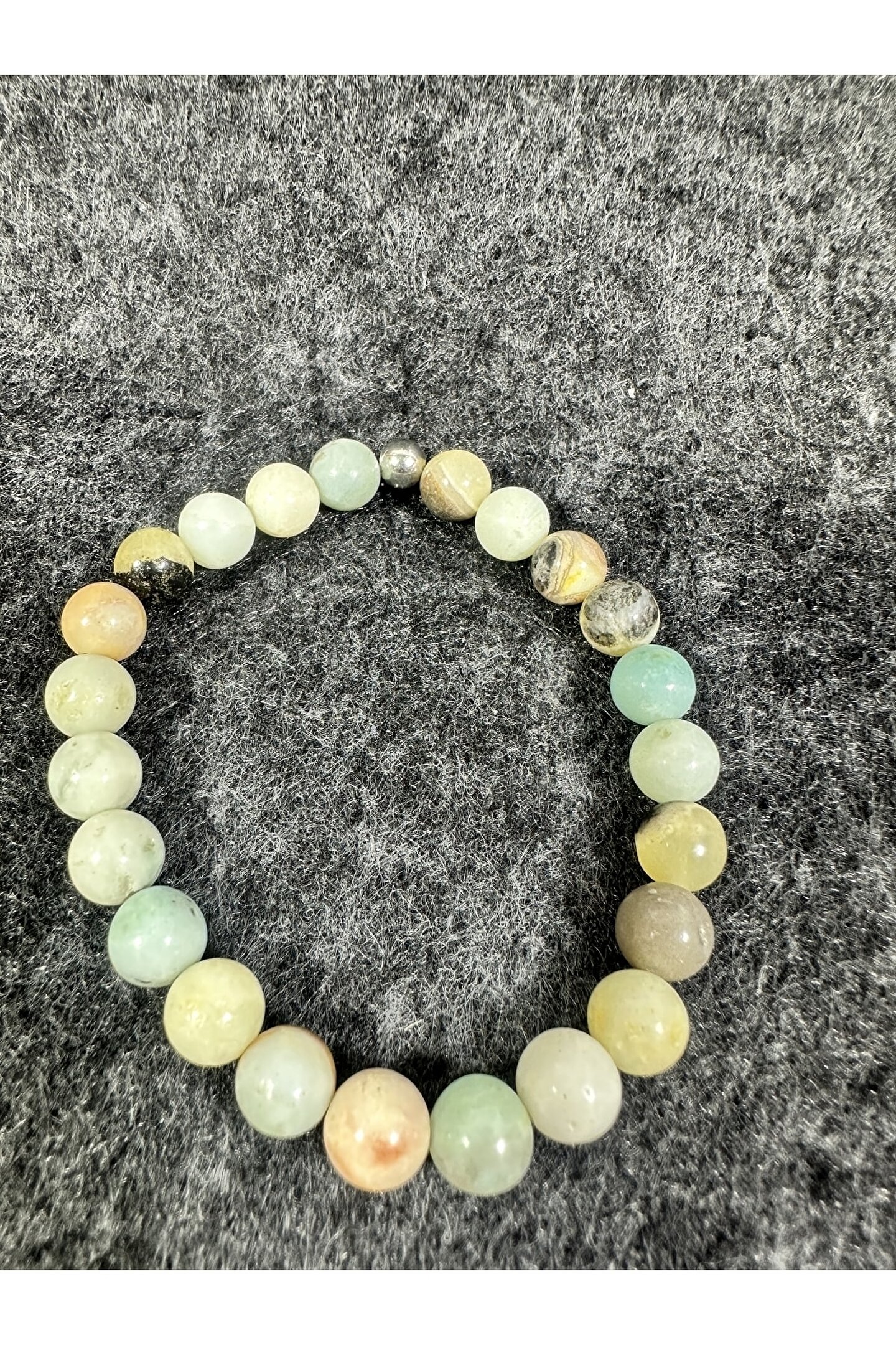 Doğal taş bileklik, her bir bileklikte bulunan benzersiz desen ve renklerle doğanın zarafetini yansıtır; Amazonit taşı, bileklikte kullanılan ana malzeme olarak seçilmiştir ve bu sayede hem şıklığı hem de doğallığı bir arada sunar; Bu bileklik, günlük kullanım için idealdir ve her türlü kıyafetle kolayca uyum sağlar; Doğal taş bileklik, el yapımı olmasıyla dikkat çeker ve her bir parça benzersiz bir hikaye anlatır; Amazonit taşı, bileklikte kullanılan diğer malzemelerle uyumlu bir şekilde birleşerek estetik bir görünüm oluşturur;