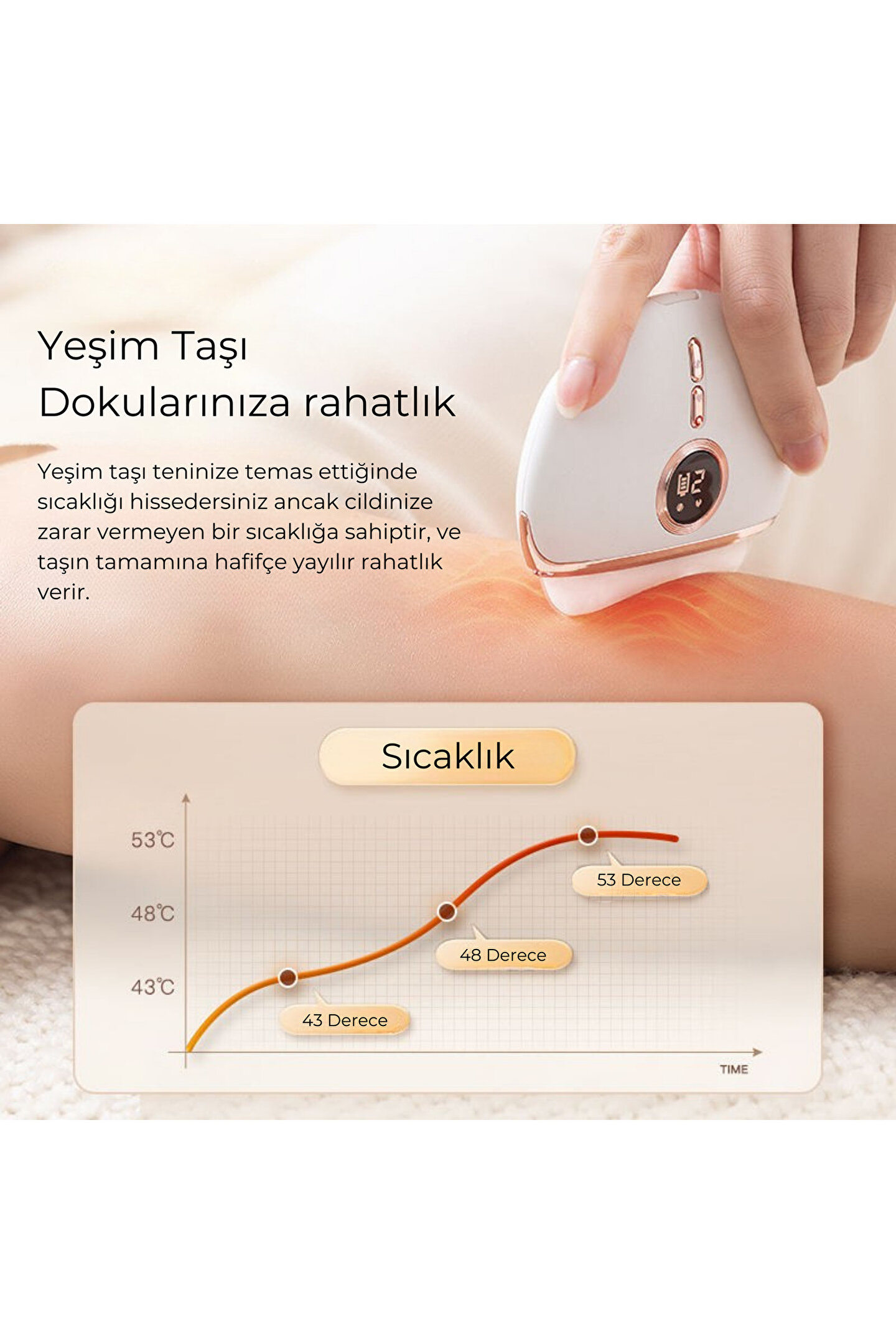 Fegel fg-02 jade scraping ile cilt bakımında doğal ve lüks bir deneyim! Jade scraping, cilt bakım rutininize doğal bir dokunuş katmak isteyenler için tasarlanmış şık ve etkili bir masaj aletidir.; Binlerce yıllık çin güzellik ritüellerinden esinlenen bu özel ürün, cildinizi yenilemek, canlandırmak ve daha genç bir görünüm kazandırmak için harika bir seçenektir.; Yüzünüzdeki kan dolaşımını artırarak cildin daha sıkı, parlak ve sağlıklı görünmesine yardımcı olur.; Aynı zamanda şişkinliği azaltır, ince çizgilerin görünümünü hafifletir ve ciltteki toksinlerin atılmasını destekler.; Premium kalite ve şık tasarım: Jade scraping, doğal yeşim taşından üretilmiştir ve ciltle mükemmel bir uyum sağlar.; Taşın serin yapısı, cildinizi anında yatıştırır ve ferahlatıcı bir his sunar.; Ergonomik tasarımı sayesinde yüz, göz çevresi, boyun ve dekolte bölgelerinde rahatlıkla kullanılabilir.; Ayrıca, şarj edilebilir ve ısıtma özelliği ile kullanım konforunu artırır.; Bu özellik, cilt bakım ürünlerinizin emilimini artırırken, cildinize derinlemesine bir bakım sağlar.; Cilt bakımınızı güçlendirin: Jade scraping, cilt bakım ürünlerinizin (serum, yağ veya nemlendirici) cilt tarafından daha iyi emilmesine yardımcı olur.; Bu sayede ürünlerin etkisini maksimuma çıkarır ve cildinizin daha hızlı yenilenmesini sağlar.; Düzenli kullanımda, cilt tonunu eşitler, yüz hatlarını belirginleştirir ve çene çizgisini daha keskin hale getirir.; Ayrıca, cildinize doğal bir ışıltı kazandırarak sağlıklı ve genç bir görünüm sunar.; Kolay kullanım ve anında sonuç: Jade scraping’ı temiz cildinize uygulayın; dilerseniz cilt bakım ürünlerinizle birlikte kullanarak etkisini artırabilirsiniz.; Aleti hafif baskı uygulayarak yukarı ve dışa doğru hareketlerle masaj yapın.; Özellikle göz çevresindeki şişkinlikler için soğuk taş etkisiyle anında rahatlama sağlar.; Günlük birkaç dakikalık kullanım ile cildinizdeki farkı hissedecek ve doğal güzelliğinizi ortaya çıkaracaksınız.; Neden jade scraping? Doğal yeşim taşı ile cilt dostu ve uzun ömürlü.; Şarj edilebilir ve ısıtma özelliği ile kullanım kolaylığı.; Yüz, göz çevresi, boyun ve dekolte için ideal.; Cilt bakım ürünlerinin emilimini artırır, cildi yeniler ve gençleştirir.; Jade scraping ile cilt bakımınızı bir üst seviyeye taşıyın ve doğal güzelliğinizi keşfedin!