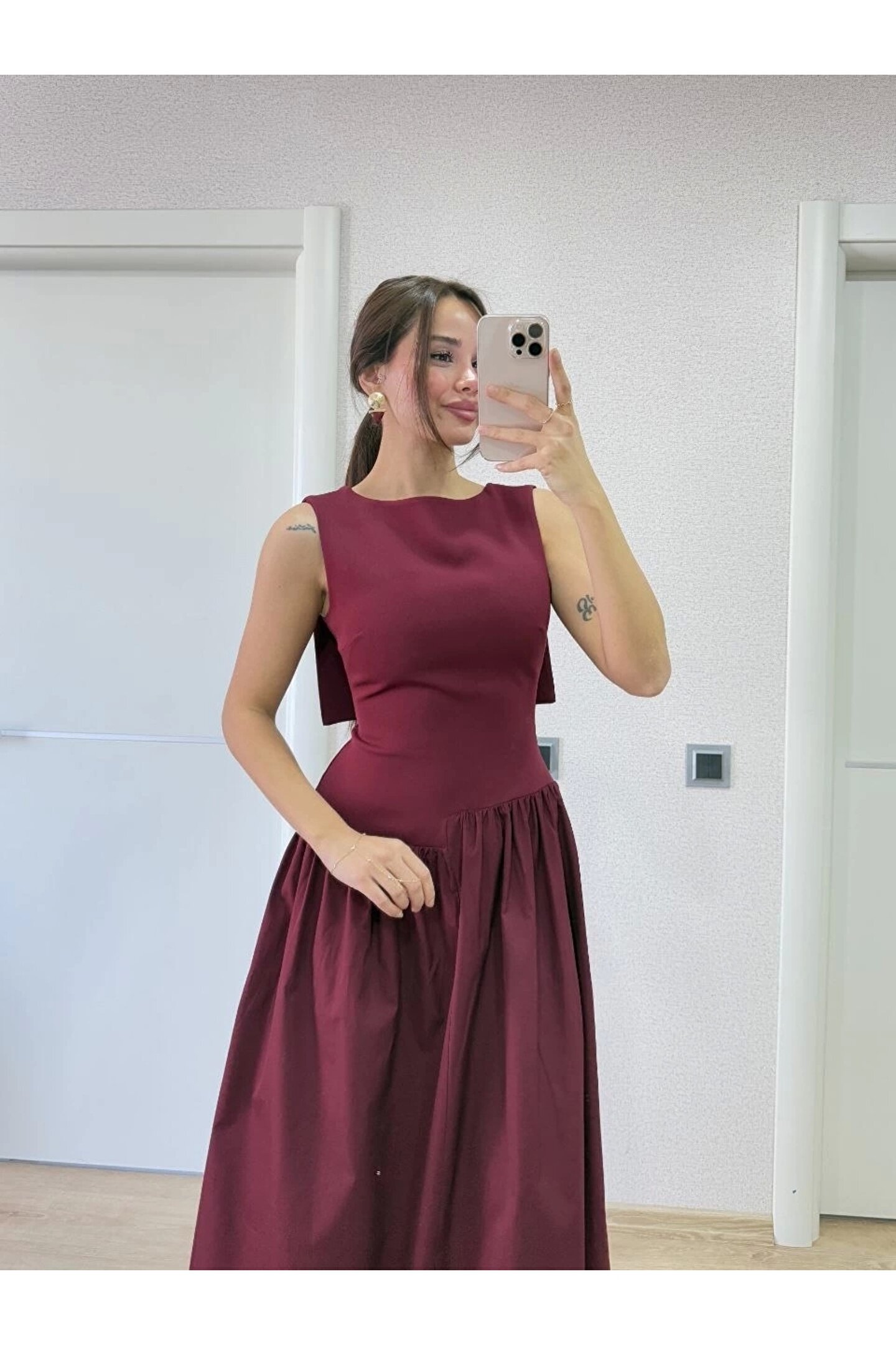 FENVORA Krep Arkası Kanat Arka Ön Pens Detaylı Uzun Kadın Elbise - Bordo