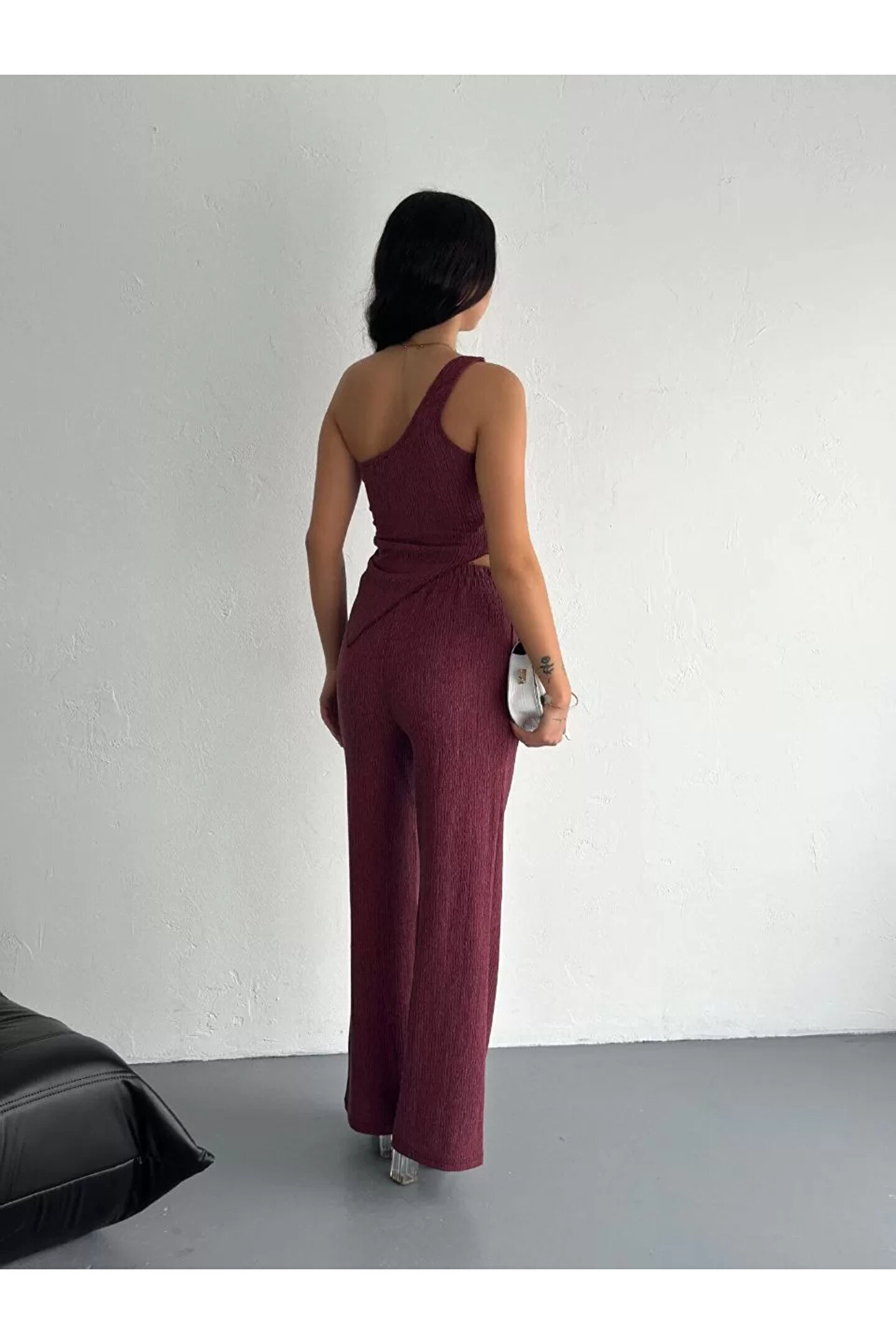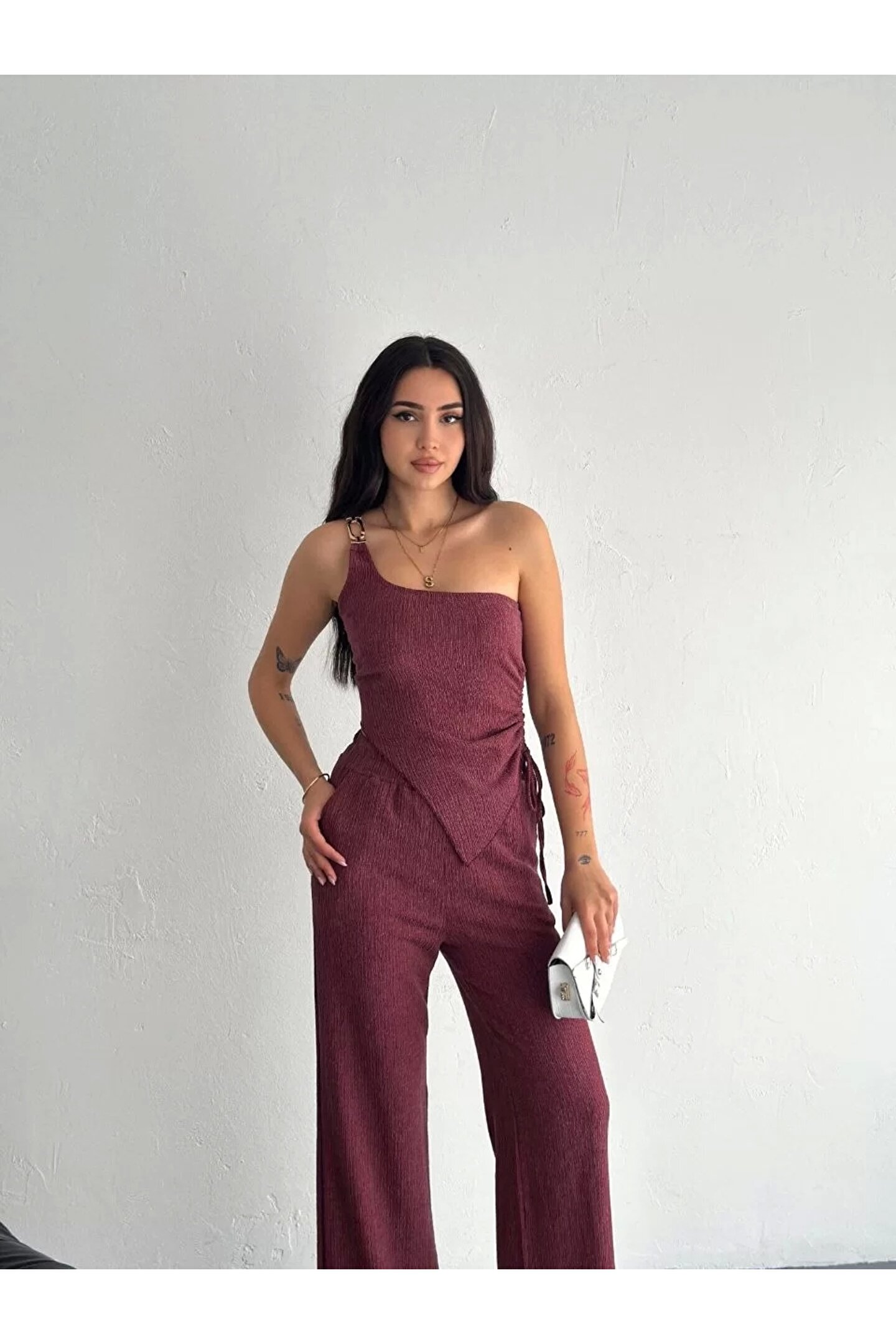 Asimetrik Crop Pantalon Ikili Takım - Gül Kurusu