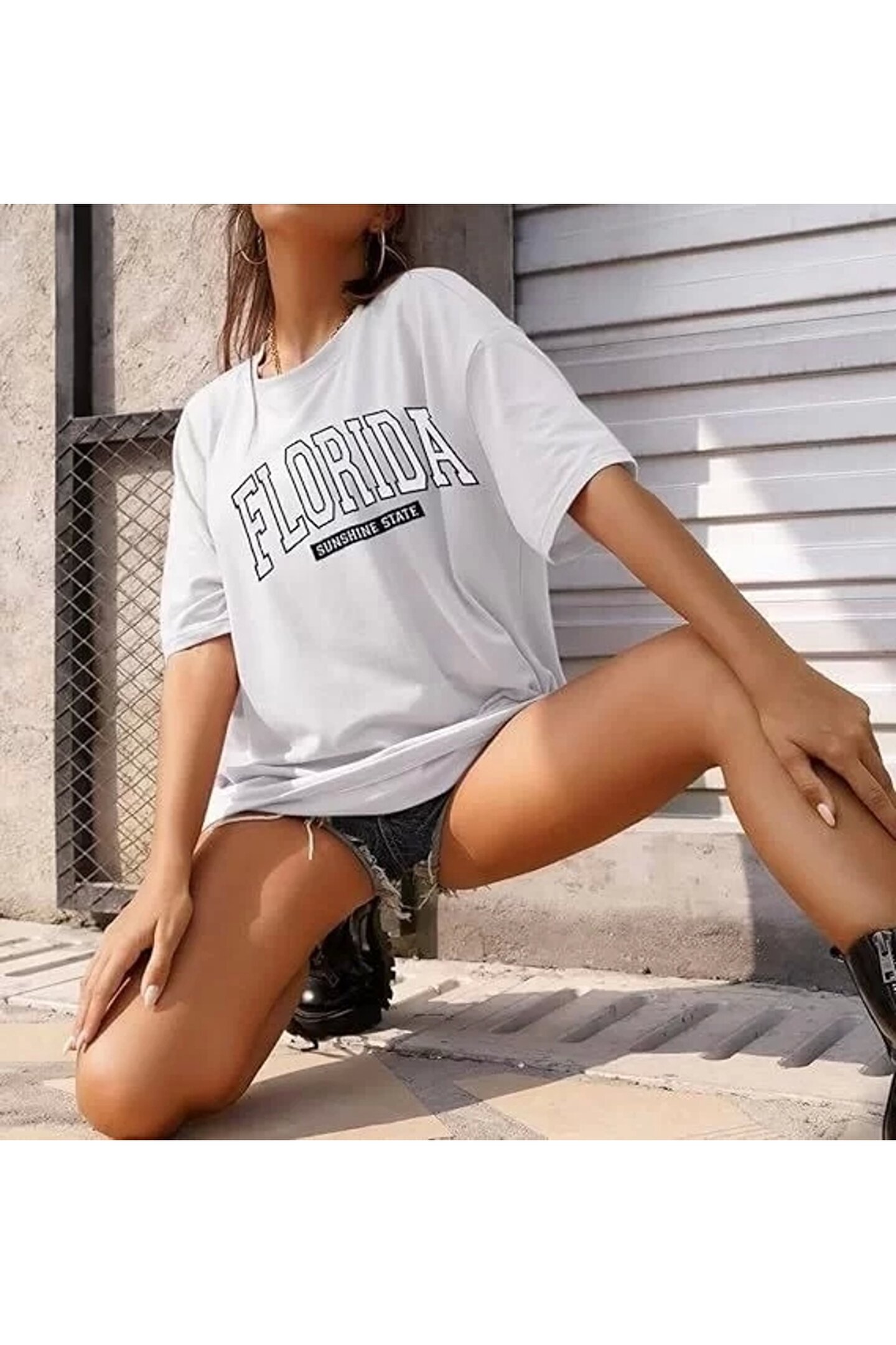 Kadın Bisiklet Yaka Baskılı T-shirt - Beyaz