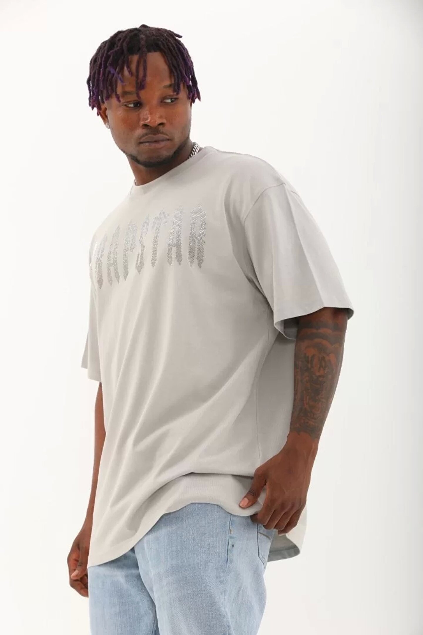 Flexium Unisex Oversize Taşlı Bisiklet Yaka T-Shirt - Gri