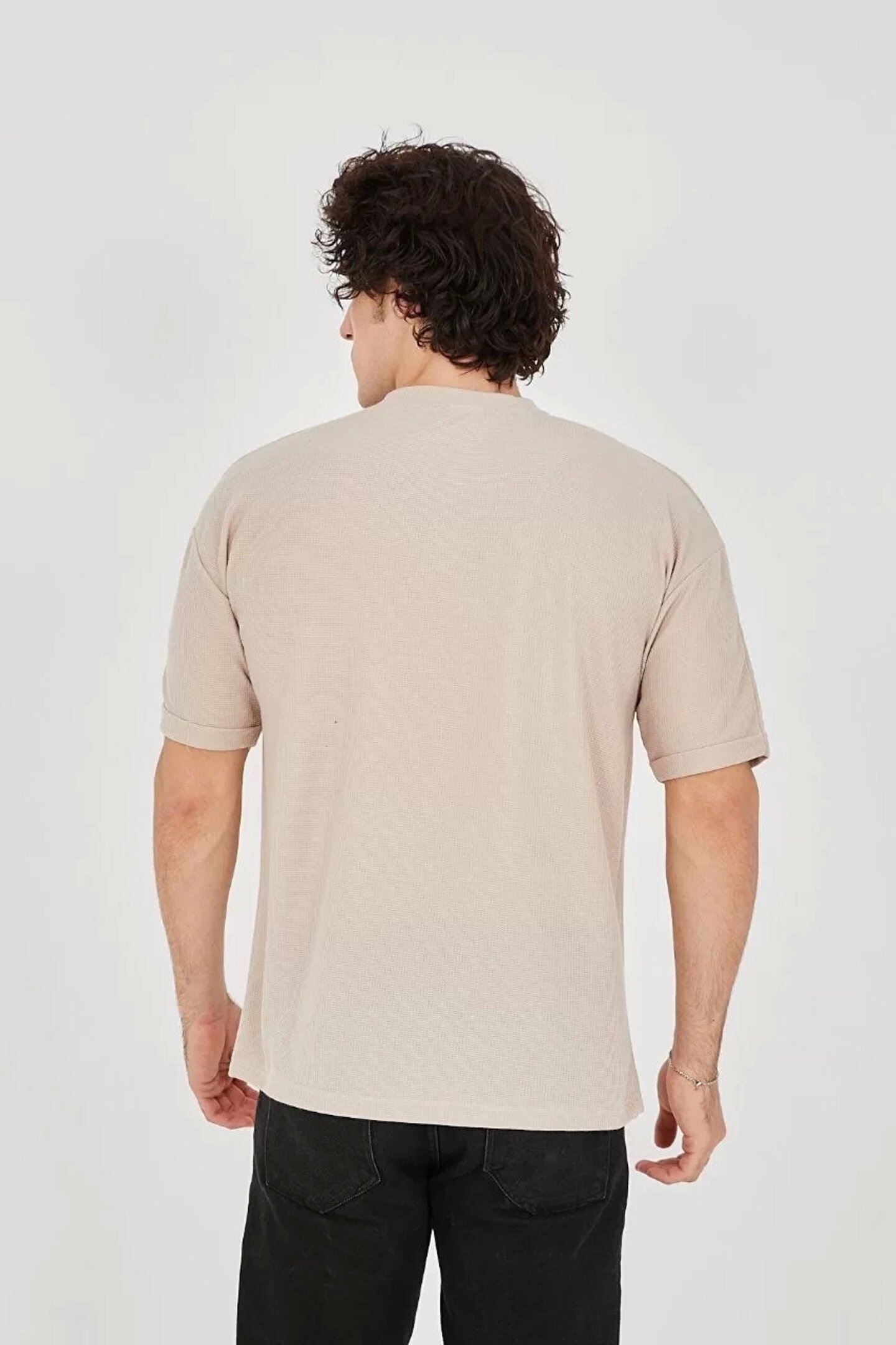Unisex Waffle Kumaş Rahat Kol T-Shirt - Bej