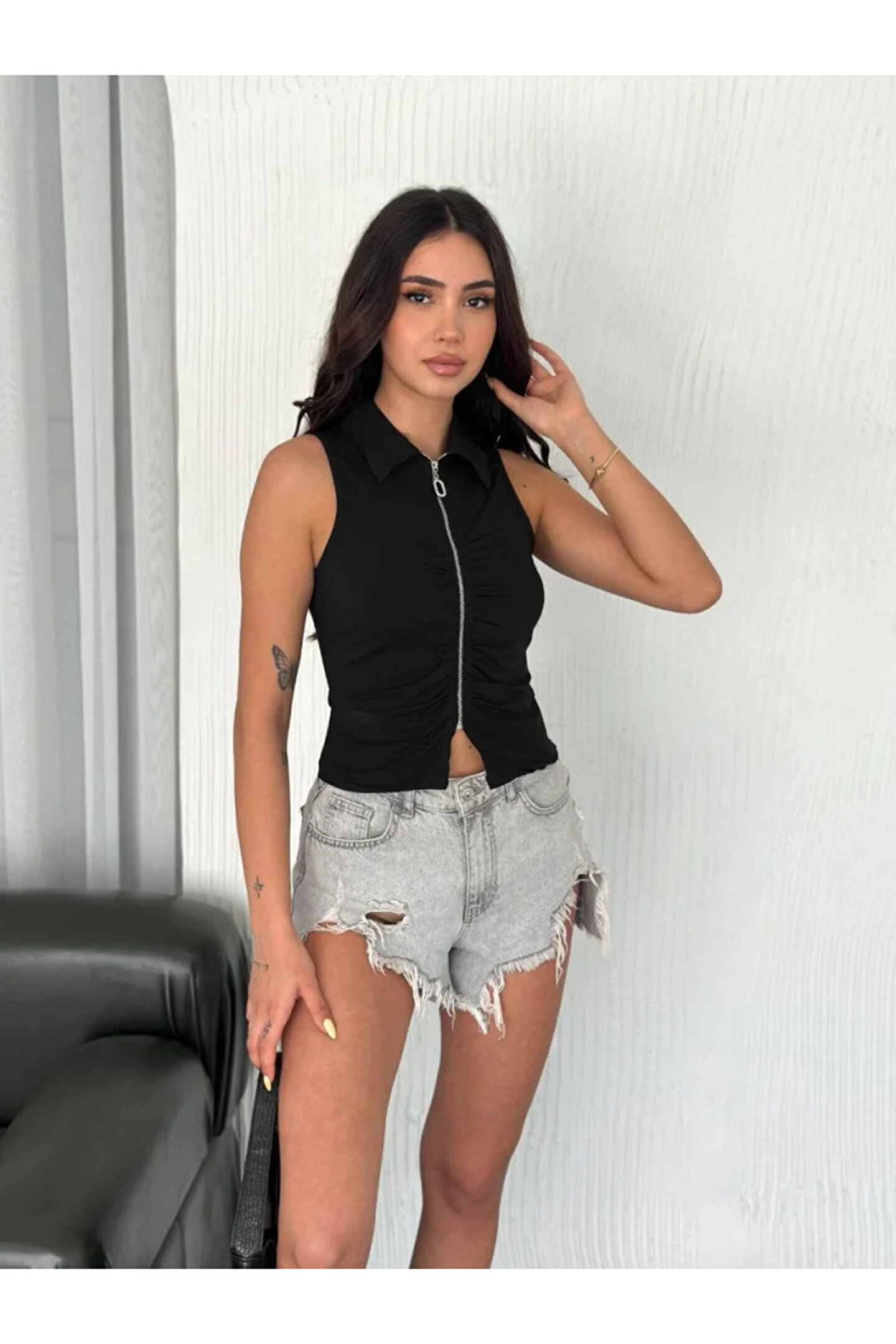 Yakalı Tam Fermuarlı Kolsuz Bluz - Siyah