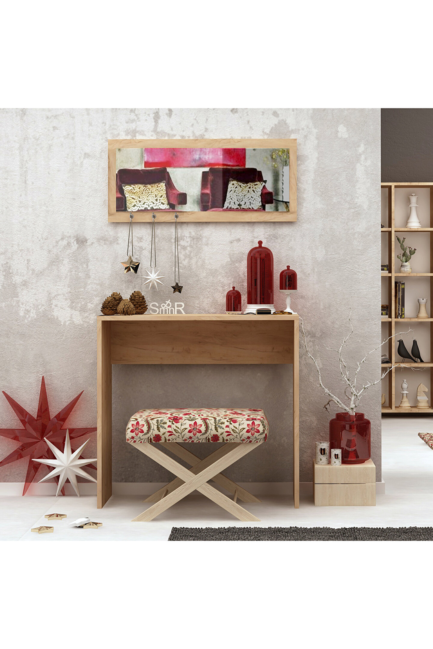 Montajı kolaylaştıracak biçimde kurulum talimatı yeralmaktadır. Minimal tasarımı ile gerek makyaj masası, gerek giriş mobilyasıolarak kullanılabilecek şekilde dar alanlarda çözüm ortağınız olacaktır. Tüm mekanlarda derleyici dekorasyon ögesi olarak kullanılmaya uygundur.