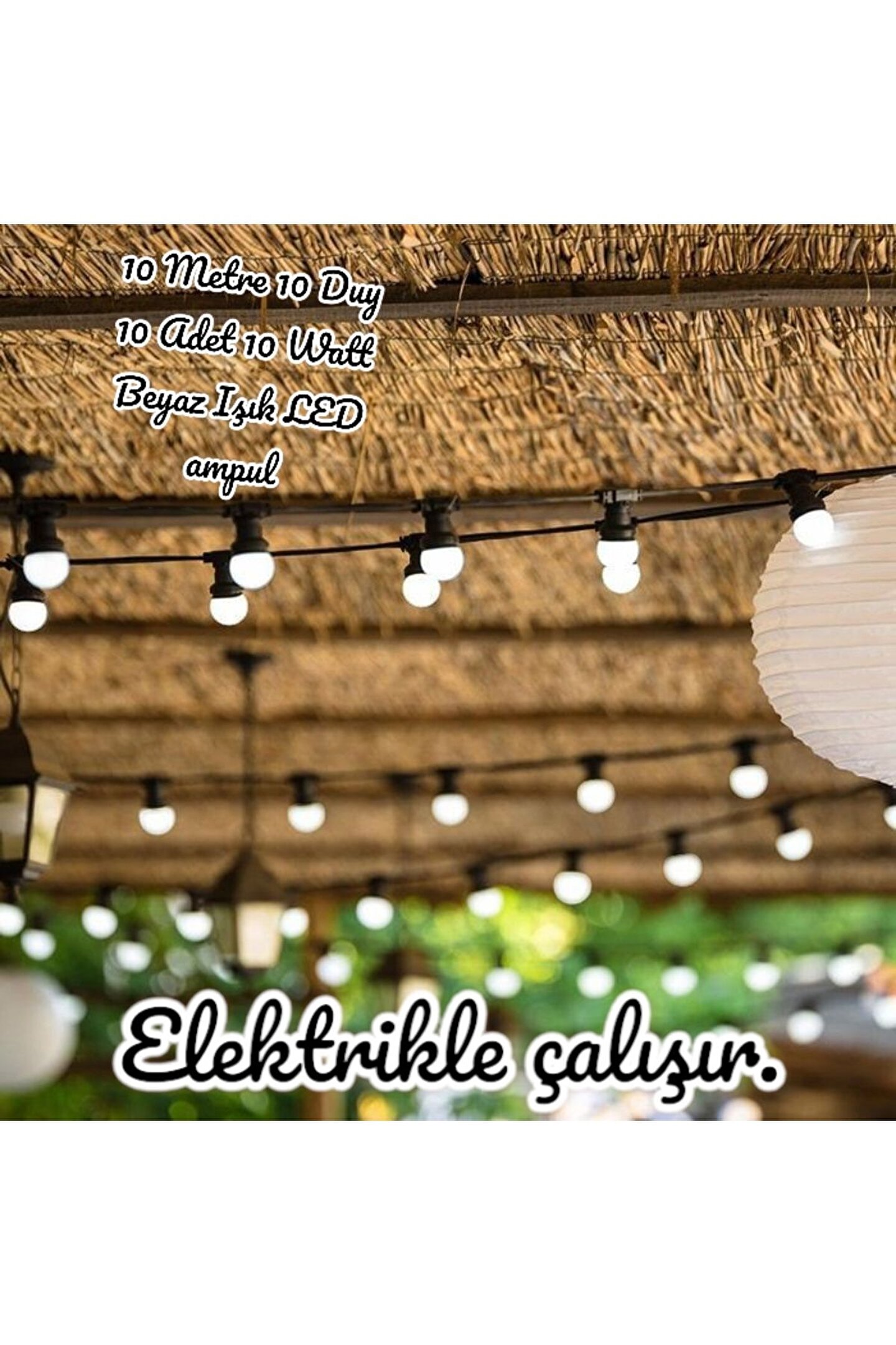 10 Metre, 10 Adet 10 Watt Beyaz Işık Ampullü Düğün Kına Eğlence İşletme, Bahçe Aydınlatma Organizeri Ürün IP44 Koruma sınıfındandır; Yağmur, kar ve güneş gibi mevsimsel şartlardan etkilenmez; Elektrik kaynağına bağlarak çalışır; Ürün biribirine eklenebilme özelliğine sahiptir; Yani ikinci, üçüncü ürünü alıp 10, 20, 30; metre olarak ta kullanabilirsiniz; Düğün, kına, eğlence, karnaval, şölen, düğün salonu, işletmeler ve bahçe aydınlatması için uygundur; Paket İçeriği: 10 Adet 10 Watt 6500 Kelvin Beyaz Işık Led Ampul ve 10 Metre, 10 Duy Sıralı Aydınlatma Organizeri 10 Metre, 10 Adet 10 Watt Beyaz Işık Ampullü Düğün Kına Eğlence İşletme, Bahçe Aydınlatma Organizeri;