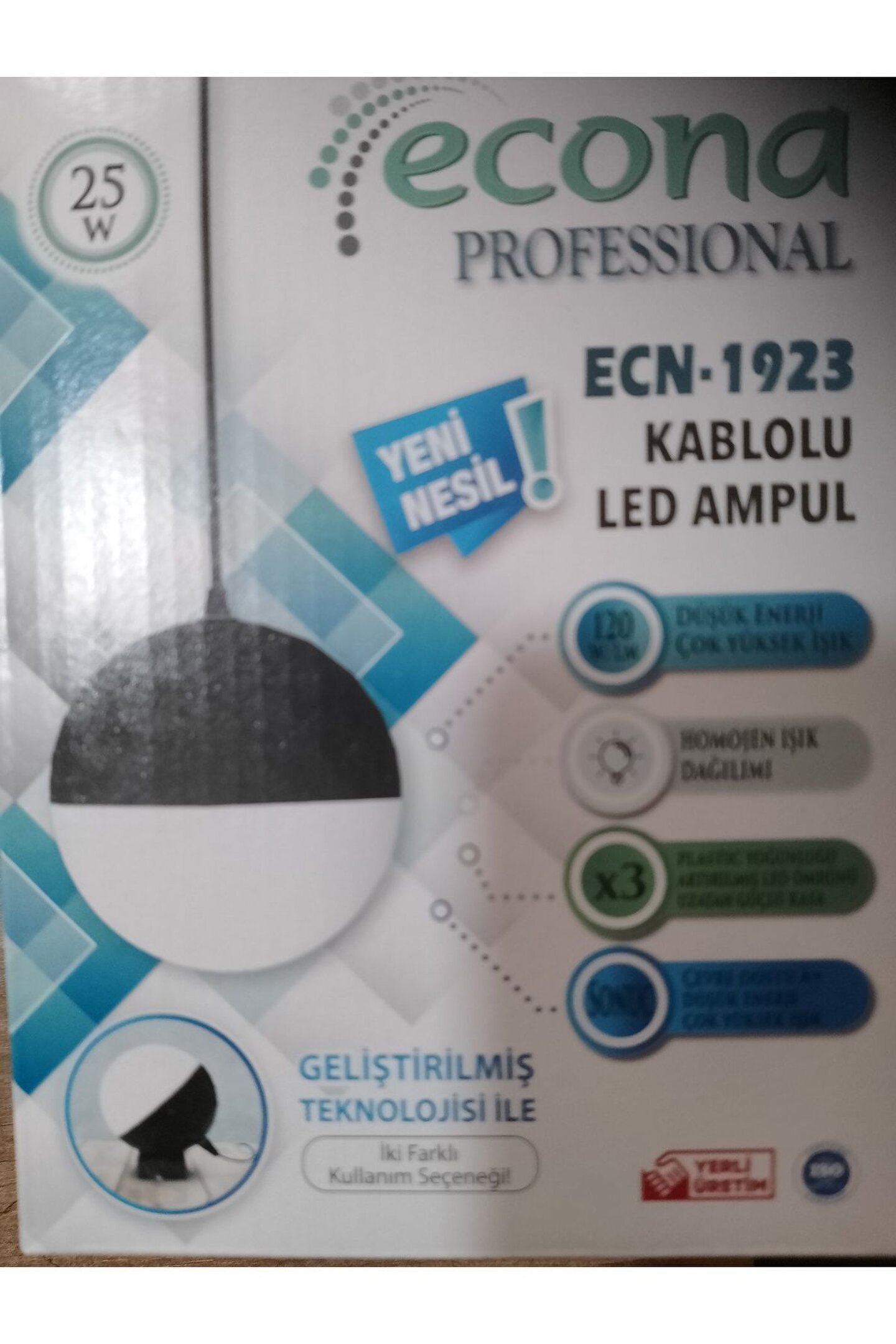 Ürünümüz 25 Watt Gün ışığı (3000k) kendinden ledli, fişli, 1,5 metre kablolu, arapuatlı (Açma - Kapama Anahtarlı) direk fişe tak çalıştır led ampuldür.; ; Birinci kalite sert plastikten üretilmiş, iç mekan ve dış mekan kullanımına uygun, IP54 Koruma sınıfından, yeni nesil led ampuldür.; ; Ürünümüz hobi olarak lambader, avize, masa lambası, aplik vs.; ; yapanlar için oldukça uygun ve şık bir üründür.; ; Aynı ürünün farklı kablo boyları, fişli - fişşiz seçenekleri ve ışık renkleri için mağazamızı inceleyiniz.; ; Ürün Ölçüsü: Kablo 1,5 Metre, Fiş: Var, Çap 116 MM.;