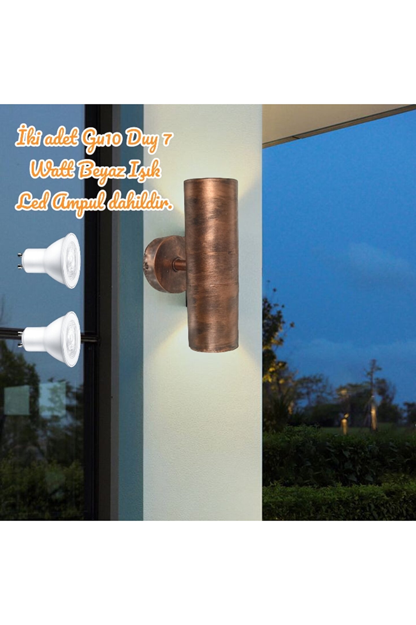 2 Adet 7 Watt Gu10 Duy BEYAZ IŞIK Ampuller Dahil Çift Yönlü Bakır Eskitme Armatür Bilgileri Ürünümüz elektrik kaynağına bağlanarak çalışır. ; KESİNLİKLE pilli, şarzlı, güneş enerjili vs. ; DEĞİLDİR. ; Birinci kalite ABS plastik gövde el işçiliği ile boyanarak eskitilmiştir. ; Max 2 x 7 Watt Gu10 Duy Led, IP 65 Koruma sınıfı, iç ve dış mekan aplik. ; Yağmur, kar ve güneş gibi mevsimsel şartlardan etkilenmez. ; Dolgun ve şık görünüm. ; Ürün Ölçüleri: Yükseklik 18,6 Cm, Dürbün Mercek çap: 6 cm, Derinlik: 11,5 Cm. ; montaj aparat çapı: 7,2 Cm. ; Paket İçeriği: Bir Adet Bakır Eskitme Çift Yönlü Armatür ve iki adet 7 Watt Gu10 Duy BEYAZ IŞIK Led Ampul;
