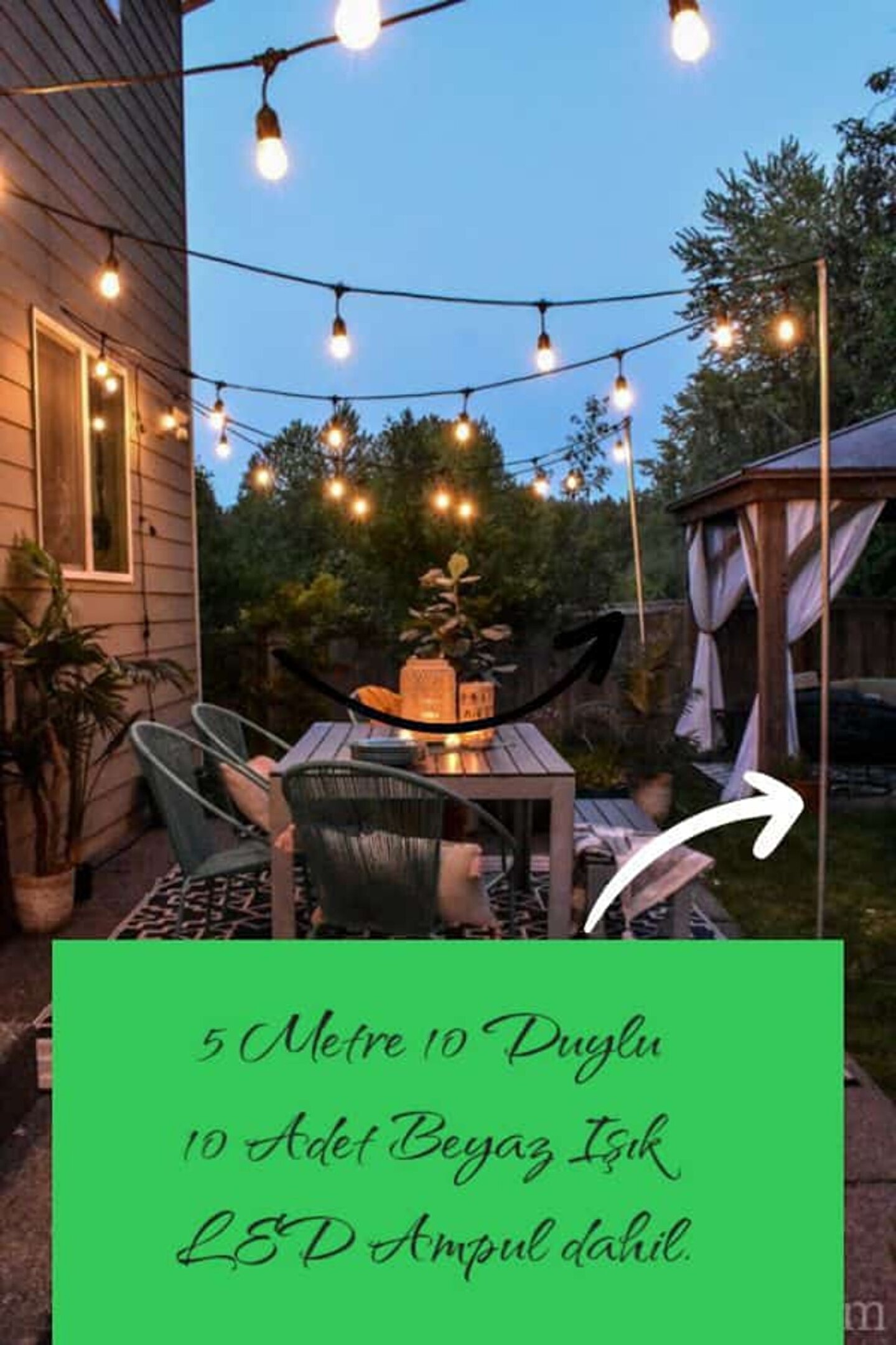 10 Adet Beyaz Işık Led Ampul Dahil (10 Watt) Beyaz Işık Ampullü, 5 Metre 10 Duylu Eklenebilir Bahçe, Kafe, Teras, Balkon Armatürü İç Dış Ve Mekan