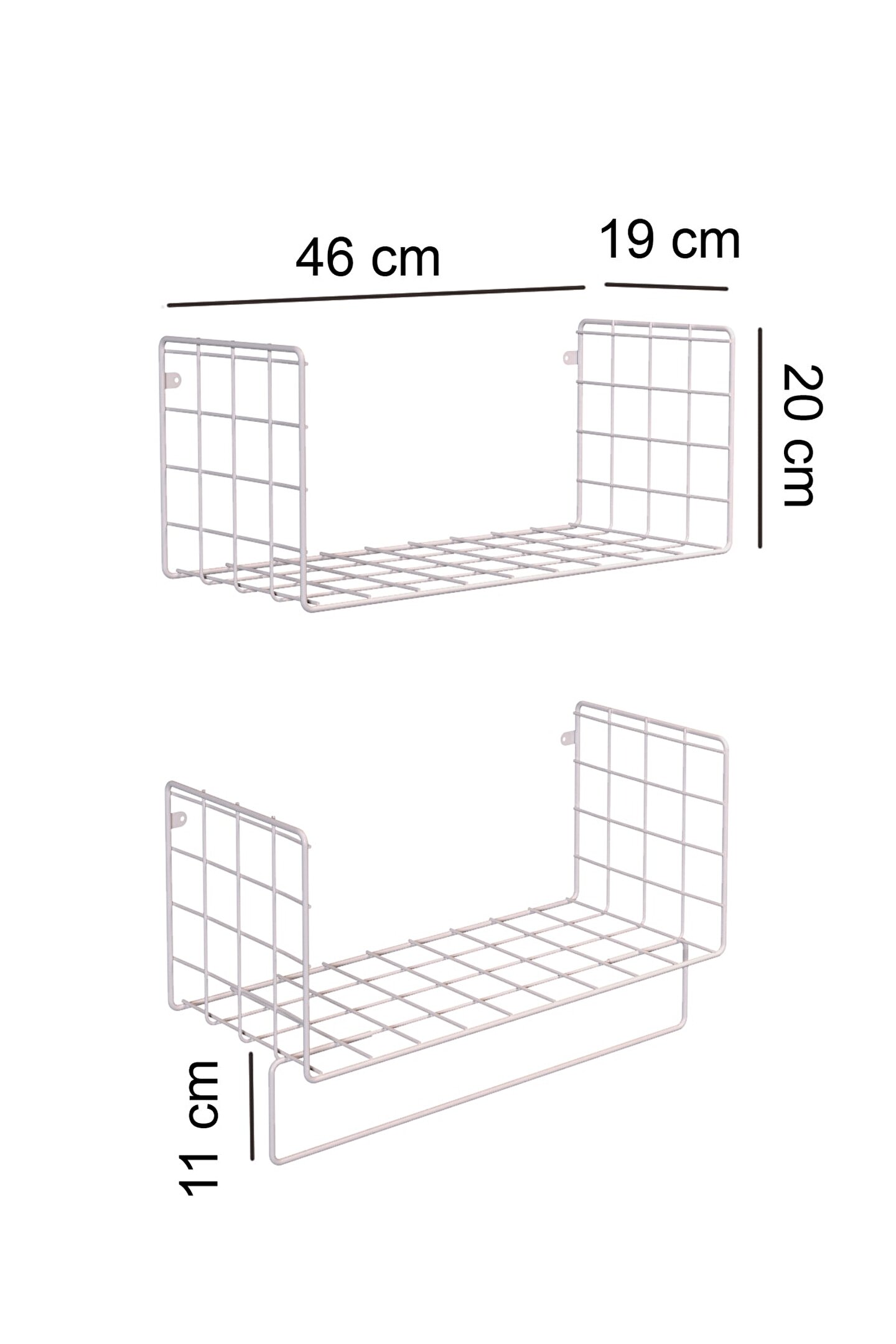 Ürünümüz metal tel işçiliği ile üretilmiş olup 1. ; kalite boyalıdır. ; Ürün iki adet metal duvar rafından oluşmakta, raflardan birisinde havlu vb. ; eşyaları asmak için konsol bulunmaktadır. ; Ofiste, evde, banyo - mutfak düzenlemesinde, balkonda, makyaj rafı, baharat rafı, kitaplık, dergilik, kaktüs ve çiçeklik gibi çok amaçlı kullanıma uygun bu ürünümüzle yaşam alanlarınıza şıklık katabilirsiniz. ; Ürün Ölçüleri: Genişlik 46 Yükseklik 20 Derinlik 19 Cm'dir. ; Asma konsolu: 42 Cm Montaj için ürünle beraber 4 vida, 4 dubel gönderilmektedir.;