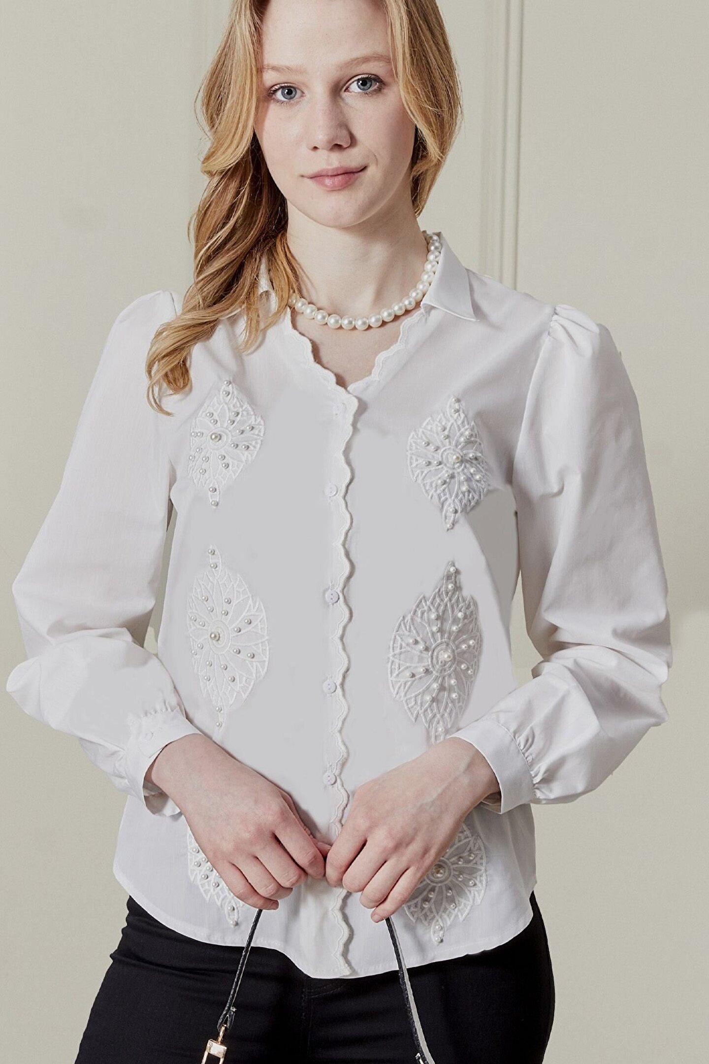 Kadın Beyaz Nakış İncili Detaylı Vintage Gömlek