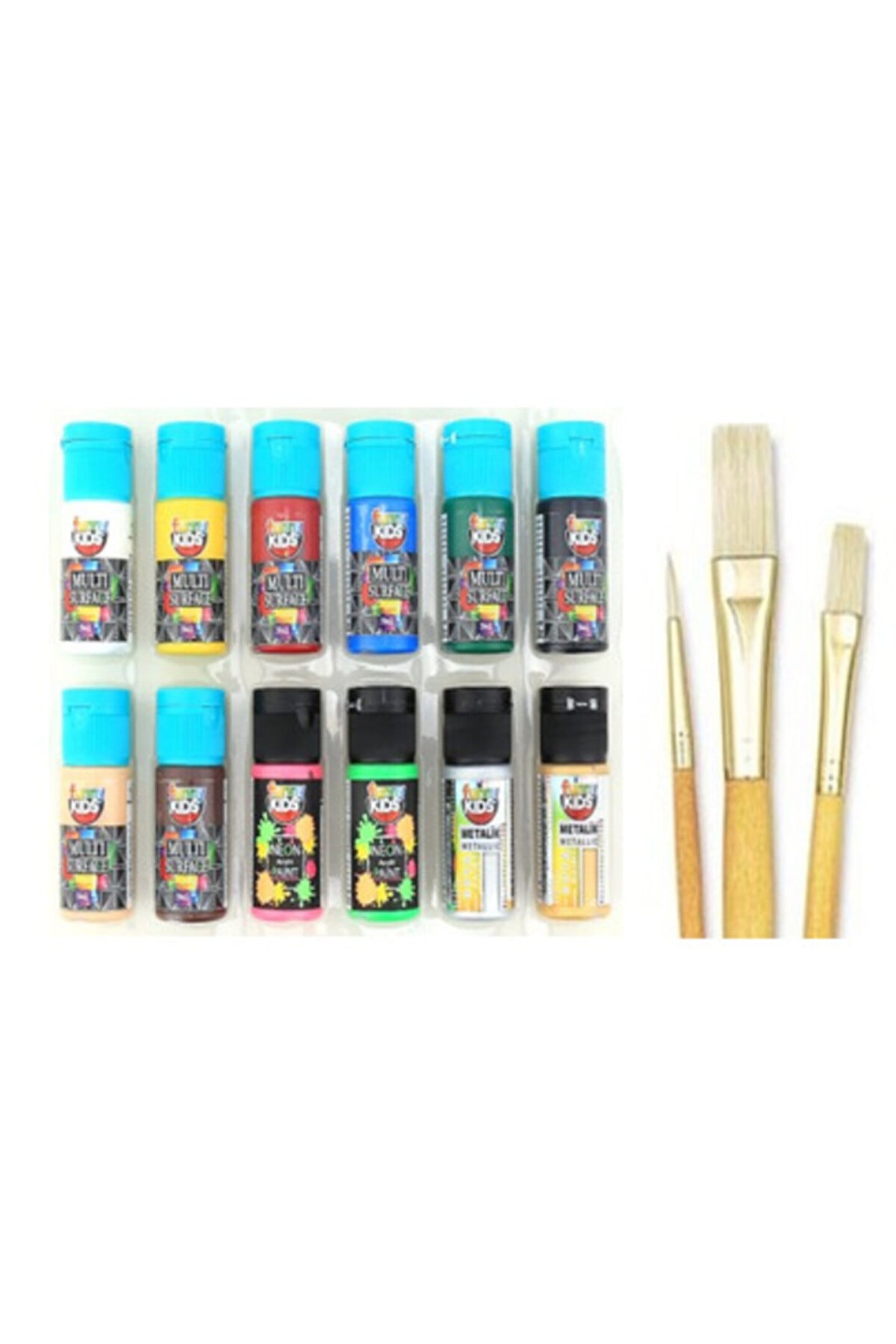 8 adet multi surface akrilik boya 2 adet neon akrilik boya 2 adet metalik akrilil boya 3 adet fırça