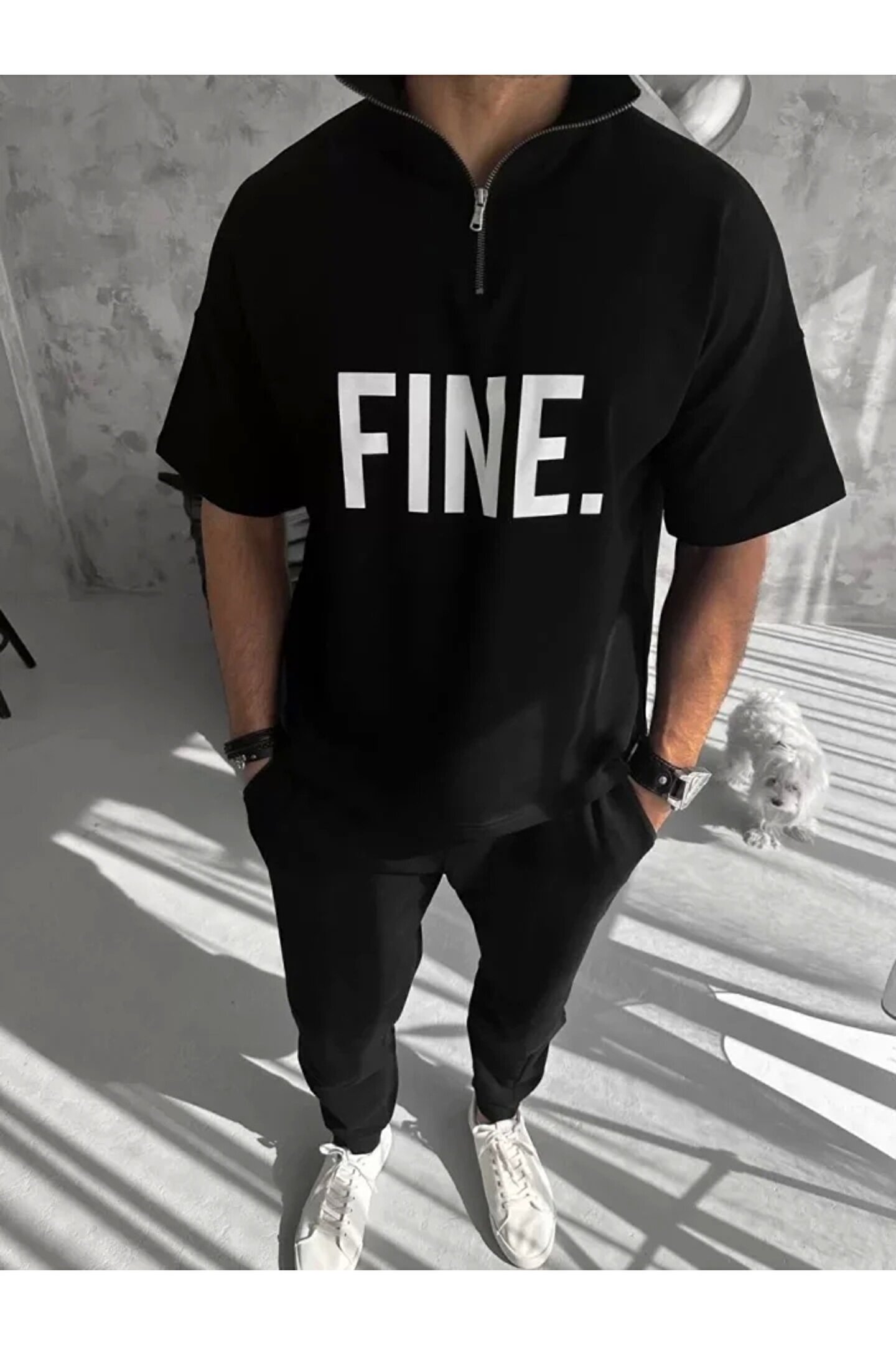 Unisex Baskılı Yarım Fermuarlı T-Shirt - Siyah