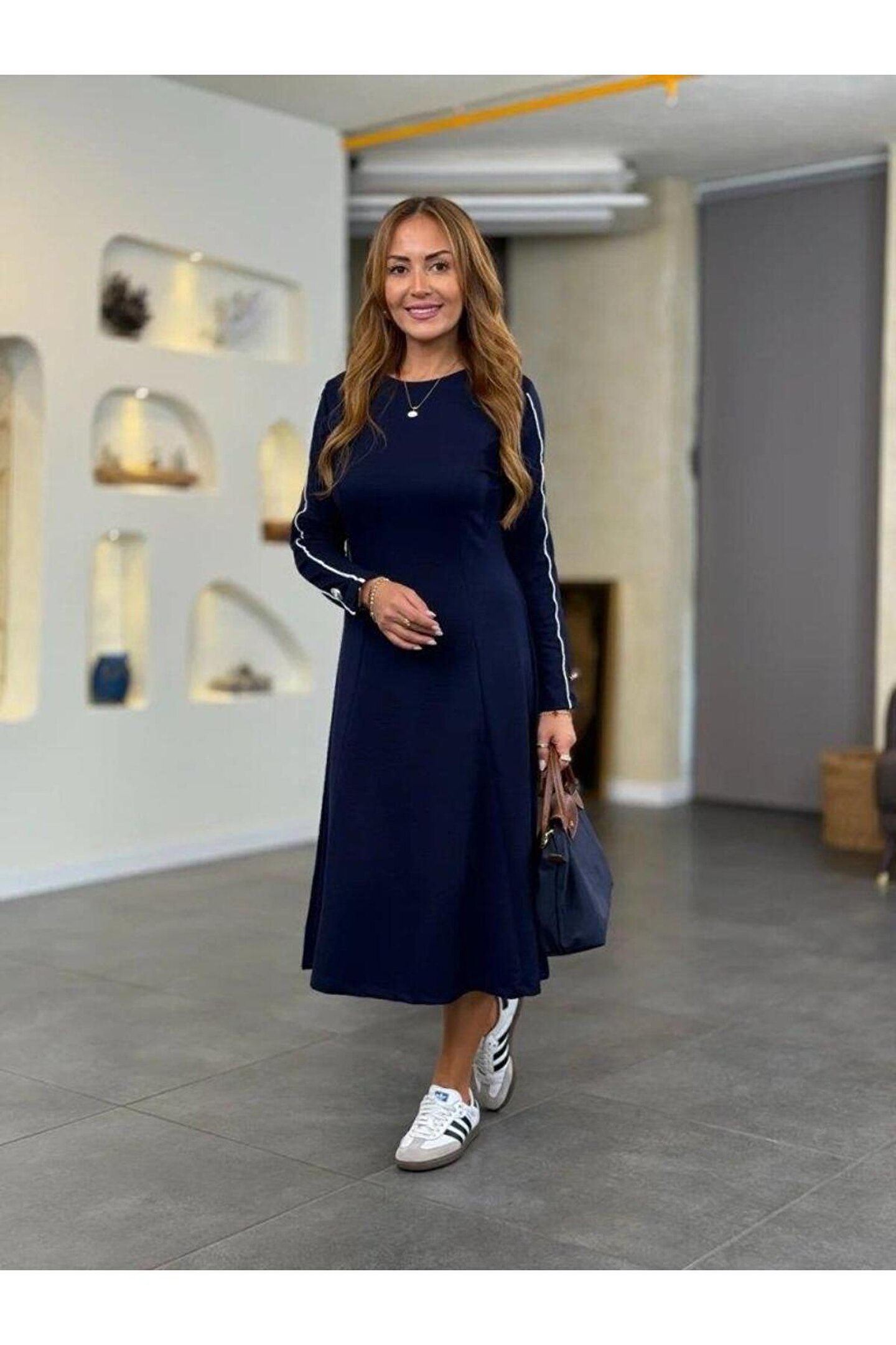 Kadın Uzun Kollu Bisiklet Yaka Midi Modal Elbise