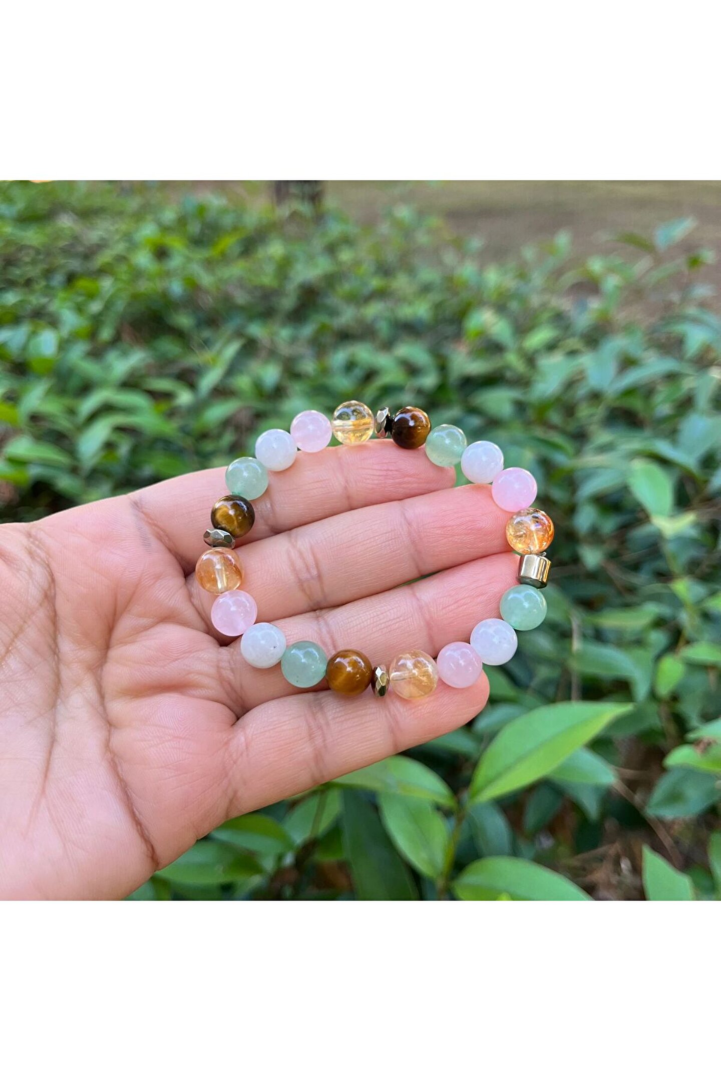Sitrin-Kaplangözü-Pembe Kuvars-Aventurin-Aytaşı-Hematit Karma doğal taş bileklik. ; (8 MM) Tüm ürünlerimiz en iyi kalite doğal taşlardanoluşmaktadır Doğal taşlar doğada da aynı renk ve dokulardaçıkmadığı için görseldeki üründen ufak farklılıklar gösterebilir. ; Tüm ürünlerimizi yedek taş ve misina ile hediye paketiyaparak göndermekteyiz Siparişinizden sonra bilek ölçüsü belirtirsenizistediğiniz ölçüde hazırlanır. ; Ürünler gerçek doğal taş oldukları için renk veşekillerinde ufak değişiklikler gösterebilir (gün ışığı,enerji ve tersebebiyle) Ürünlerinizi şampuan,sabun,kolonya,deterjan gibikimyasallardan korumanız gerekmektedir. ; Karma tasarım bileklik dişil enerji,düşük yıldız,şans başarı,nazar ,bereket,sağlıklı ikili ilişkiler için kullanılır. ; Arada görmüş olduğunuz gold detaylar Hematit taşıdır.;
