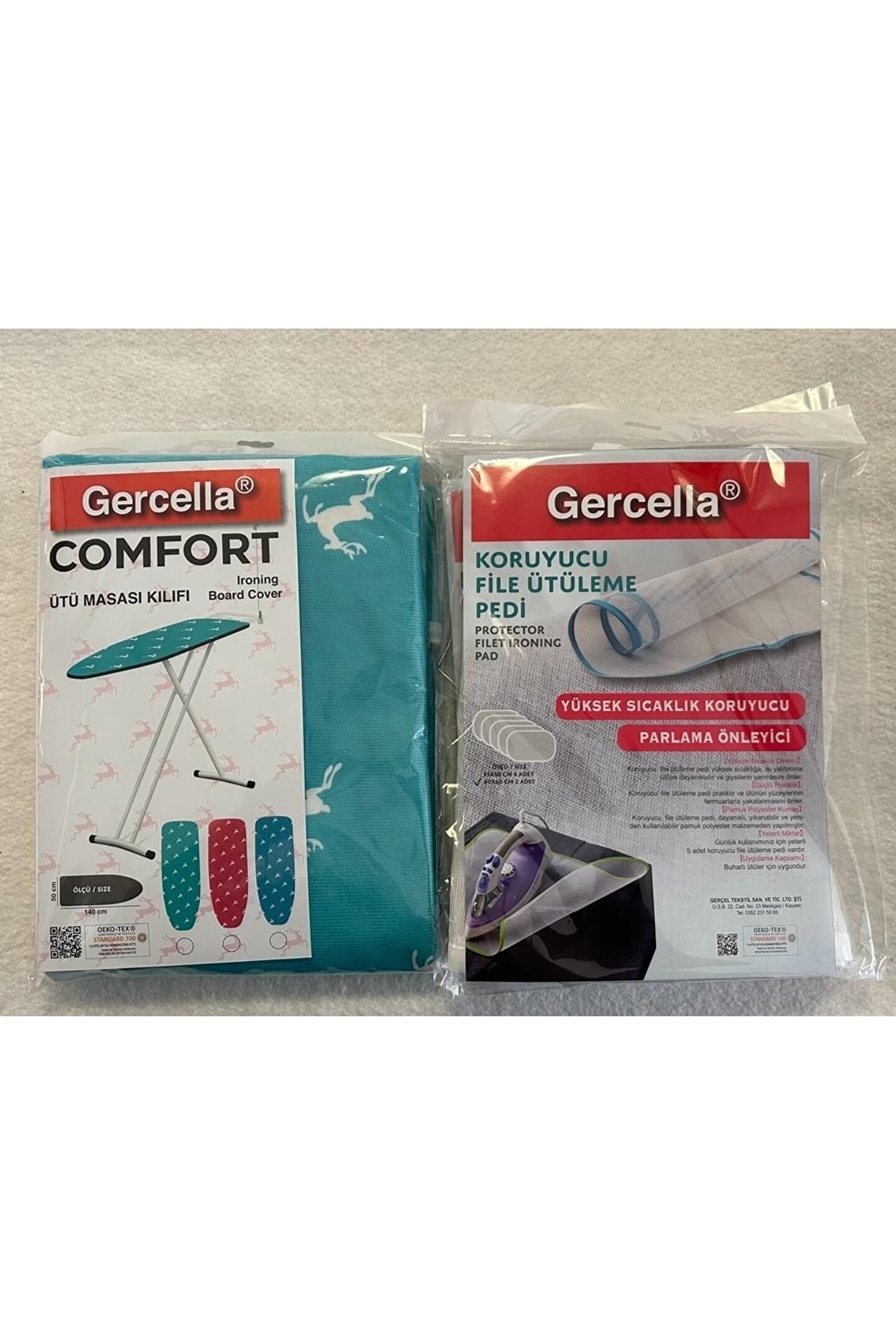 1.GERCELLA COMFORT TURKUAZ Ürün bilgisi: **50*140 cm ebatlarıyla her tip ütü masasına uyar. ; **3mm kalınlığında özel keçe lamineli ,özel dokuma ,230 derece ısıya dayanıklı RENK VERMEZ kumaş **Zor aşınan uzun ömürlü kumaş **Hızlı ütülemeyi kolaylaştıran ve süzülerek gitmeyi sağlayan kaygan yüzey ** Ütüleme süresini en aza indiren kumaş ** Kilitli ip sistemiyle kılıfı istenilen sistem tutma ve kaymayı önleme **%100 polyester 2.KORUYUCU ÜTÜLEME FİLESİ Ölçü : 30*35 cm 3 Adet 40*60cm 2 Adet Yüksek Sıcaklık Koruyucu Parlama Önleyici (Yüksek Sıcaklık Direnci): Koruyucu file ütüleme pedi yüksek sıcaklığa ısı yalıtımına ütüye dayanıklıdır ve giysilerin yanmasını ve parlamasını önler. ; (Güçlü Pratiklik): Koruyucu file ütüleme pedi pratiktir ve ütünün yüzeylerinin fermuarlara denk gelmesini önler. ; (Pamuk polyester Kumaş): Koruyucu file ütüleme pedi , dayanıklı,yıkanabilir ve yeniden kullanılabilir pamuk polyester malzemeden yapılmıştır. ; (Yeterli Miktar): Günlük kullanımınız için yeterli 5 adet koruyucu file pedi vardır (Uygulama Kapsamı): Buharlı ütüler için uygundur;