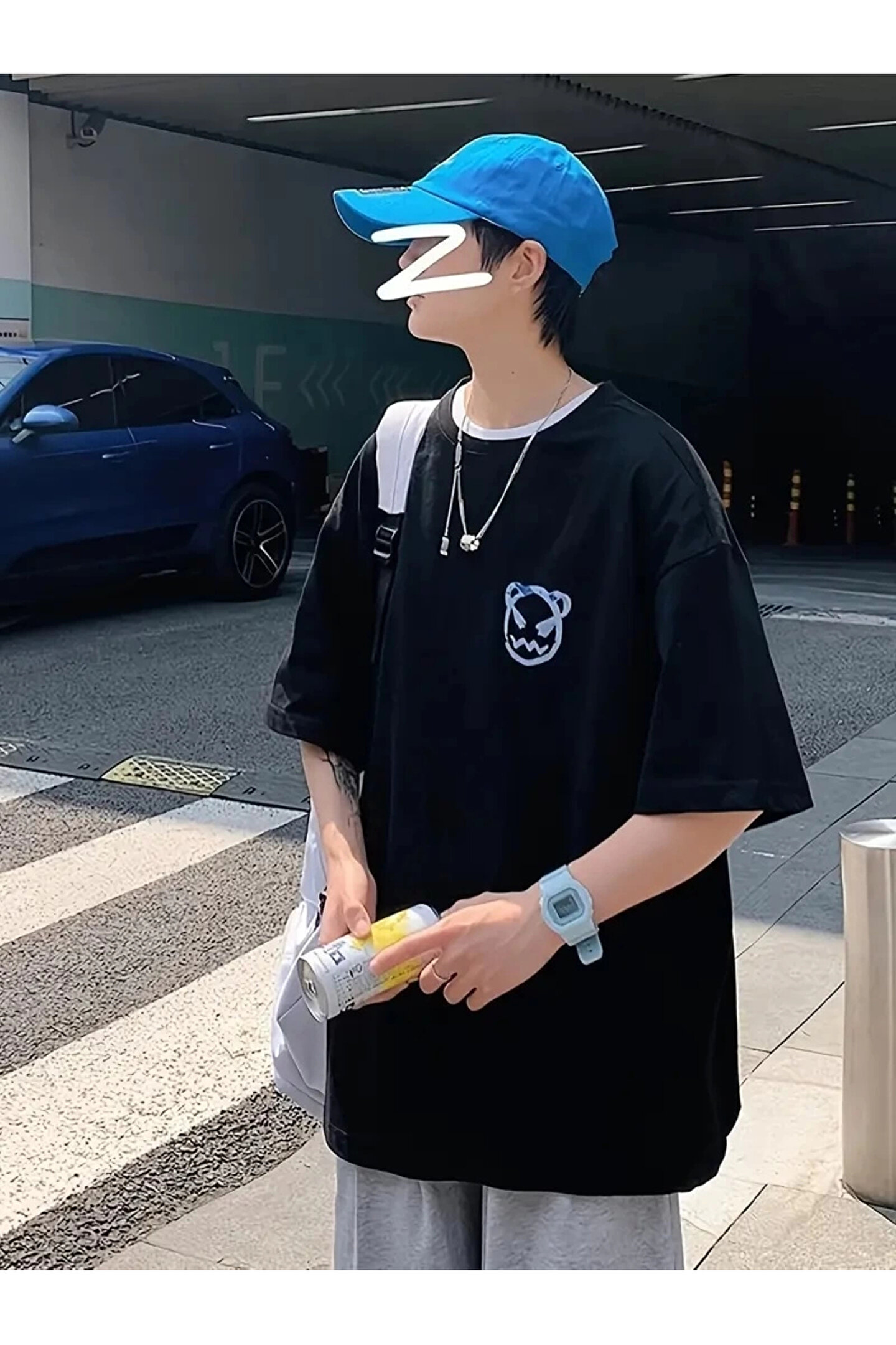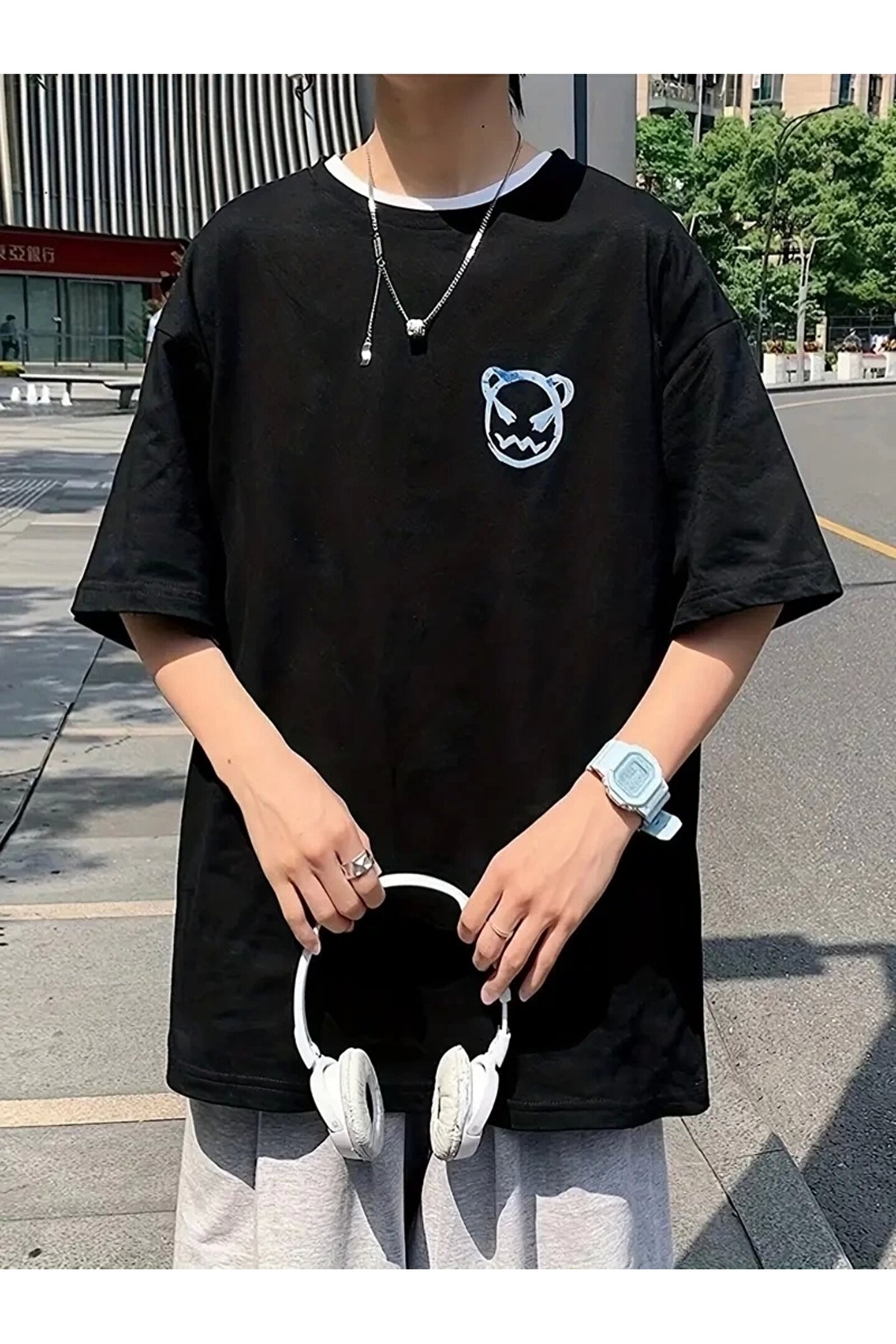 Ghetto Giyim 201 Penye Compack Bisiklet Yaka Kore tarzı sevimli ayı baskı Kısa Kol Erkek t-shirt - Siyah