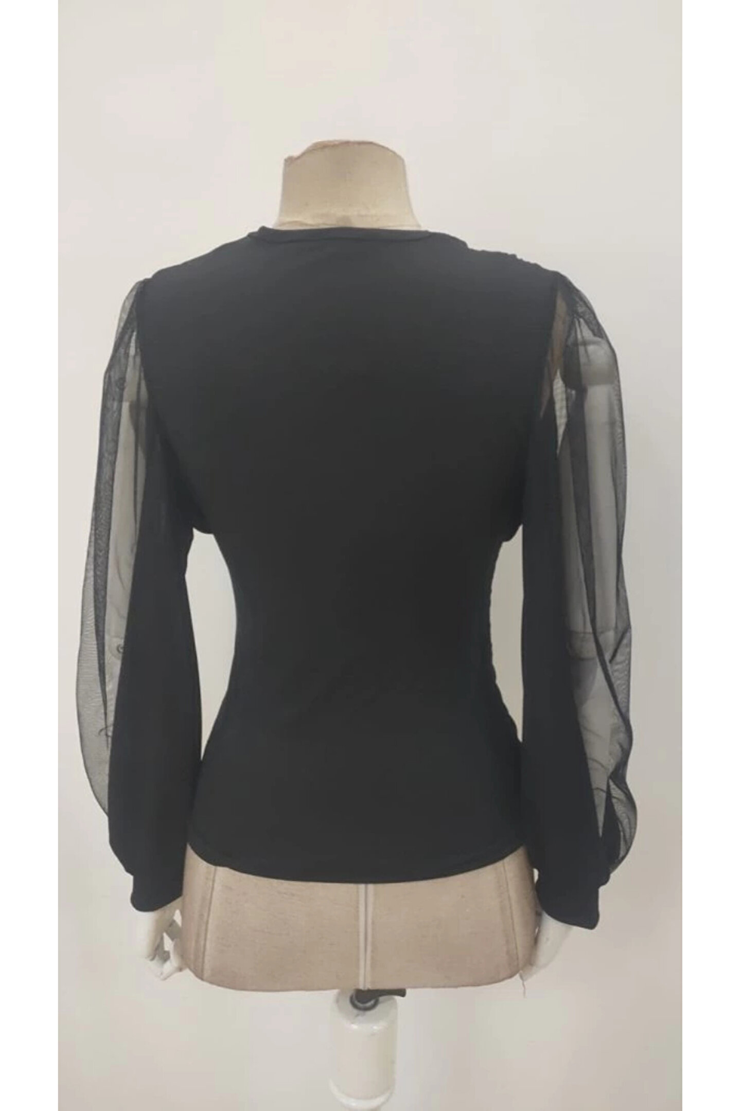 Kadın Uzun Yırtmaç Tül Detaylı Derin V Yakalı Sandy Bluz