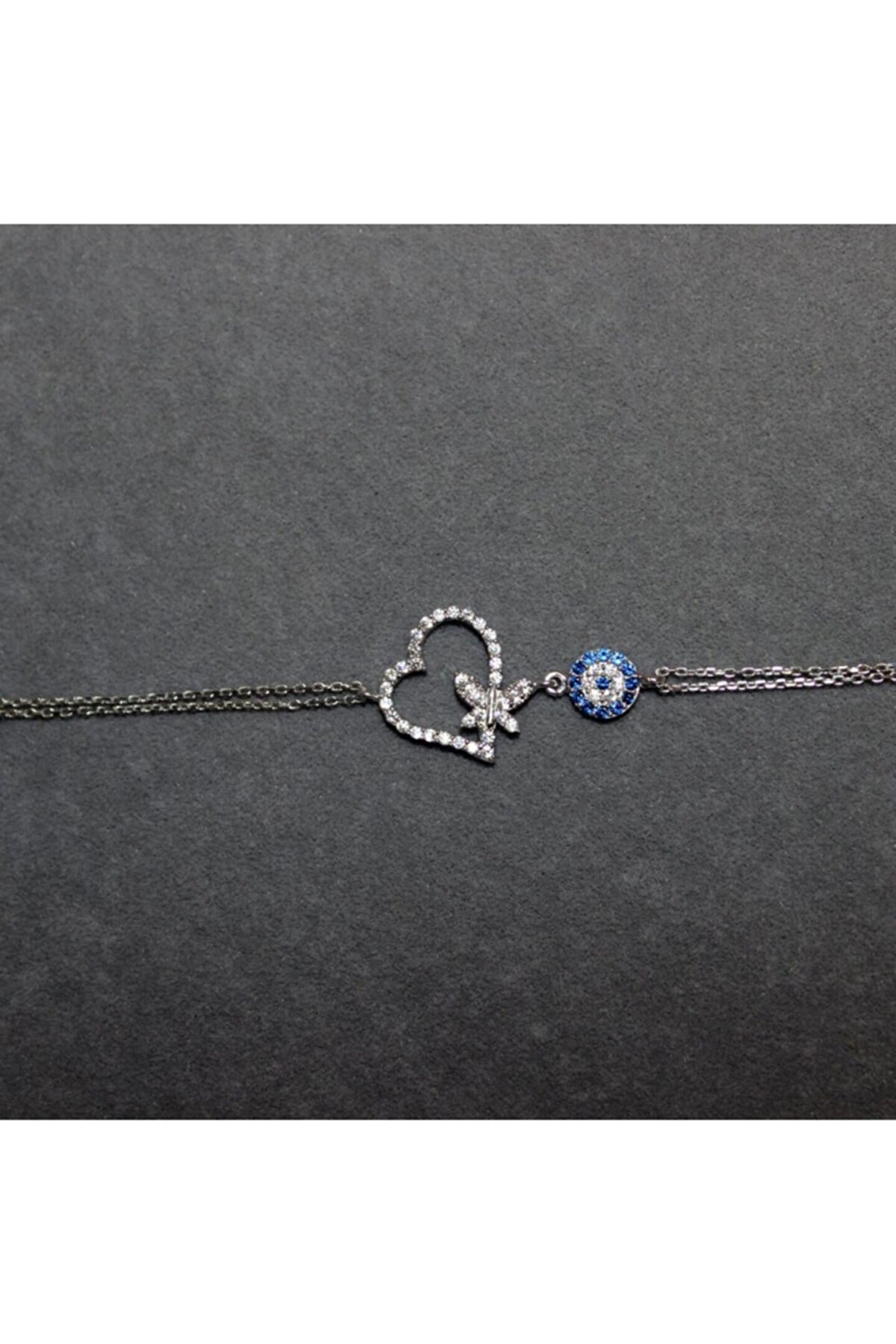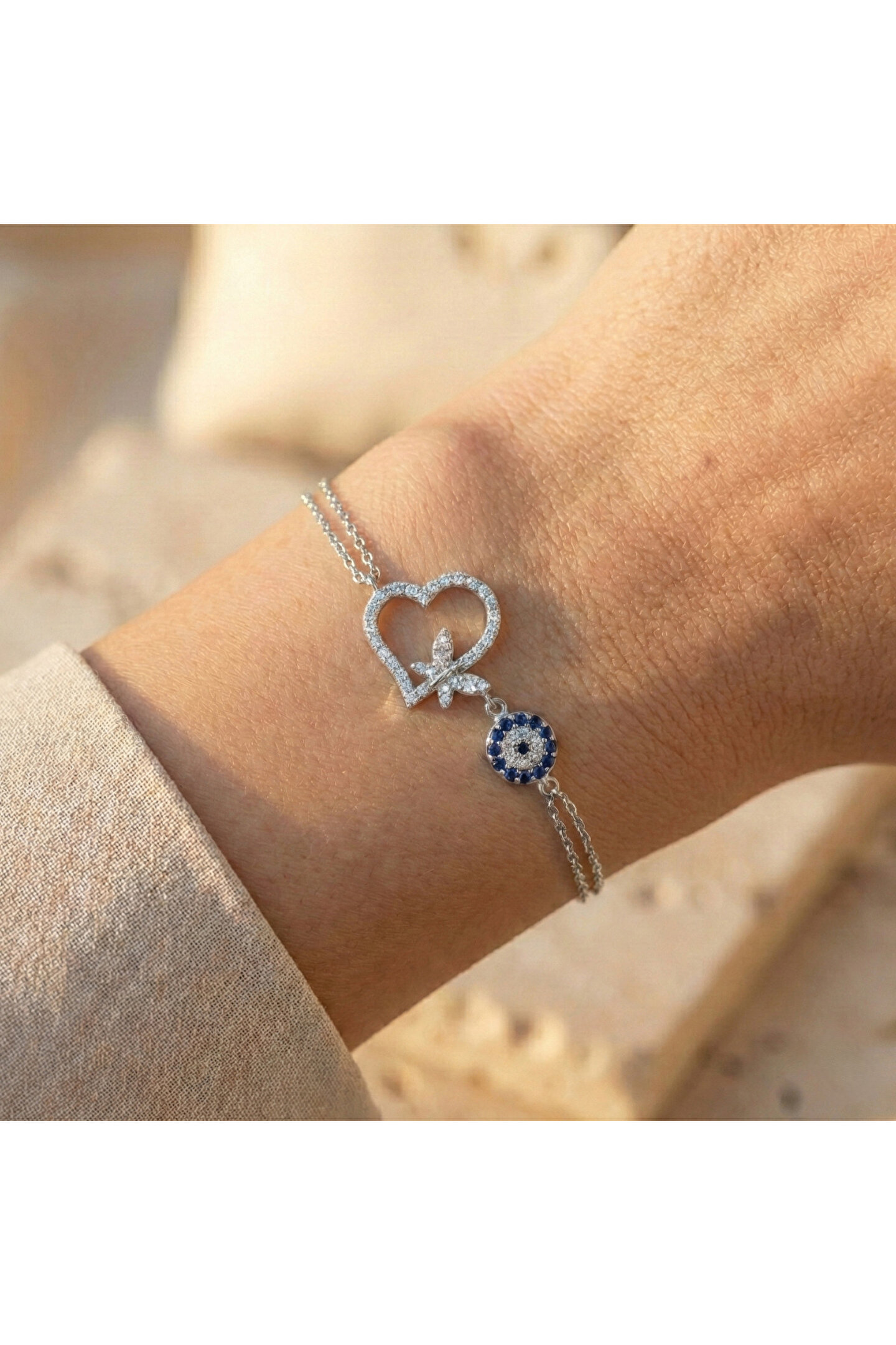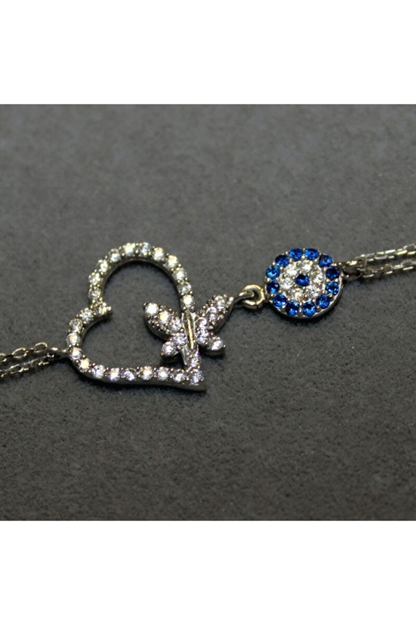 Gümüş zirkon taşlı ve nazar boncuğu detaylı kelebekli kalp bileklik modeli 925 ayar gümüşten ımal edılmıştır.; Gümüş zirkon taşlı ve nazar boncuğu detaylı kelebekli kalp bileklik modeli üzerinde zirkon taşlar kullanılmıştır.; Gümüş zirkon taşlı ve nazar boncuğu detaylı kelebekli kalp bileklik modeli üzerıne rodyum kaplama yapılmıştır.; Rodyum kaplama yapılan gümüş bileklik modellerı parlaklığını uzun süre muhafaza eder ve oksıtlenmesı gecıkır.; Gümüş olan zıncır boyu ayarlanabilir 16-18,5 cm'dır.; Gümüş zirkon taşlı ve nazar boncuğu detaylı kelebekli kalp bileklik modeli %100 el emeğı ıle üretılmıştır.; Gümüş ve değerlı taşlar nedenıyle belırtılen ürün ağırlığında ± %5 sapma olabılmektedır.; Ürün hedıye kutusunda gönderılecektır.; Saat 15:00'a kadar verilen siparişler aynı gün içinde kargoya verilecektir Zirkon taşının Özellikleri; Mücevheratta kullanılan ve çok tercih edilen taş çeşitlerinden biridir.; Zirkon taşı kahverengidir ve ısıtılarak renksiz hale getirilir.; Zirkon taş kahverengi, kırmızı ve sarı renginde kendini gösterir.; Mücevher olarak kullanılan renklerden en çok renksiz olanı tercih edilir.; Zirkon taşının albenisi sadece fiziksel görünümden değil, vücudu rahatlatan zihni kuvvetlendiren duygusal anlamda dengeyi koruyan ve uyumayı kolaylaştırıcı özelliklerinden dolayı da tercih edildiği bilinir.; Ayar925 ayar Net ağırlık 2.25 gram Anti alerji ve kararma önleyici kaplamarhodıum kaplama Zincir boyutuen uzun 18,5 cm en kısa 16 cm ayarlanabilir, Renk beyaz Kelebekli kalp modelinin eni 20.10 mm`dir, boyu 16.30 mm`dir, nazar çapı 6.80 mm`dir.