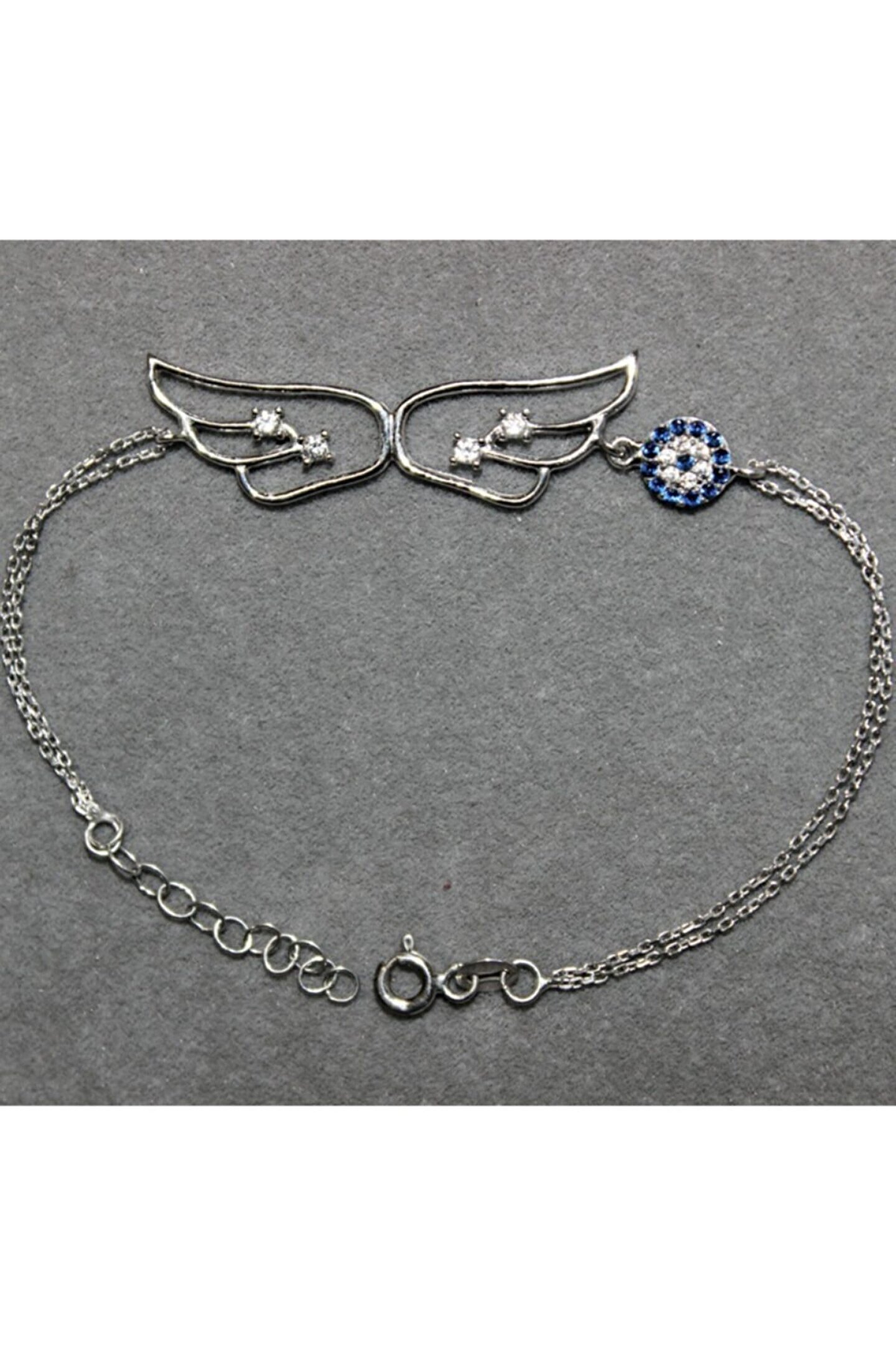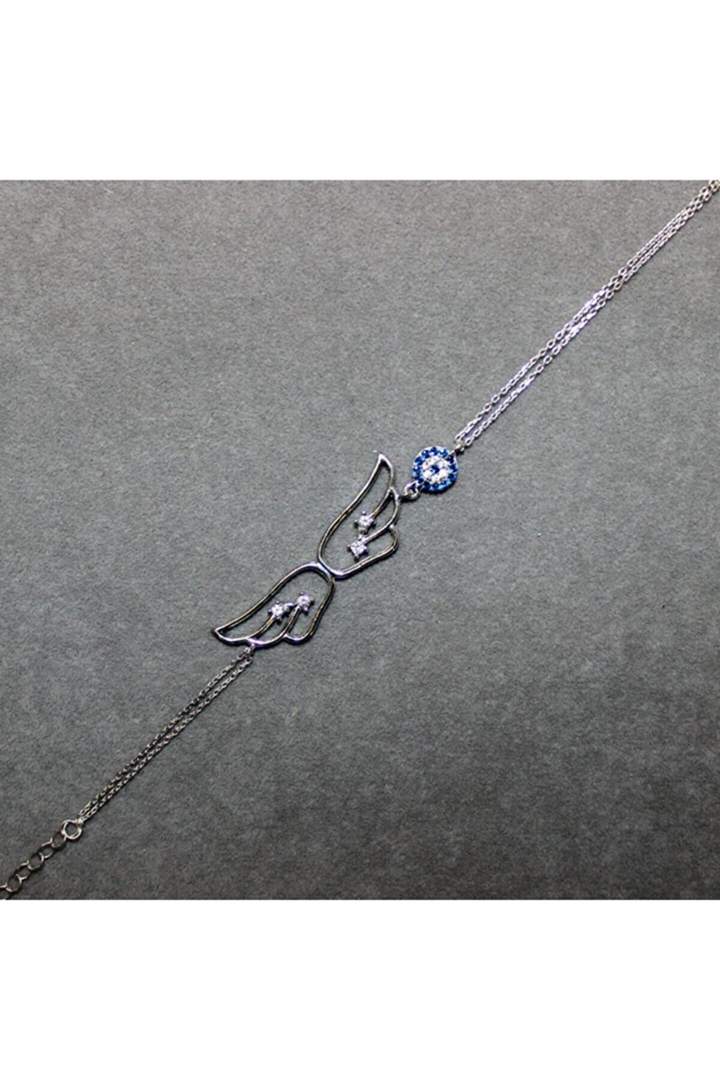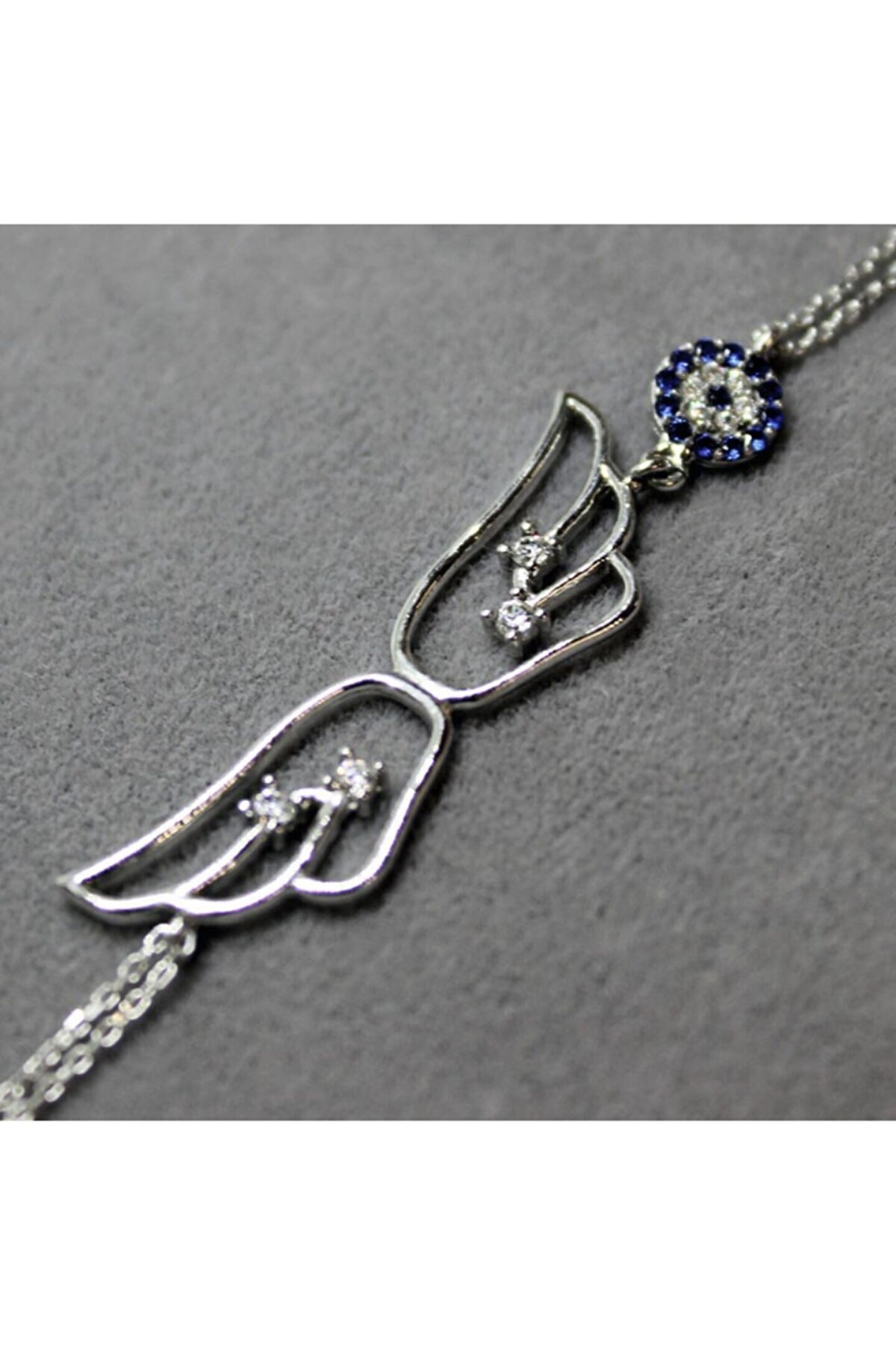 Zarif tasarımıyla dikkat çeken beyaz taşlı melek kanadı bileklik, gümüş rengi ve zirkon taş detaylarıyla göz alıcı bir görünüm sunar; Zirkon taş kullanımı sayesinde, bileklik hem şıklığı hem de parıltıyı bir arada barındırır ve her türlü özel gününüzde ışıltınızı ön plana çıkarır; Melek kanadı motifinin zarif çizgileri, bileklikte modern ve estetik bir dokunuş sağlar, günlük kullanım için idealdir; Gümüş rengi ile klasik ve zamansız bir tarz yaratırken, her türlü kıyafetle kolayca uyum sağlar.; Melek kanadı uzunluğu 11.35 mm, genişliği 38.10 mm, nazarın çapı 6.80 mm.