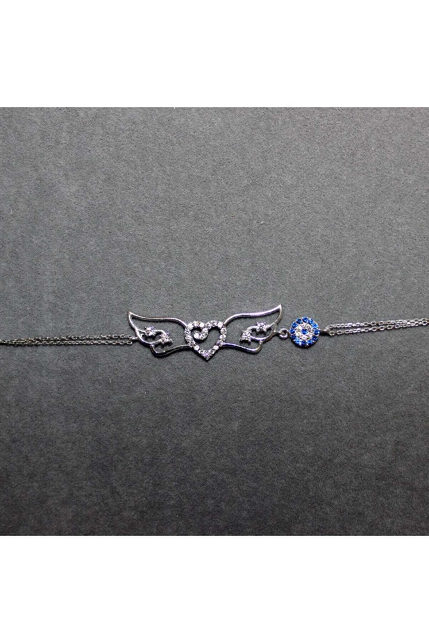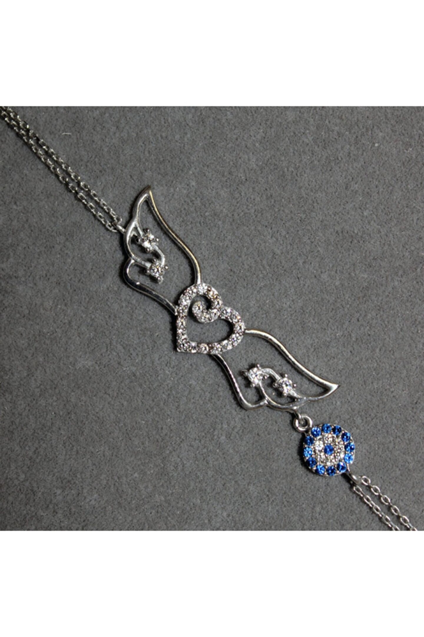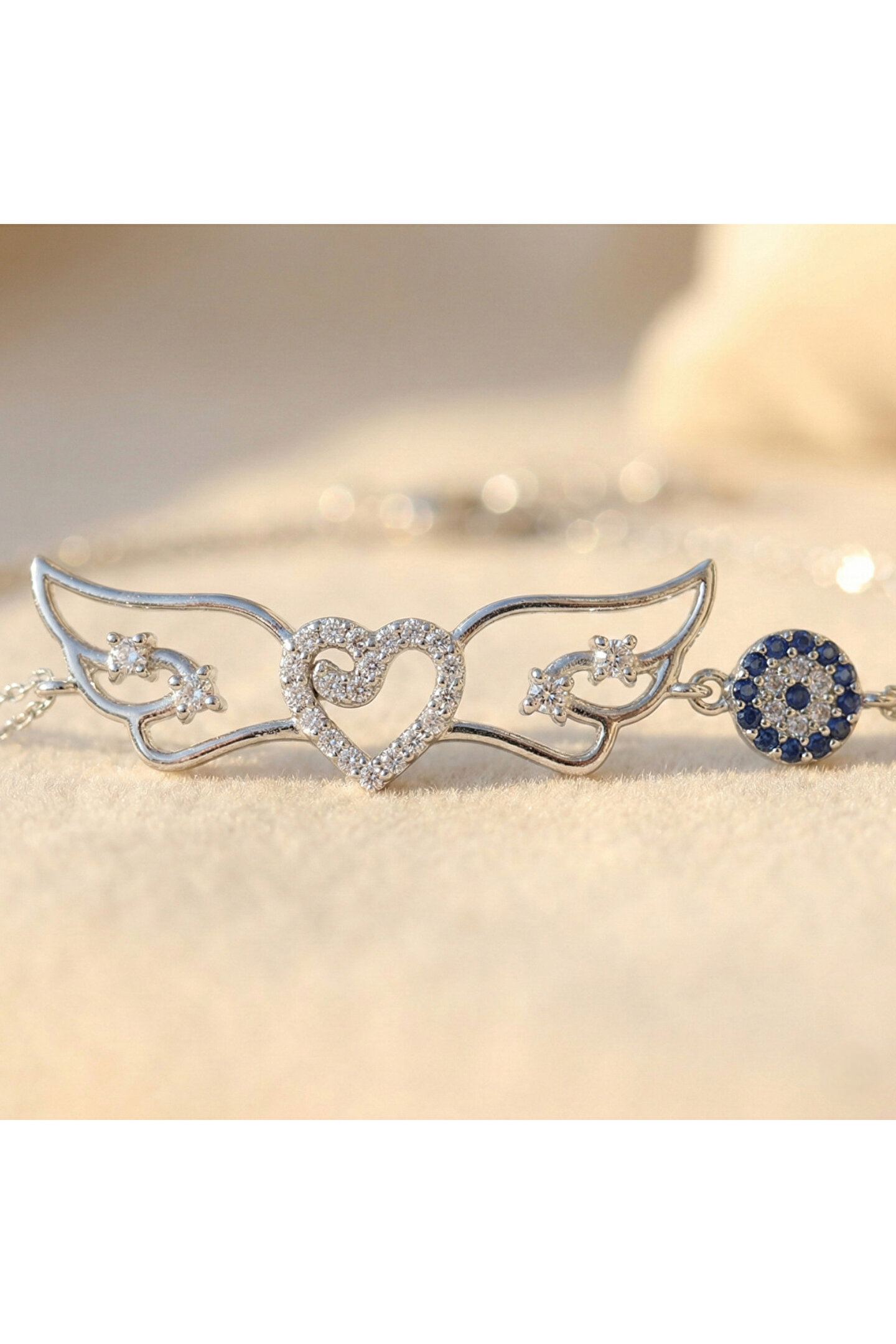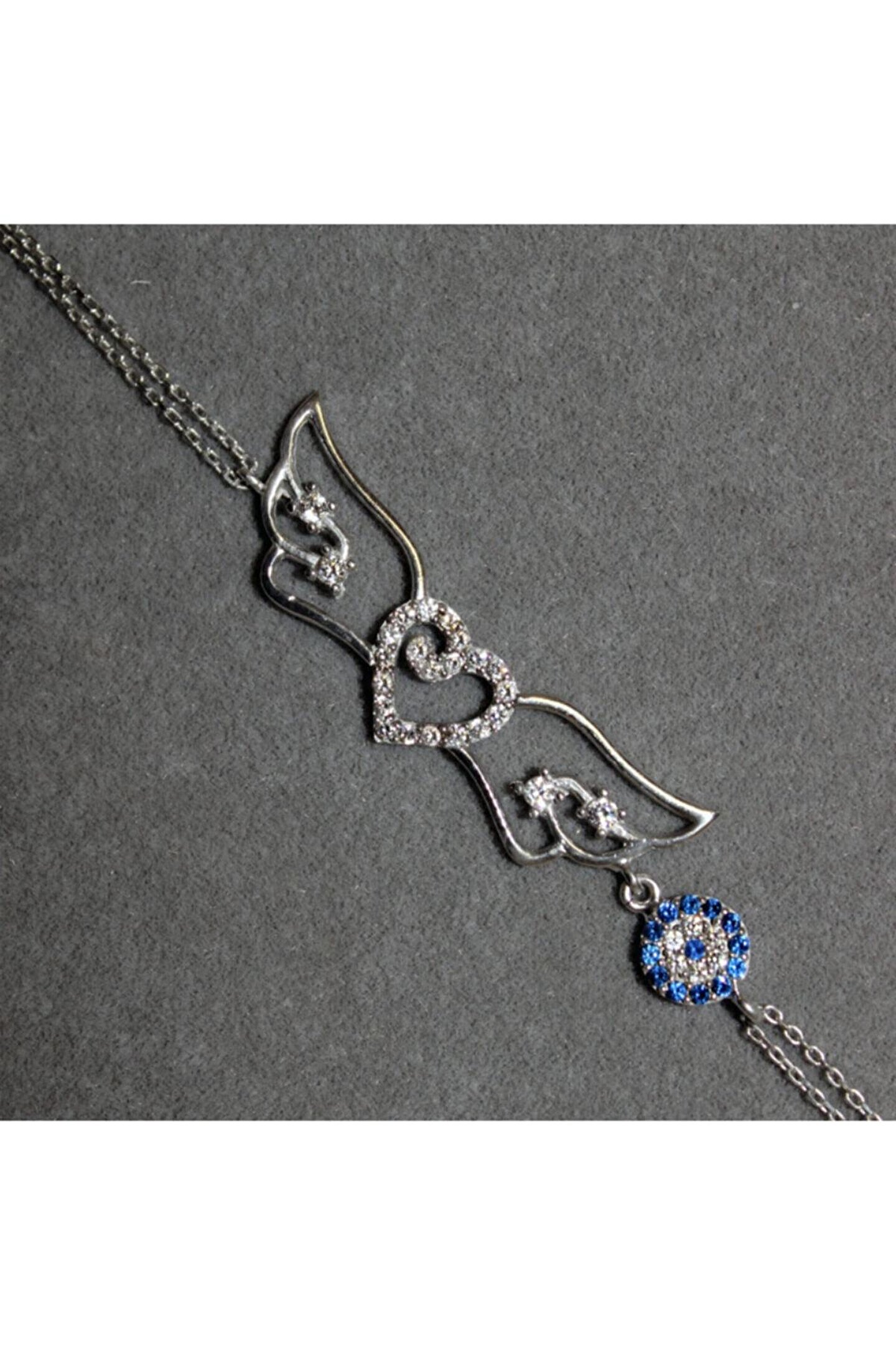 Gümüş zirkon taşlı ve nazar boncuğu detaylı kalpli melek kanadı bileklik modeli 925 ayar gümüşten ımal edılmıştır.; Gümüş zirkon taşlı ve nazar boncuğu detaylı kalpli melek kanadı bileklik modeli üzerinde zirkon taşlar kullanılmıştır.; Gümüş zirkon taşlı ve nazar boncuğu detaylı kalpli melek kanadı bileklik modeli üzerıne rodyum kaplama yapılmıştır.; Rodyum kaplama yapılan gümüş bileklik modellerı parlaklığını uzun süre muhafaza eder ve oksıtlenmesı gecıkır.; Gümüş olan zıncır boyu ayarlanabilir 16-19 cm'dır.; Gümüş zirkon taşlı ve nazar boncuğu detaylı kalpli melek kanadı bileklik modeli %100 el emeğı ıle üretılmıştır.; Gümüş ve değerlı taşlar nedenıyle belırtılen ürün ağırlığında ± %5 sapma olabılmektedır.; Ürün hedıye kutusunda gönderılecektır.; Zirkon taşının Özellikleri; Mücevheratta kullanılan ve çok tercih edilen taş çeşitlerinden biridir.; Zirkon taşı kahverengidir ve ısıtılarak renksiz hale getirilir.; Zirkon taş kahverengi, kırmızı ve sarı renginde kendini gösterir.; Mücevher olarak kullanılan renklerden en çok renksiz olanı tercih edilir.; Zirkon taşının albenisi sadece fiziksel görünümden değil, vücudu rahatlatan zihni kuvvetlendiren duygusal anlamda dengeyi koruyan ve uyumayı kolaylaştırıcı özelliklerinden dolayı da tercih edildiği bilinir.; Ayar925 ayar Net ağırlık 2.94 Anti alerji ve kararma önleyici kaplamarhodıum kaplama Zincir boyutuen uzun 19cm en kısa 16 cm ayarlanabilir, Renk beyaz.; Orta parçada melek kanadının genişliği 37.50 mm, nazar parçasının boyu 6.80 mm`dir.