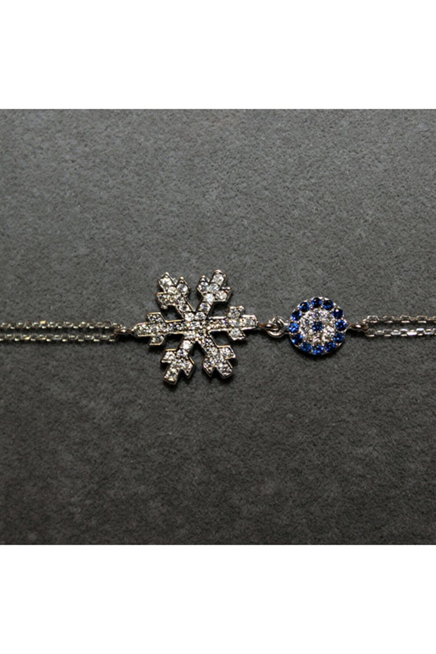 Zarif tasarımıyla dikkat çeken bu bileklik, gümüş rengin asaletini yansıtır; Zirkon taş detayları ile göz alıcı bir parlaklık sunar ve her türlü kıyafetle uyum sağlar; Özel günlerde veya günlük kullanım için ideal bir aksesuar seçeneği olarak öne çıkar; Kaliteli malzeme kullanımı sayesinde uzun süreli kullanım vaat eder.; Kar tanesi çapı 14.45 mm, nazarın çapı 6.80 mm.