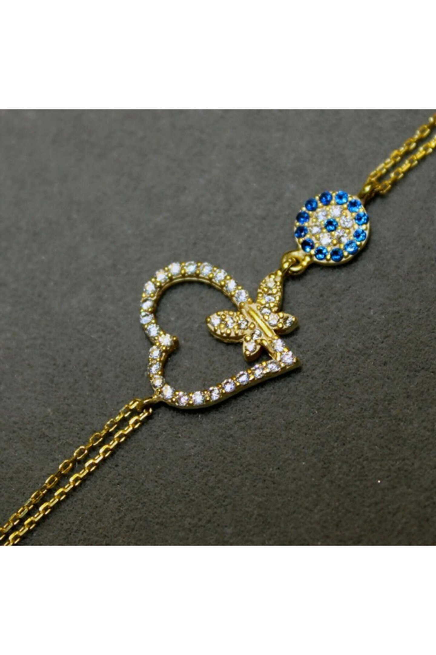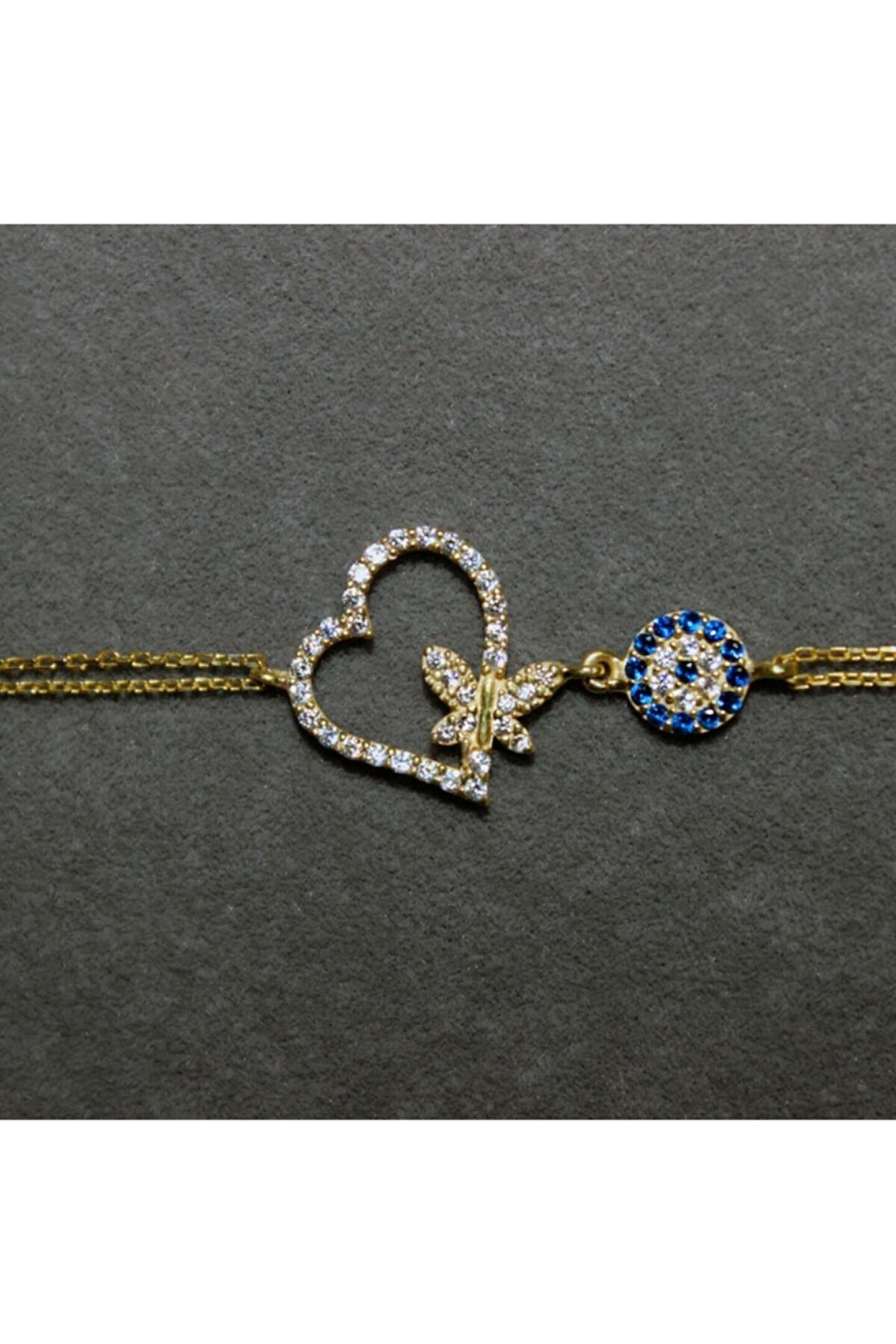 Zarif tasarımıyla dikkat çeken taşlı kelebekli kalp bileklik, gümüş rengi ve zirkon taş detaylarıyla göz alıcı bir görünüm sunar; Zirkon taş kullanımı sayesinde, bileklik hem şıklığı hem de parıltıyı bir arada barındırır ve her türlü özel gününüzde ışıltınızı ön plana çıkarır; Kalp şeklindeki tasarımıyla sevginin ve aşkın sembolü olan bu bileklik, anlamlı anlarınıza eşlik ederken zarafetiyle de stilinizi tamamlar; Gümüş rengi sayesinde farklı renklerle kolayca uyum sağlar ve çeşitli kıyafet kombinlerinizle mükemmel bir uyum yakalar.; Kalp parçasının boyu 16.40 mm, eni 19 mm, nazar parçasının çapı 6.80 mm`dir.