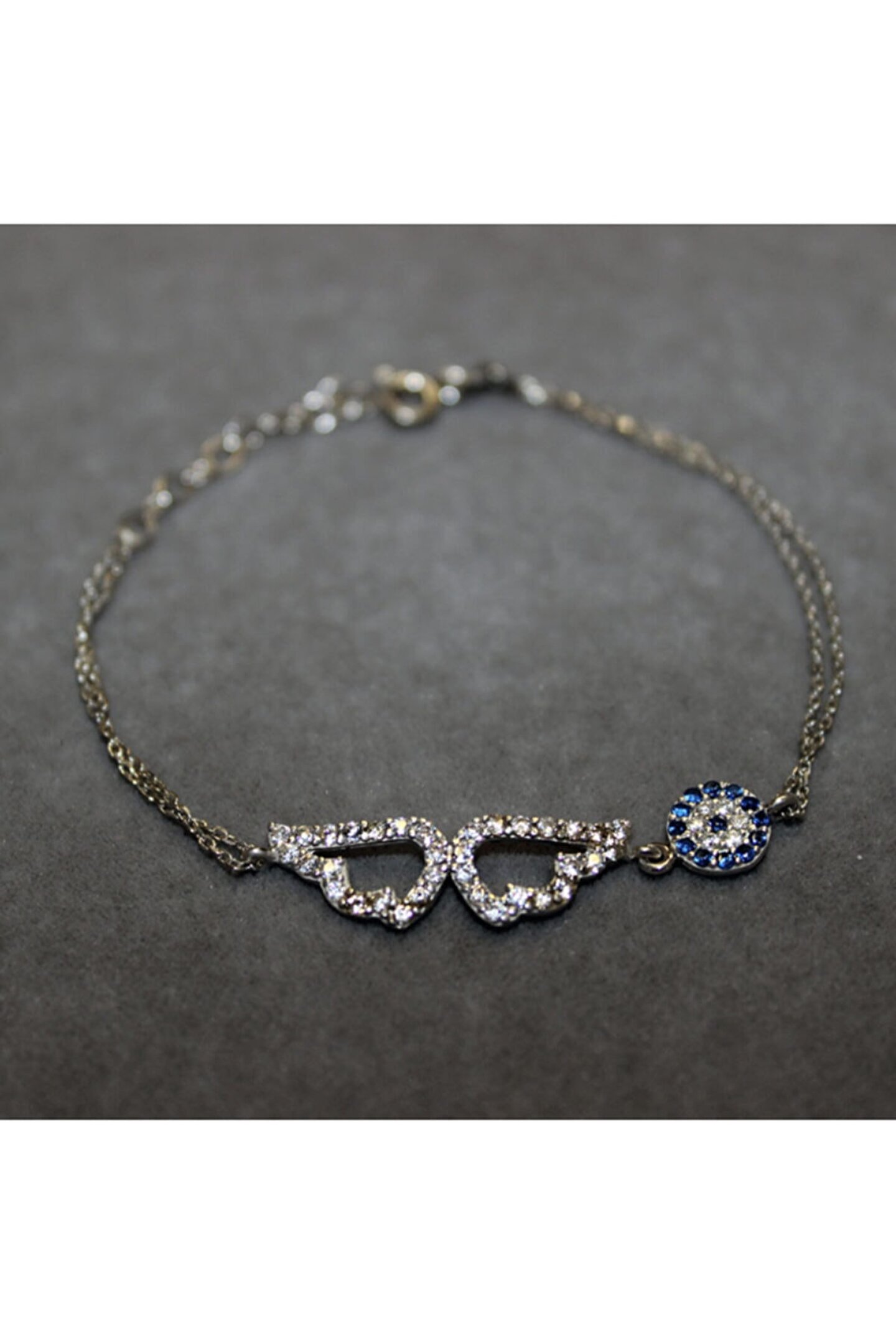 Zarif tasarımıyla dikkat çeken bu bileklik, gümüş rengin asaletini yansıtır; Zirkon taş detayları ile göz alıcı bir parlaklık sunar ve her türlü kıyafetle uyum sağlar; Melek kanadı motifinin zarafeti, bileklikte hayat bulur ve stilinizi tamamlar; Özel günlerinizde veya günlük kullanım için ideal bir aksesuar seçeneği olarak öne çıkar.; Kanat genişliği 25.27 mm, boyu 8.25 mm, nazarın çapı 6.80 mm.