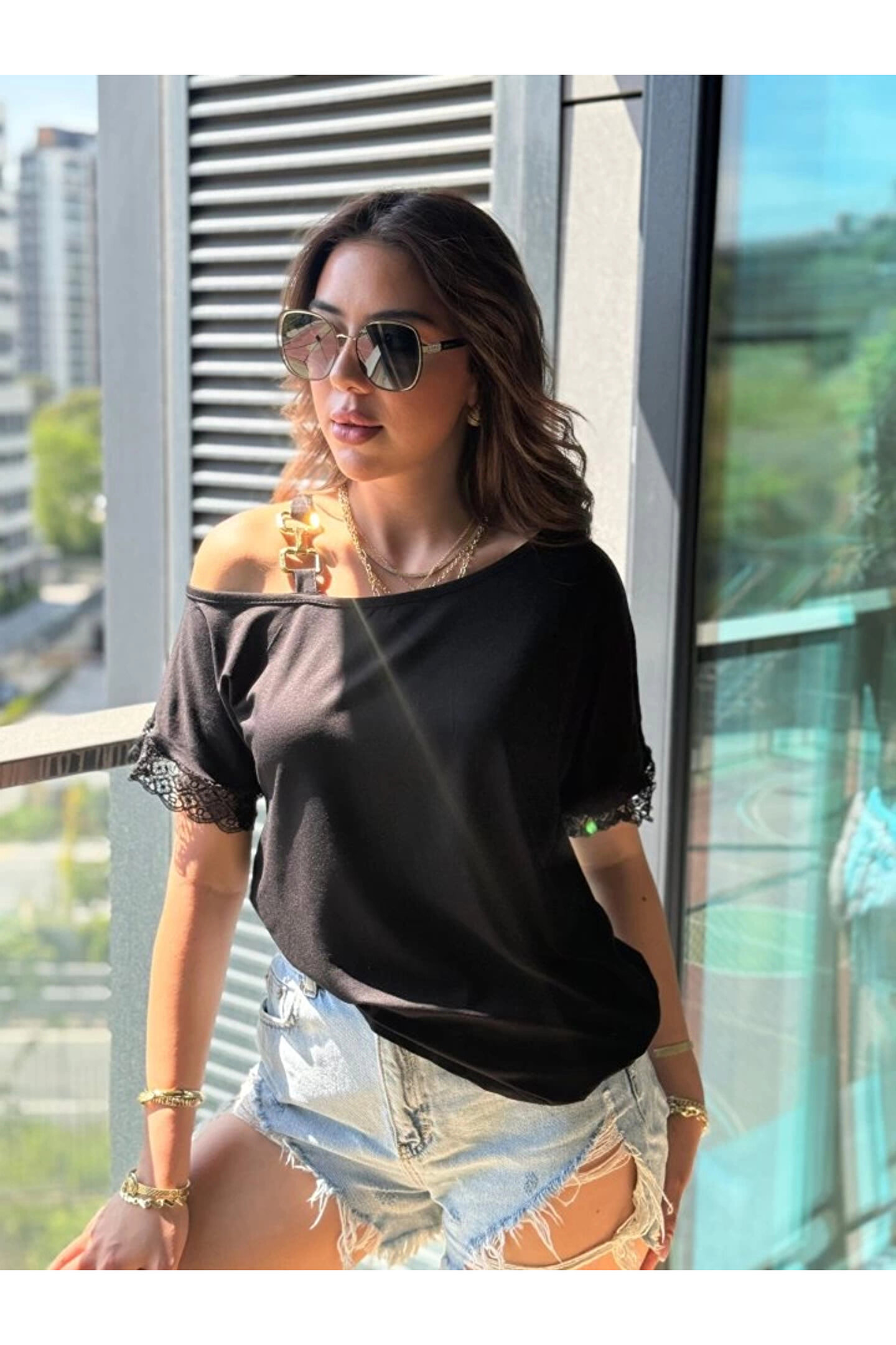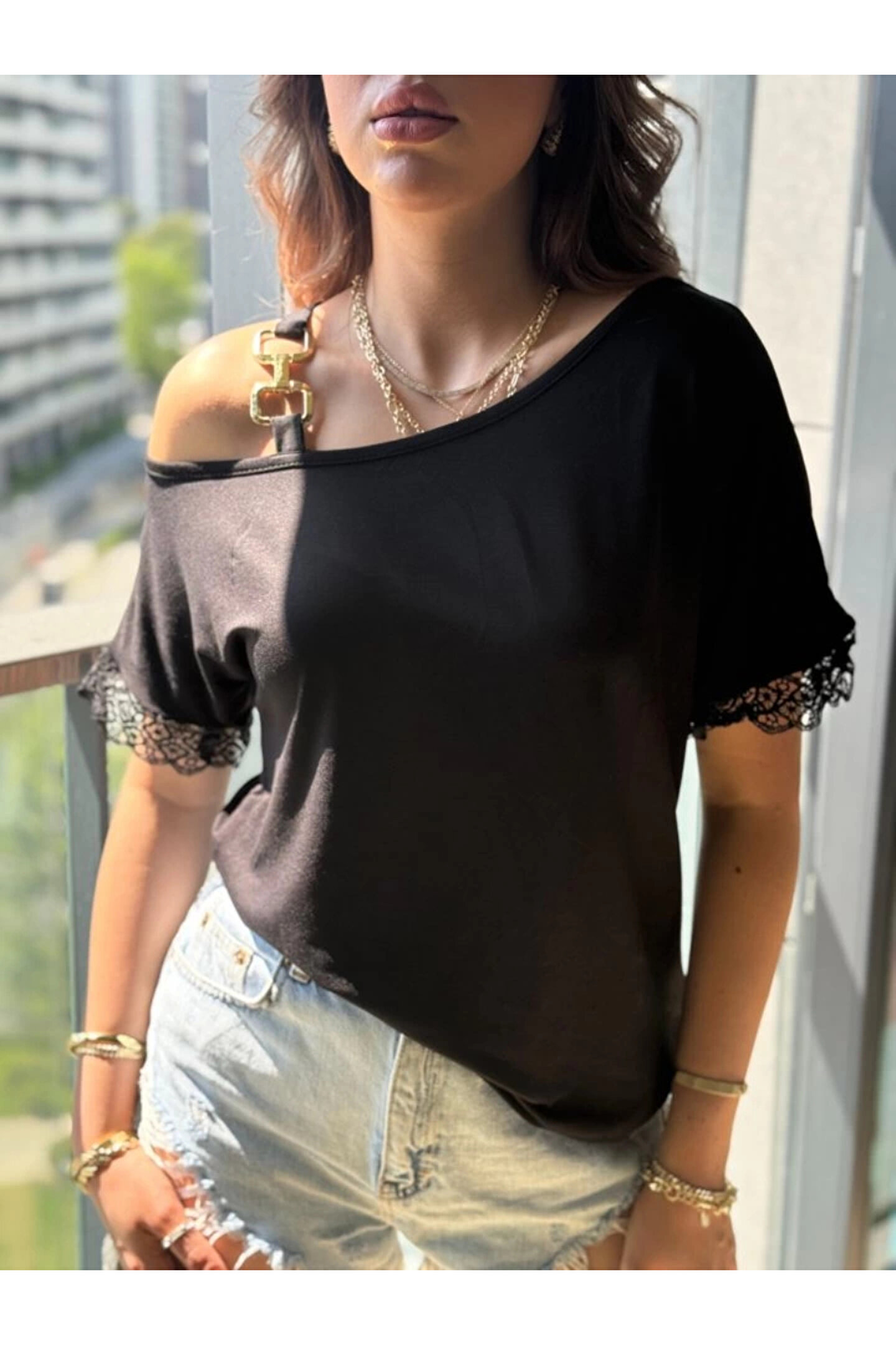 Kadın Tek Omuzu Askılı Kısa Kollu Toka Detaylı Dantelli Viskon Bluz