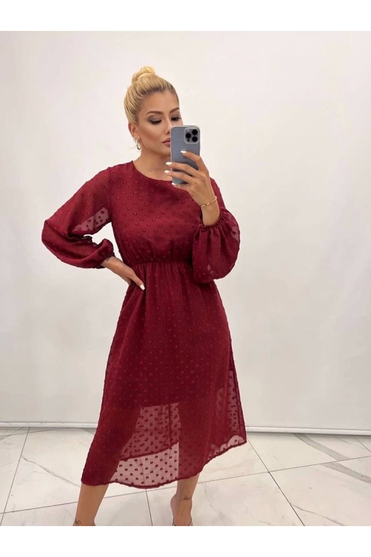 Kadın Uzun Kollu Astar Detay Fırsat ürün Ponpon şifon Elbise