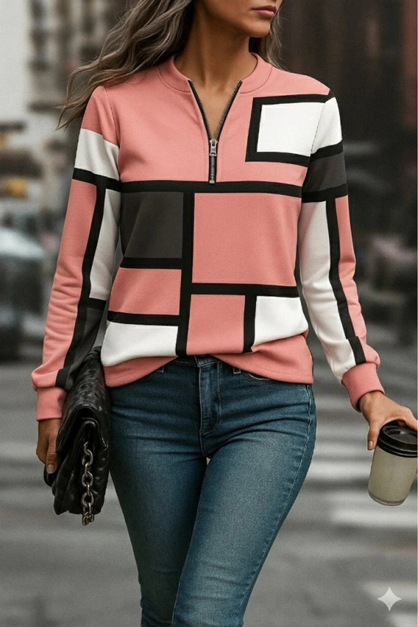 Kadın Uzun Kollu Yakadan Fermuarlı Desenli şardonlu Dalgıç Bluz