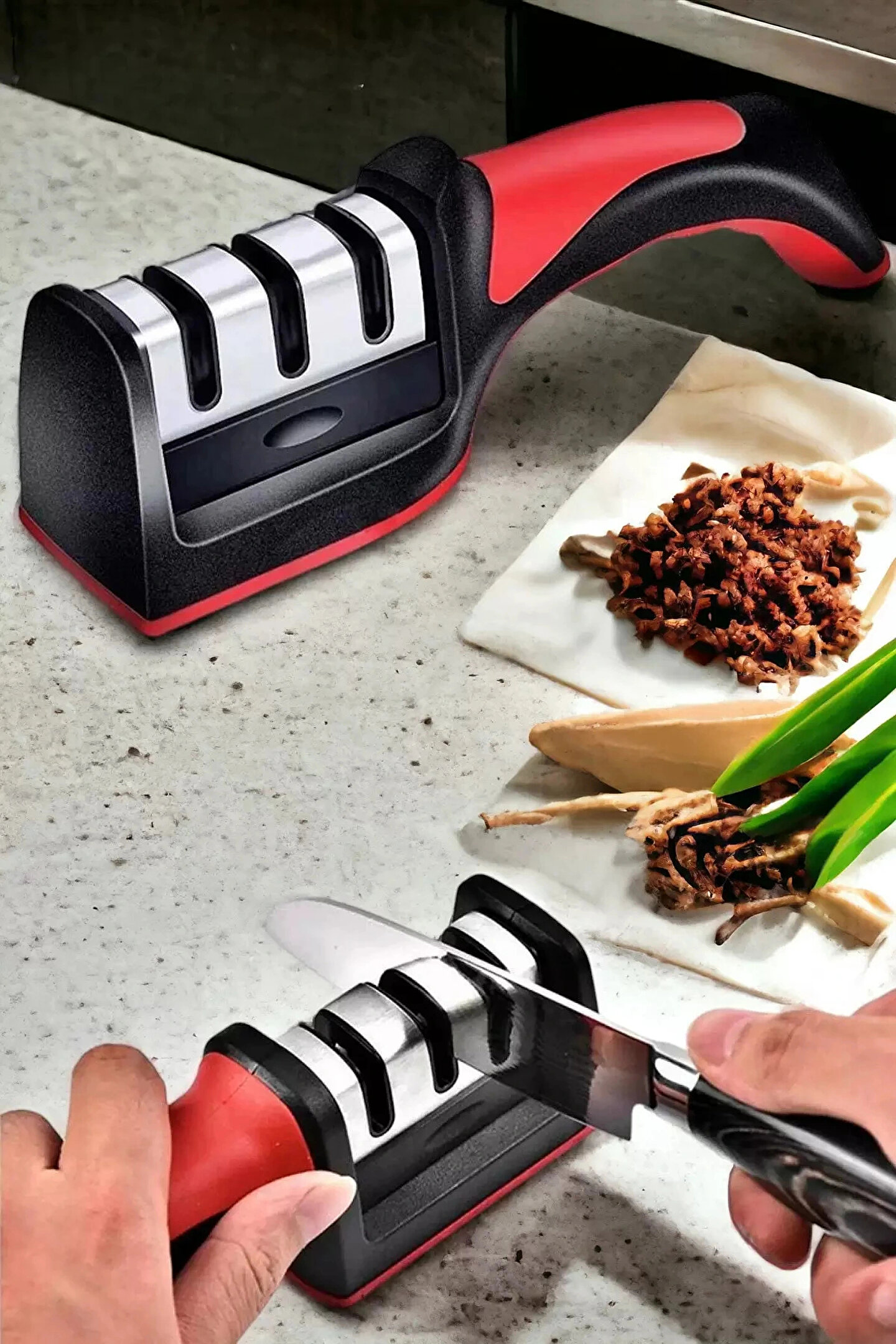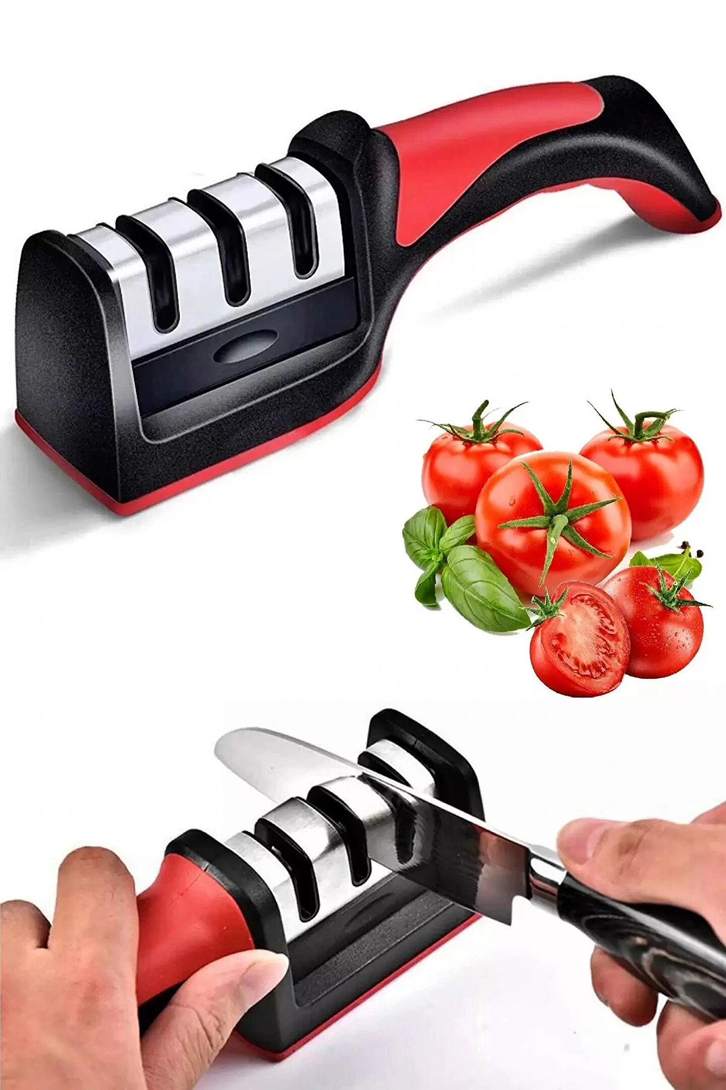 Mallame Profesyonel Tungsten Çelik Bıçak Bileme Aleti Mutfak Makası 3 Açılı Elmas Uçlu Bıçak Bileyici ; Dayanıklı ABS plastikten hazırlanmış, güçlü, dayanıklı ve uzun süre kullanmanıza olanak sunar. ; Kullanımı Kolay: İster sağ elinizi ister sol elinizi kullanabilirsiniz. ; Maksimum tutuş için ergonomik olarak rahat tutma kolu sayesinde bıçaklar bilenirken güvenli kullanım sağlar ; Bıçak bileyicinin uzun süreli kullanımı için dayanıklı ve yüksek kaliteli malzemeler kullanılarak üretilmiştir. ; Ergonomik şekilli tutamak ve kaymaz tasarım, bileyicinin kullanımını çok rahat hale getirir ; Elinizde taşınabilir taşlarla değerli bıçaklarınıza artık zarar vermeyin ; Hızlı, etkili bileme için bıçağı her bir yuvaya yerleştirin ve bıçağı birkaç kez yavaşça çekin. ; Mutfağınızda değerlendirebileceğiniz her nevi bıçak, makas, satır gibi kesici aletlerinizi bileyebilirsiniz. ; Bileme Kullanım ve Talimatları ; Kaba taşlama: Kör bıçaklar ; Seramik taşlama: Seramik bıçaklar ; İnce taşlama: El bıçakları ; 1. Bileme Yuvası: "seramik" aşaması (hazırlık) keskinleştirmeden önce hasarlı bıçakları ve düzleştirme bıçaklarını onarmak için kullanın ; 2. Bileme Yuvası: "kaba" aşaması (keskinleştirme) bıçağı keskinleştirir ve keskin uçlu "V" şekline gelmesini sağlar. ; 3. Bileme Yuvası: "ince" aşaması (ince ayar) bıçağı parlatır ve neden olabilecek herhangi bir yüzey düzensizliğini dengeler. ; Ürün Özellikleri ; Ürün Ağırlığı: 150 gr. ; Ürün Boyutu: 21cm x 5cm x 6.3cm ; Gövde Malzemesi: ABS Plastik, ; İç Malzemesi: 304 Paslanmaz çelik, ; Bileme Malzemesi: Elmas, Tungsten çelik ve seramik ; Renkler: Kırmızı, Siyah, Yeşil ; Not: İş bıçakları, tırtıklı bıçaklar için uygun değildir. ; Not: Bıçak bileyici bulaşık makinesinde yıkanması tavsiye edilmez elde yıkayın. ; Not: Çocukların erişemeyeceği yerlerde saklayın. ; Paket İçeriği: Satın aldığınız paket içerisinde 1 adet 3 açılı elmas uçlu bıçak bileyici bulunmaktadır. ;