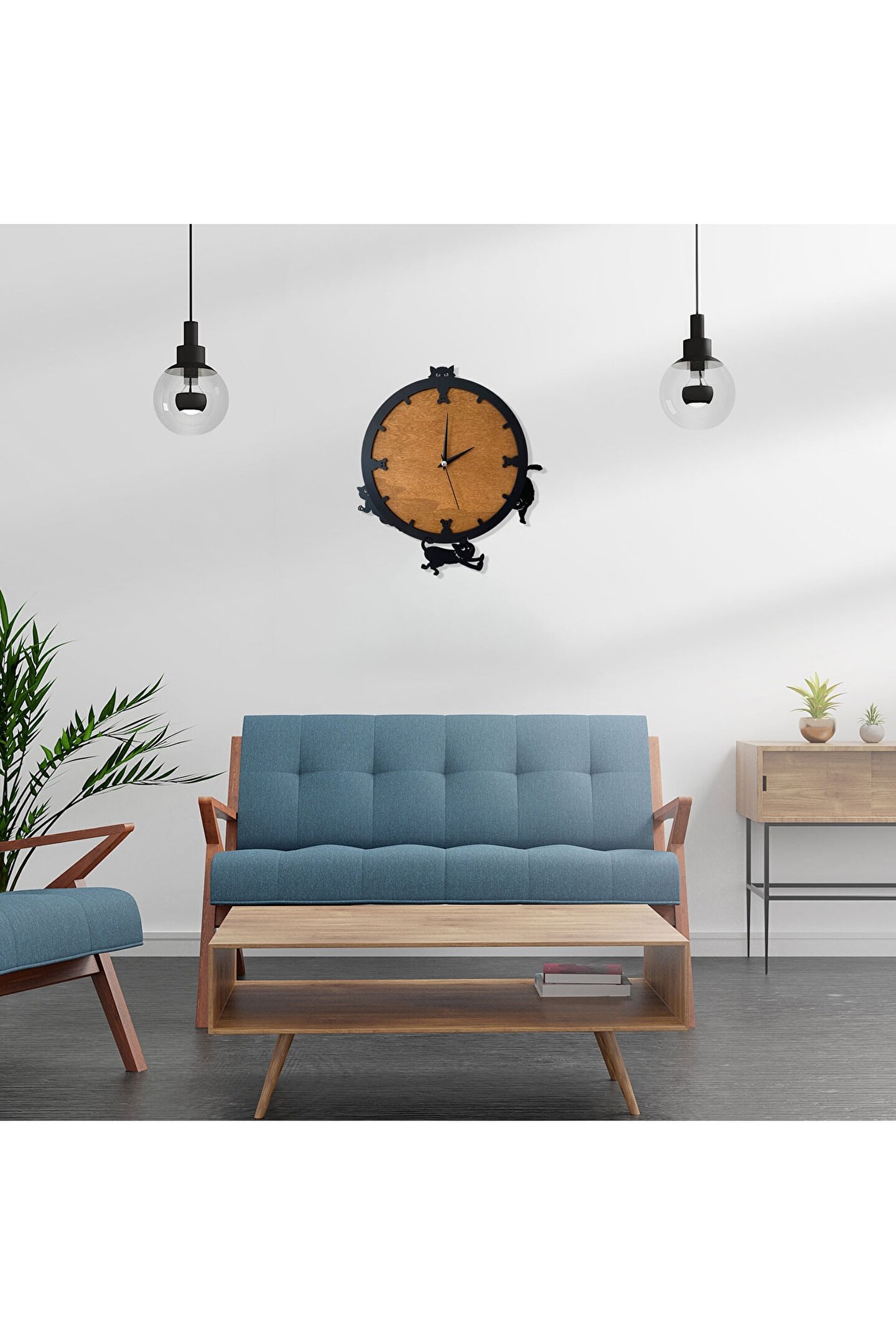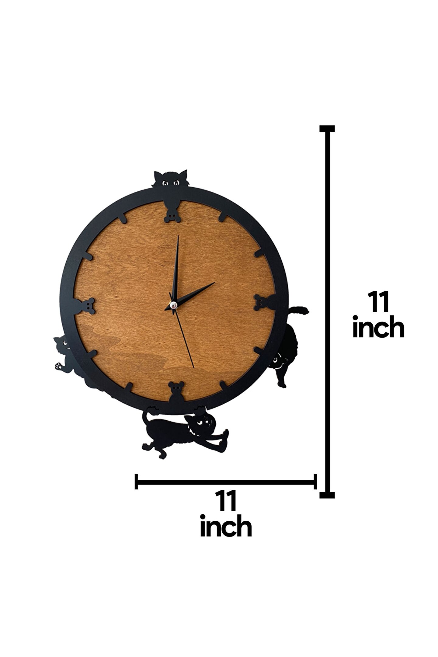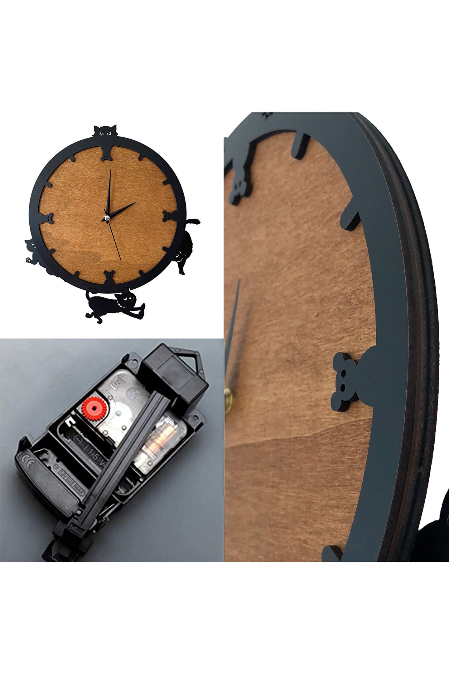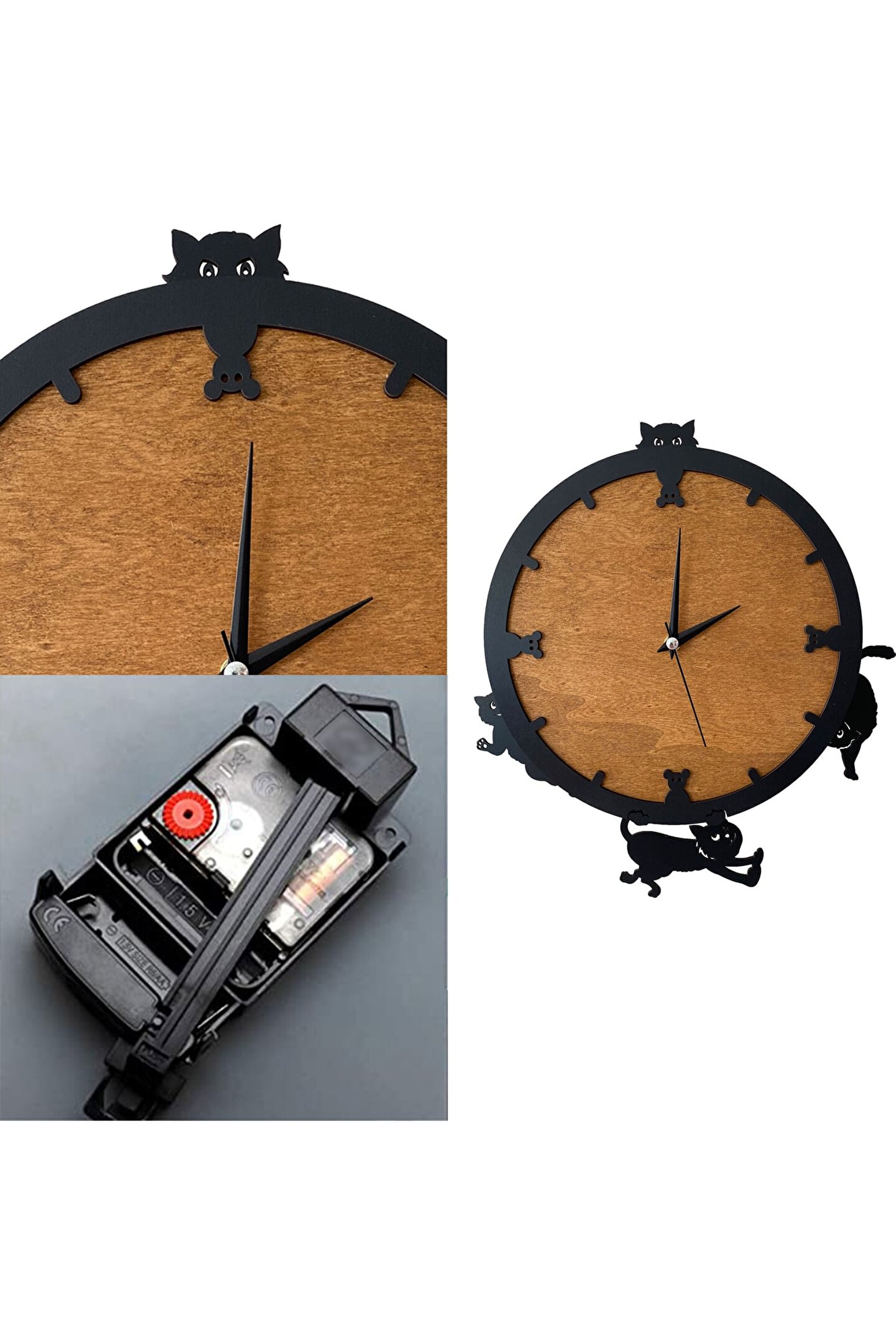 Goodtime dekoratif sallanır sarkaçlı kedi figürlü duvar saati ; Ürün özellikleri: ; - 1. Kalite Ahşap Mdf Malzemeden üretilmiştir. ; - Ürün tamamen el yapımıdır. (hand made) ; - 2 adet AA pil ile çalışır. ; - 1 adet pil, saati çalıştırır; diğer pil sarkacıhareket ettirir. ; - Her saniyede “Saat etrafındaki dört kedi”sağa solahareket eder. ; - Mekanizması yüksek kaliteli sessiz (quartz)çalışan akar saattir. ; - Saat üzerindeki akrep, yelkovan ve saniyemetal malzemedir. ; - Montaj şekli: Duvar çivisi ; - Montaja hazır özel askı aparatı ile bir çiviveya vidayla duvara kolayca sabitleyebilirsiniz. ; -Mutfak, oturma odası,çocuk odası,salon ve özel günlerinizde hediye olarak tercih edebileceğiniz dekoratif duvar saatidir. ; Ürün ebatları: ; Sarkaç DahilYükseklik: 32 cm ; Sarkaç DahilGenişlik : 32 cm ; Saat Gövde Çapı: 26 cm ; Derinlik : 6 cm ; Mdf Kalınlığı: 11 mm ;