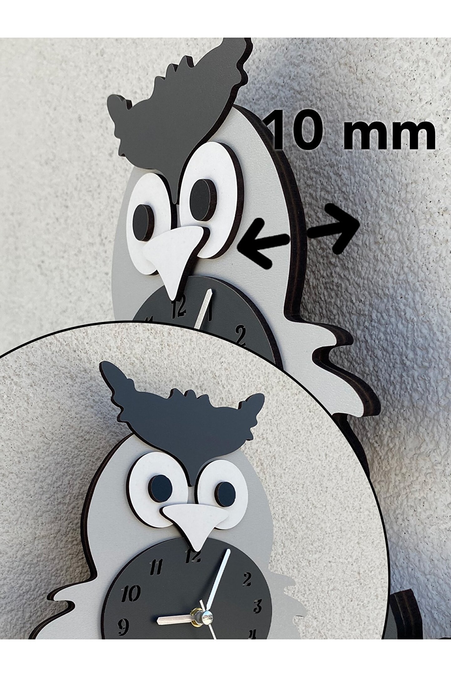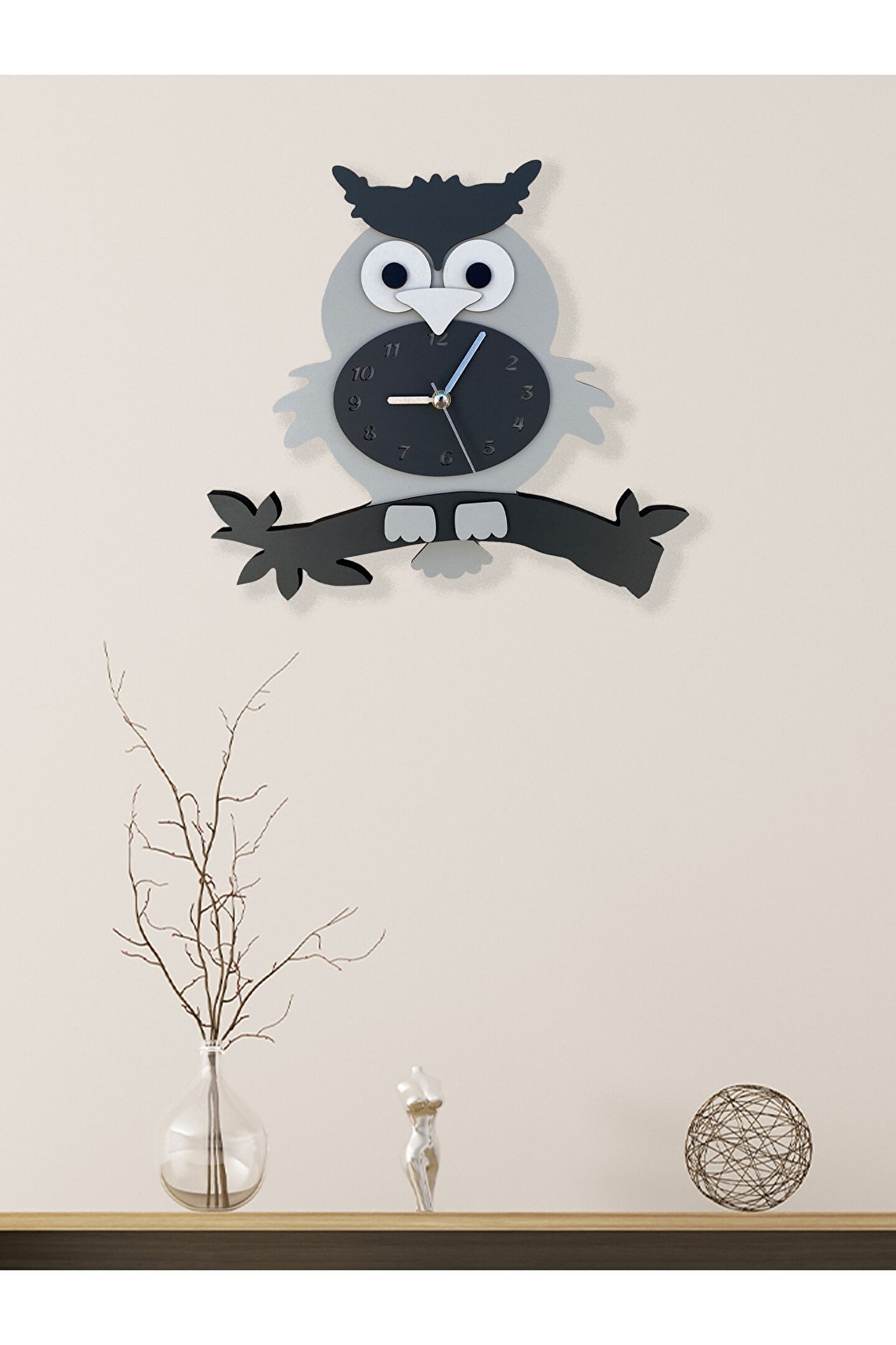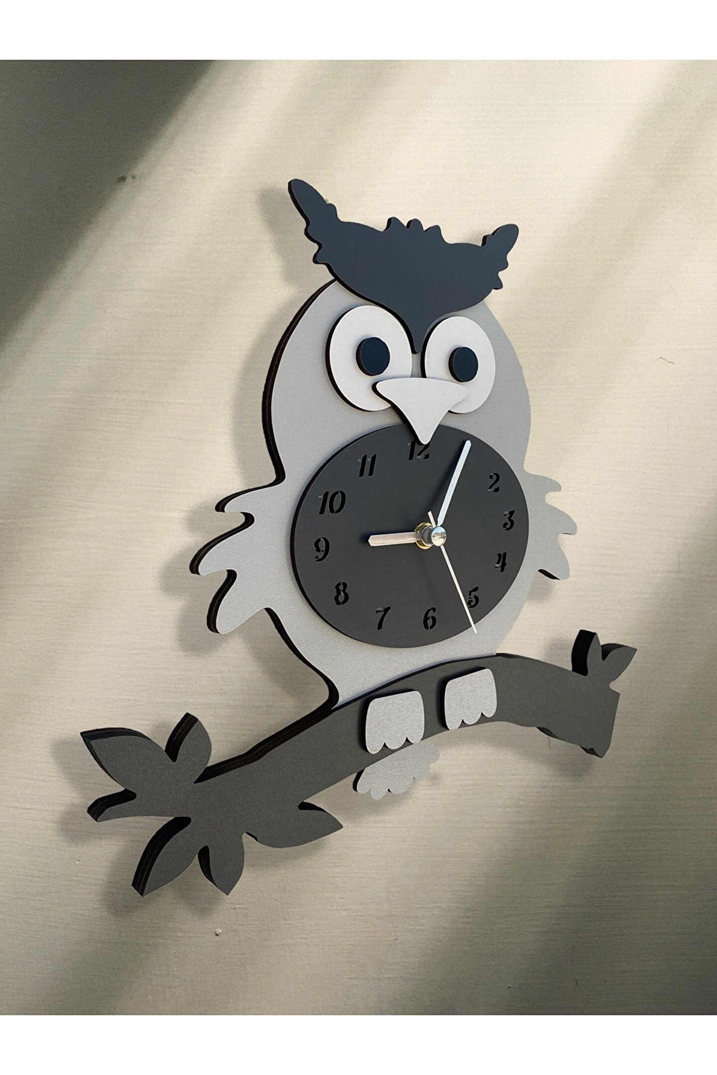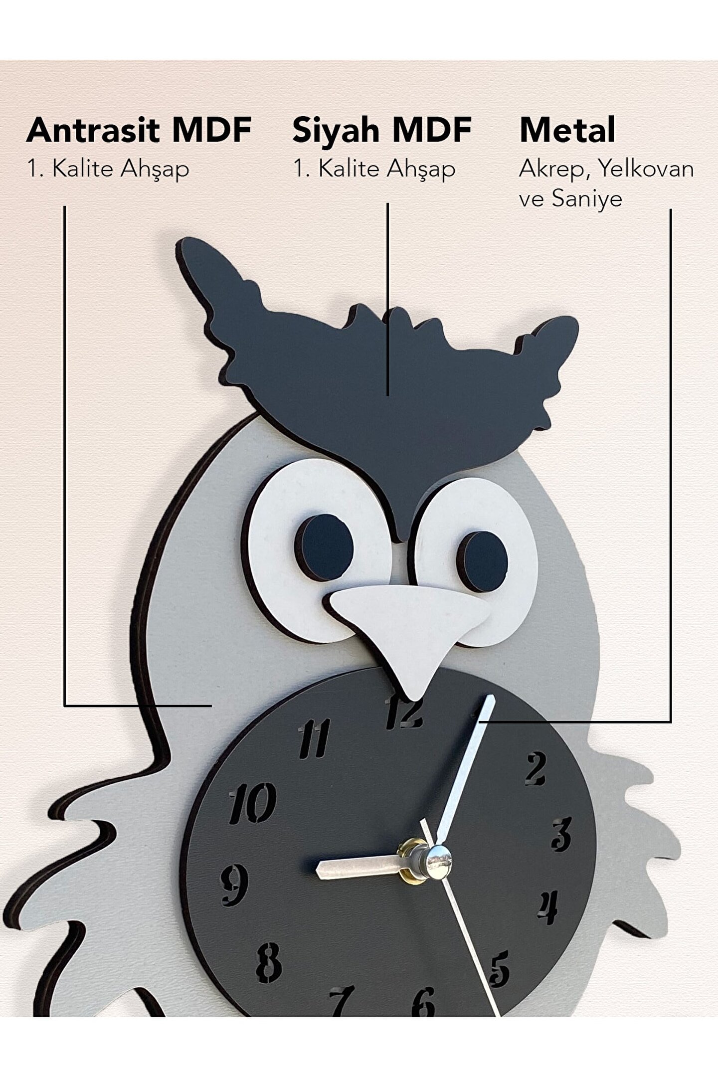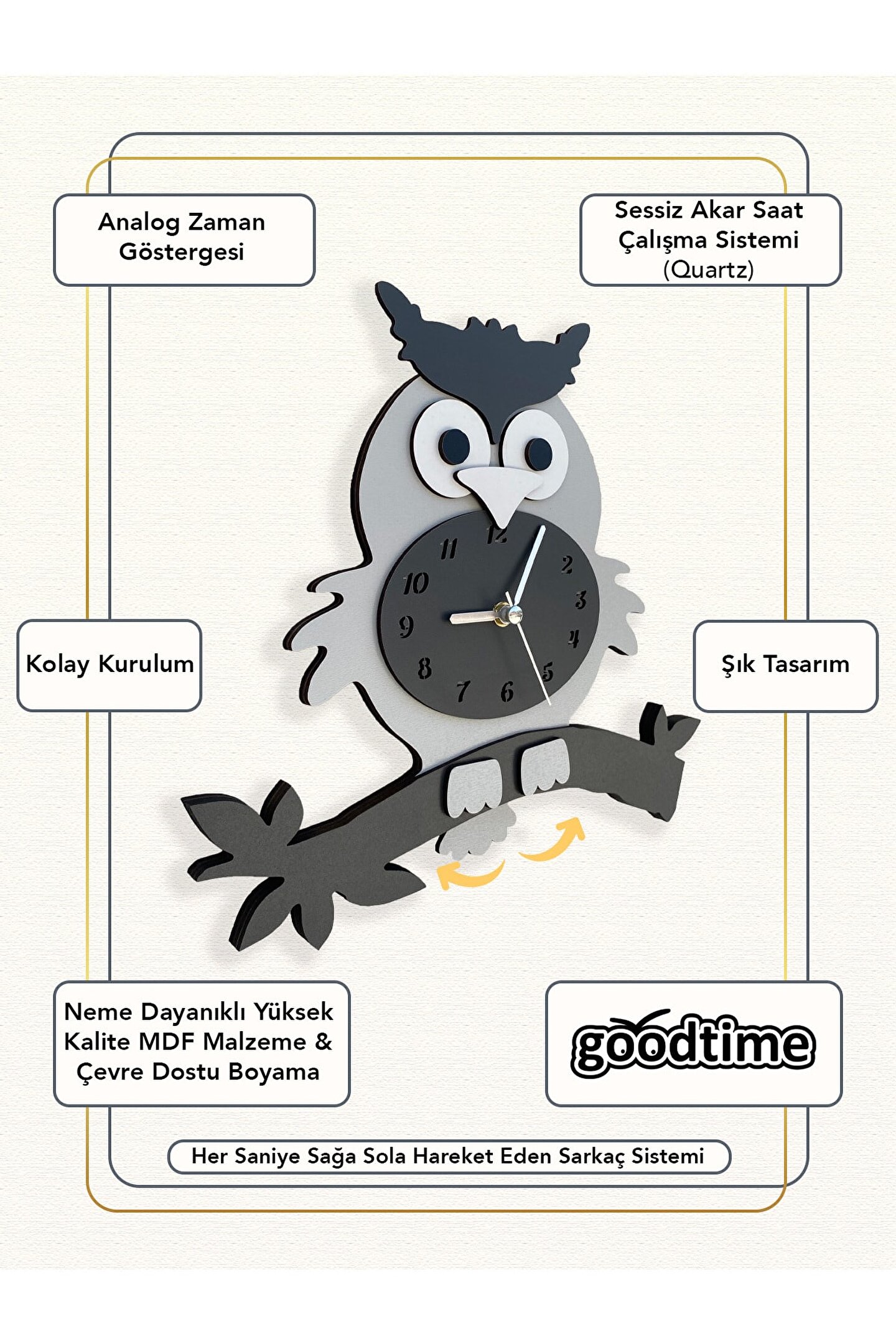 Goodtime Gri Baykuş Sarkaçlı Dekoratif Duvar Saati ; Ürün özellikleri: ; - 1. Kalite Ahşap Mdf Malzemeden üretilmiştir. ; - Ürün tamamen el yapımı (hand made) ve elboyaması ile üretilmektedir. ; - 2 adet AA pil ile çalışır. ; - 1 adet pil, saati çalıştırır; diğer pil sarkacıhareket ettirir. ; - Her saniyede “ Kuyruk ” sağa solahareket eder. ; - Mekanizması yüksek kaliteli sessiz (quartz)çalışan akar saattir. ; - Saat üzerindeki akrep, yelkovan ve saniyemetal malzemedir. ; - Montaj şekli: Duvar çivisi ; - Montaja hazır özel askı aparatı ile bir çiviveya vidayla duvara kolayca sabitleyebilirsiniz ; -Mutfak, oturma odası,çocuk odası,salon ve özel günlerinizde hediye olarak tercih edebileceğiniz dekoratif duvar saatidir. ; ; Ürün ebatları: ; Yükseklik: 25 cm ; Genişlik: 29 cm ; Derinlik: 6 cm ; Mdf Kalınlığı: 3,3 cm ; ;
