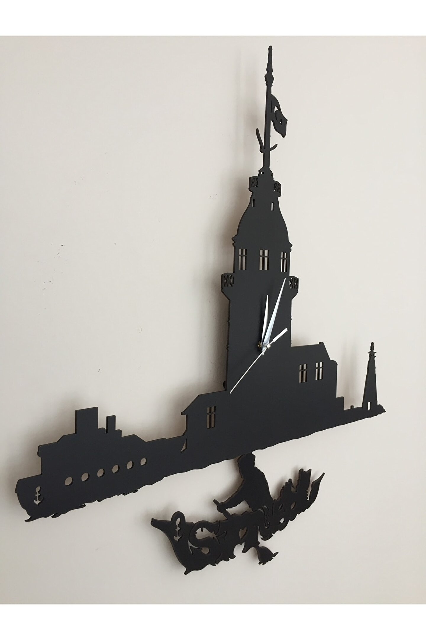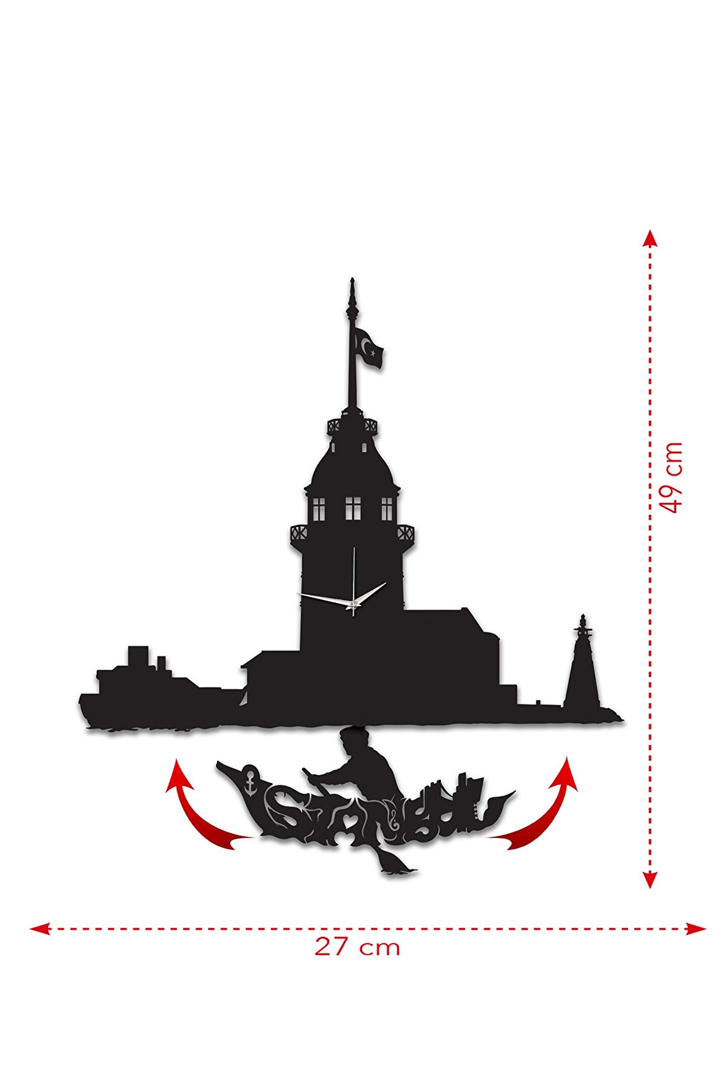 ; Goodtime Kız Kulesi Dekoratif Sarkaçlı Duvar Saati ; Lütfen taklitlerden kaçınınız. Saatin markası "goodtime" dır. ; Ürün özellikleri: ; - 1. Kalite Ahşap Mdf Malzemedenüretilmiştir. ; - Ürün tamamen el yapımıdır. (handmade) ; - 2 adet AA pil ile çalışır.- 1 adet pil, saati çalıştırır; diğer pilsarkacı hareket ettirir. ; - Her saniyede “İstanbul yazılı kayık”sağa sola hareket eder. ; - Mekanizması yüksek kaliteli sessiz(quartz) çalışan akar saattir. ; - Saat üzerindeki akrep, yelkovan vesaniye metal malzemedir. ; - Montaj şekli: Duvar çivisi ; - Montaja hazır özel askı aparatı ile birçivi veya vidayla duvara kolayca sabitleyebilirsiniz. ; -Mutfak, oturma odası,çocuk odası,salon ve özel günlerinizde hediye olarak tercih edebileceğiniz dekoratif duvar saatidir. ; Ürün ebatları: ; Sarkaç Dahil Yükseklik: 49 cm ; Genişlik : 27 cm ; Derinlik : 4 cm ; Mdf Kalınlığı: 3 mm ;