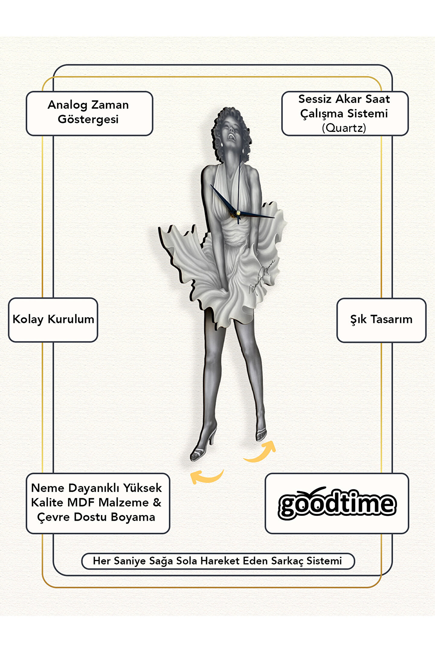 50 x 24 cm boyutlarındaki bu şık duvar saati, mekanınıza zarif bir dokunuş katıyor.; ; Geleneksel tema ve stil anlayışıyla tasarlanmış, zamansız bir dekoratif obje olarak öne çıkıyor.; ; Nötr renk paletiyle her türlü dekorasyona uyum sağlayarak evinizin atmosferini zenginleştiriyor.; ; Beyaz web rengi, saatin modern ve minimalist çizgilerini vurgulayarak dikkat çekici bir kontrast oluşturuyor.; ; Dayanıklı ahşap materyali sayesinde uzun ömürlü kullanım sunarken, aynı zamanda doğal bir estetik sağlıyor.