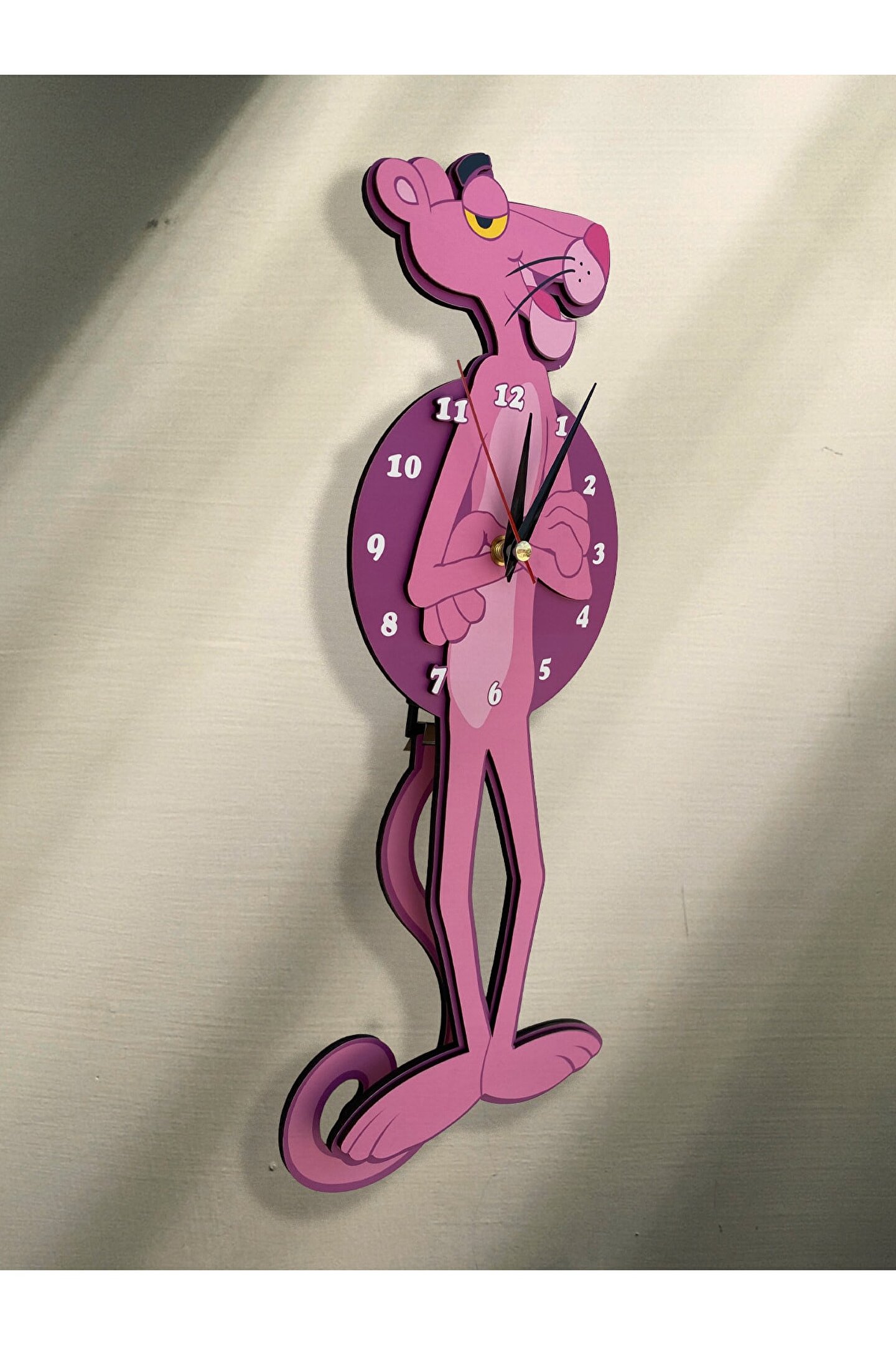 Goodtime Pembe Panter Dekoratif Duvar Saati ; ; Lütfen taklitlerden kaçınınız. Saatin markası "goodtime" dır. ; ; ; Ürün özellikleri: ; - 1. Kalite Ahşap Mdf Malzemeden üretilmiştir. ; - Ürün tamamen el yapımı (hand made) olup,yüksek kaliteli baskı ile üretilmektedir. ; - 2 adet AA pil ile çalışır.- 1 adet pil, saati çalıştırır; diğer pil sarkacıhareket ettirir. ; - Her saniyede “ Kuyruk ” sağa solahareket eder. ; - Mekanizması yüksek kaliteli sessiz (quartz)çalışan akar saattir. ; - Saat üzerindeki akrep, yelkovan ve saniyemetal malzemedir. ; - Montaj şekli: Duvar çivisi ; - Montaja hazır özel askı aparatı ile bir çiviveya vidayla duvara kolayca sabitleyebilirsiniz. ; -Mutfak, oturma odası,çocuk odası,salon ve özel günlerinizde hediye olarak tercih edebileceğiniz dekoratif duvar saatidir. ; Ürün ebatları: ; Sarkaç Dahil Yükseklik: 40 cm ; Genişlik : 14 cm ; Derinlik : 4 cm ; Mdf Kalınlığı: 4 mm ;