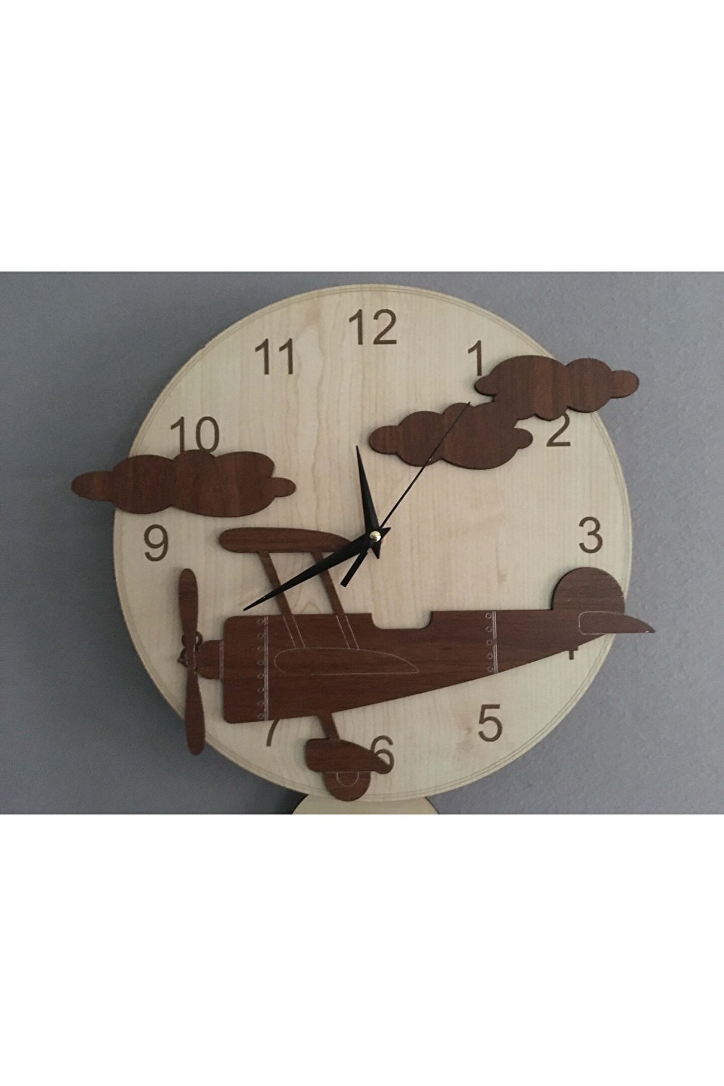 Goodtime Uçak Dekoratif Sarkaçlı Duvar Saati ; Lütfen taklitlerden kaçınınız. Saatin markası "goodtime" dır. ; Ürün özellikleri: ; - 1. Kalite Ahşap Mdf Malzemeden üretilmiştir. ; - Ürün tamamen el yapımıdır. (hand made) ; - 2 adet AA pil ile çalışır. ; - 1 adet pil, saati çalıştırır; diğer pil sarkacıhareket ettirir. ; - Her saniyede “Paraşüt” sağa sola hareketeder. ; - Mekanizması yüksek kaliteli sessiz (quartz)çalışan akar saattir. ; - Saat üzerindeki akrep, yelkovan ve saniyemetal malzemedir. ; - Montaj şekli: Duvar çivisi ; - Montaja hazır özel askı aparatı ile bir çiviveya vidayla duvara kolayca sabitleyebilirsiniz. ; -Mutfak, oturma odası,çocuk odası,salon ve özel günlerinizde hediye olarak tercih edebileceğiniz dekoratif duvar saatidir. ; Ürün ebatları: ; Sarkaç Dahil Yükseklik: 45 cm ; Genişlik : 32 cm ; Derinlik : 4 cm ; Mdf Kalınlığı: 4 mm ;