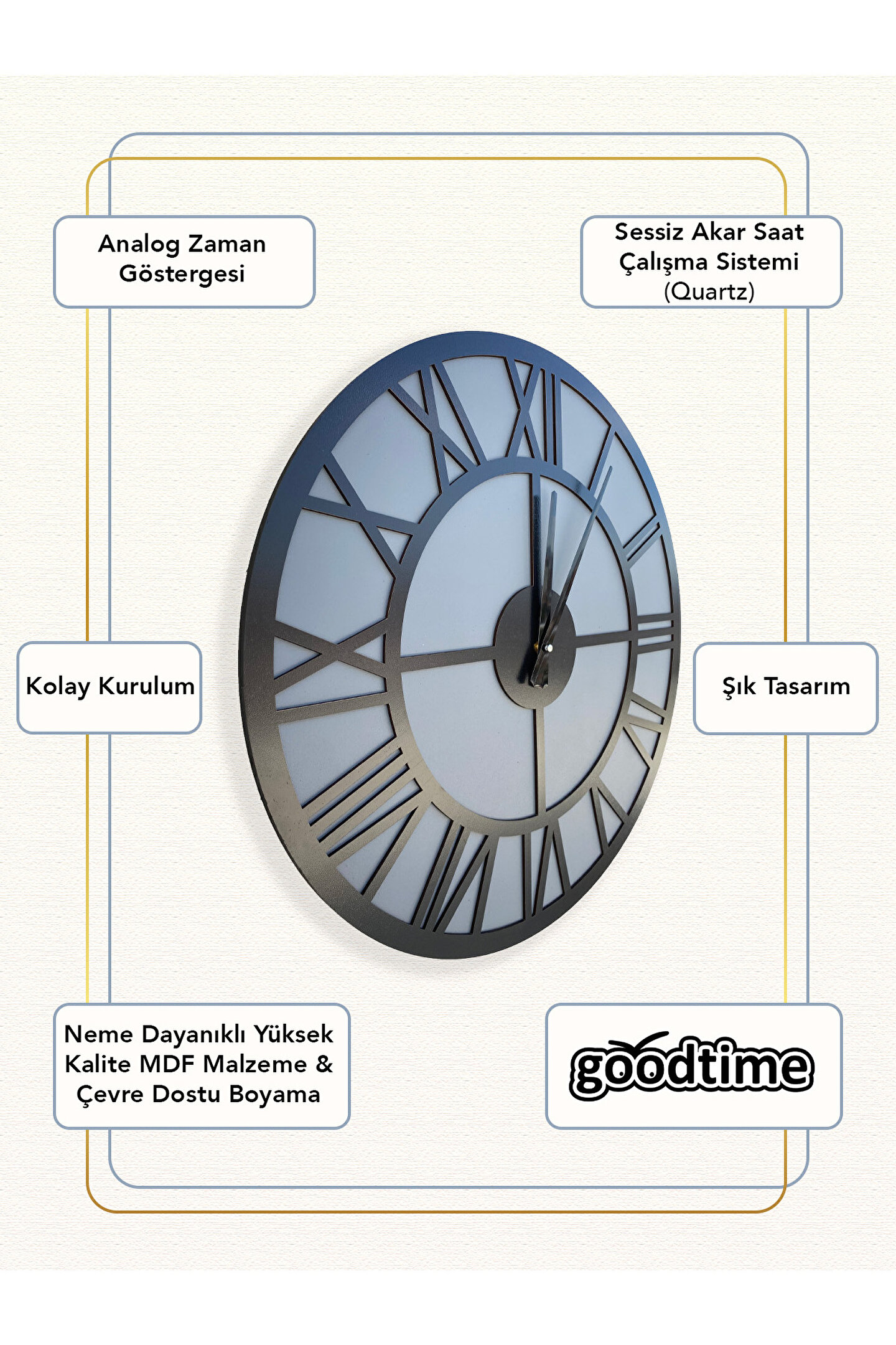 Goodtime Yuvarlak Gümüş Dekoratif Duvar Saati ; Ürün özellikleri: ; - 1. Kalite Ahşap Mdf Malzemeden üretilmiştir. ; - Ürün tamamen el yapımı (hand made) ve elboyaması ile üretilmektedir. ; - 1 adet AA pil ile çalışır. ; - Mekanizması yüksek kaliteli sessiz (quartz)çalışan akar saattir. ; - Saat üzerindeki akrep ve yelkovan metalmalzemedir ; - Montaj şekli: Duvar çivisi ; - Montaja hazır özel askı aparatı ile bir çiviveya vidayla duvara kolayca sabitleyebilirsiniz. ; -Mutfak, oturma odası,çocuk odası,salon ve özel günlerinizde hediye olarak tercih edebileceğiniz dekoratif duvar saatidir. ; Ürün ebatları: ; Saat Çapı : 50 cm dir. ; Derinlik : 5 cm ; Mdf Kalınlığı: 7 mm ;