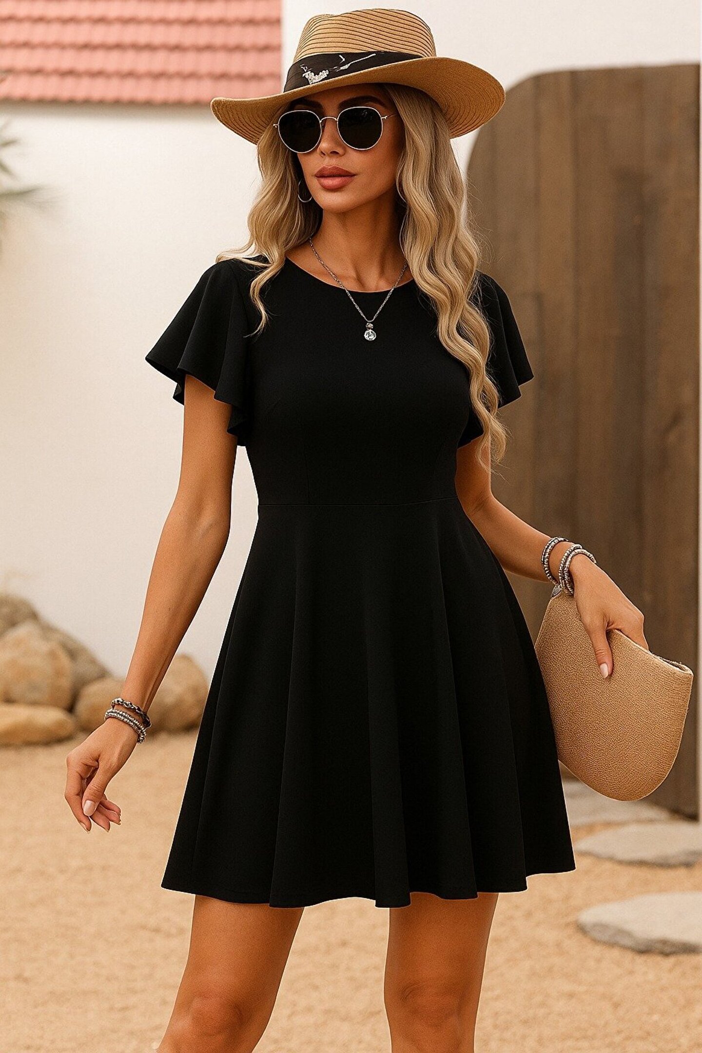 Edolika Kadın Kısa Kelebek Kollu Bisiklet Yaka Janjan Krep Elbise